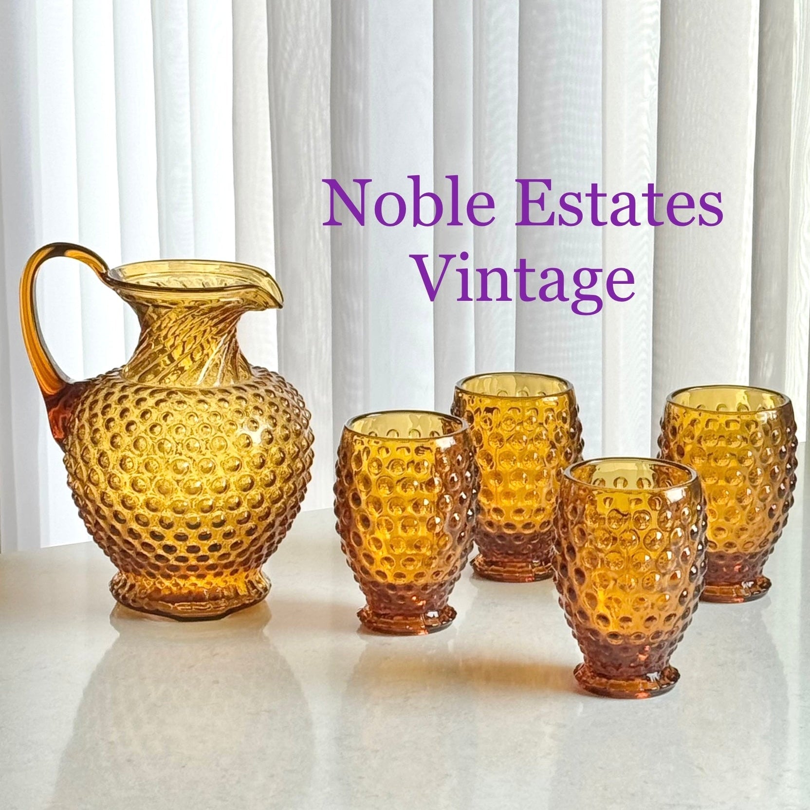 Indiana Glass Tiara Exclusives Amber Gold Hobnail Pitcher and 4 Tumblers (circa 1976)