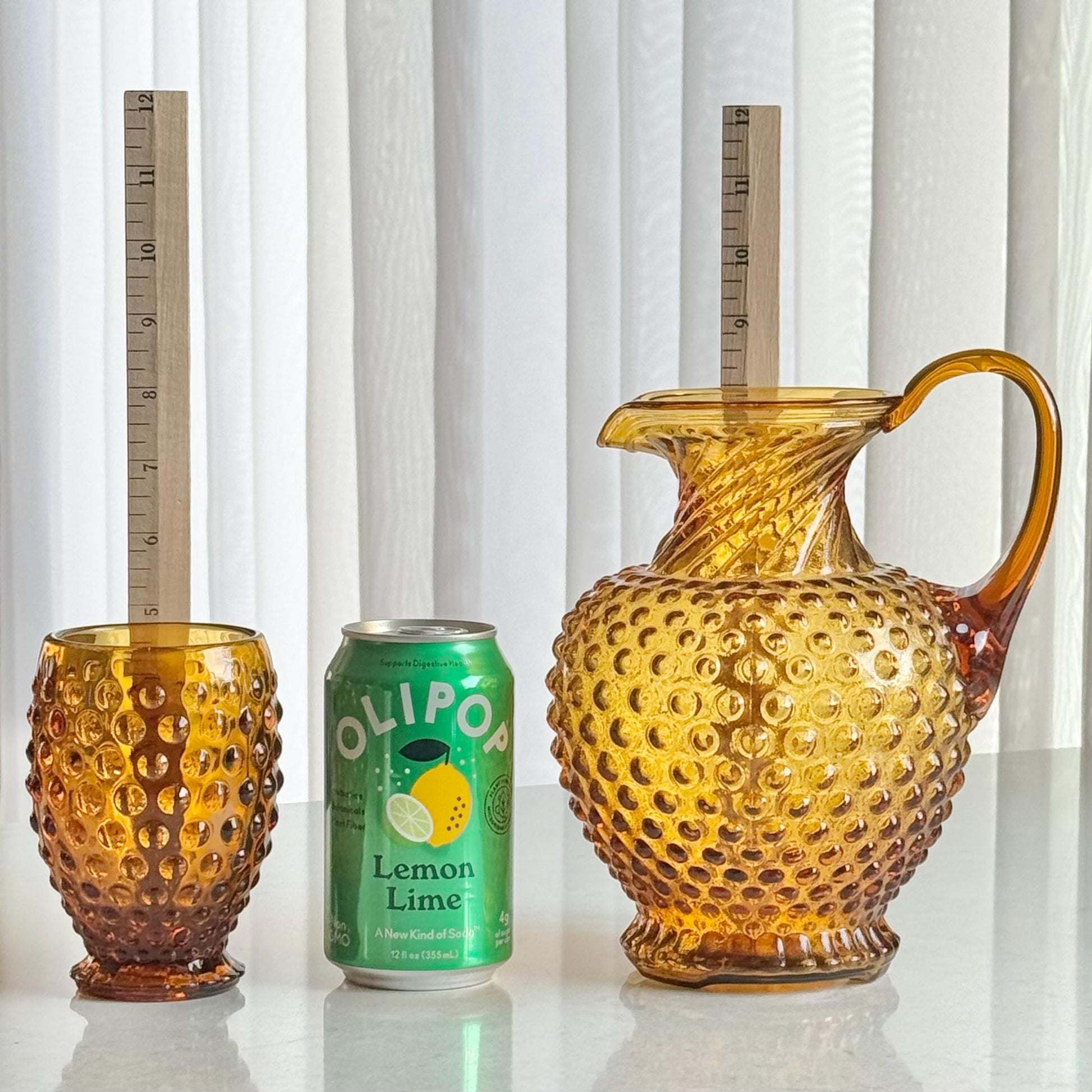 Cool retro pitcher and four tumblers! The pitcher is approximately 8-1/2" tall with a capacity of about 7 cups (56 ounces) completely full. The tumblers are approximately 4-3/4" tall and 2-7/8" across the rim with a capacity of about 11 ounces completely full. This set was purchased in the original box. Excellent vintage condition, with signs of the manufacturing process, such as mold seams and straw lines, an example of which is shown in the last photo. FREE SHIPPING in the continental U.S. included in the price. If you are outside of this area or have a specific shipping request please contact me for options.