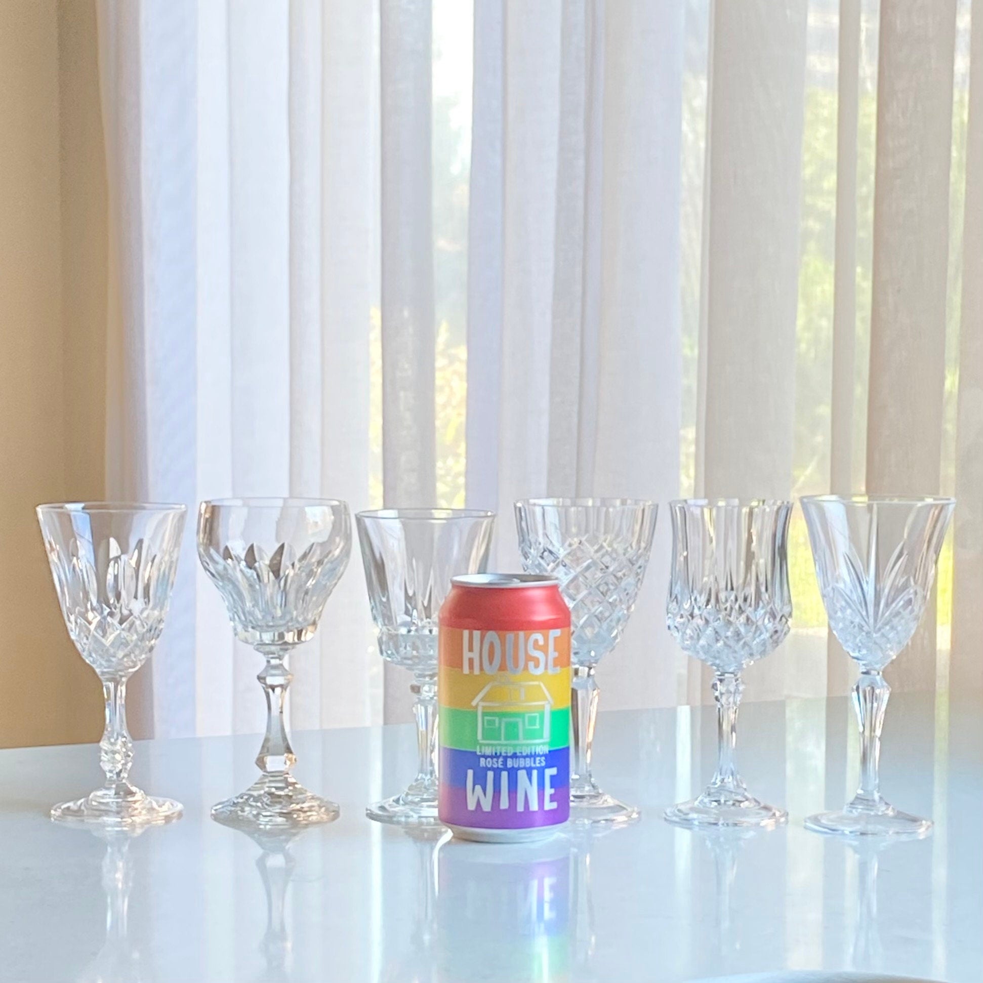 Set of six glasses with various designs and shapes. Perfect for get togethers so everyone can remember which glass is theirs!