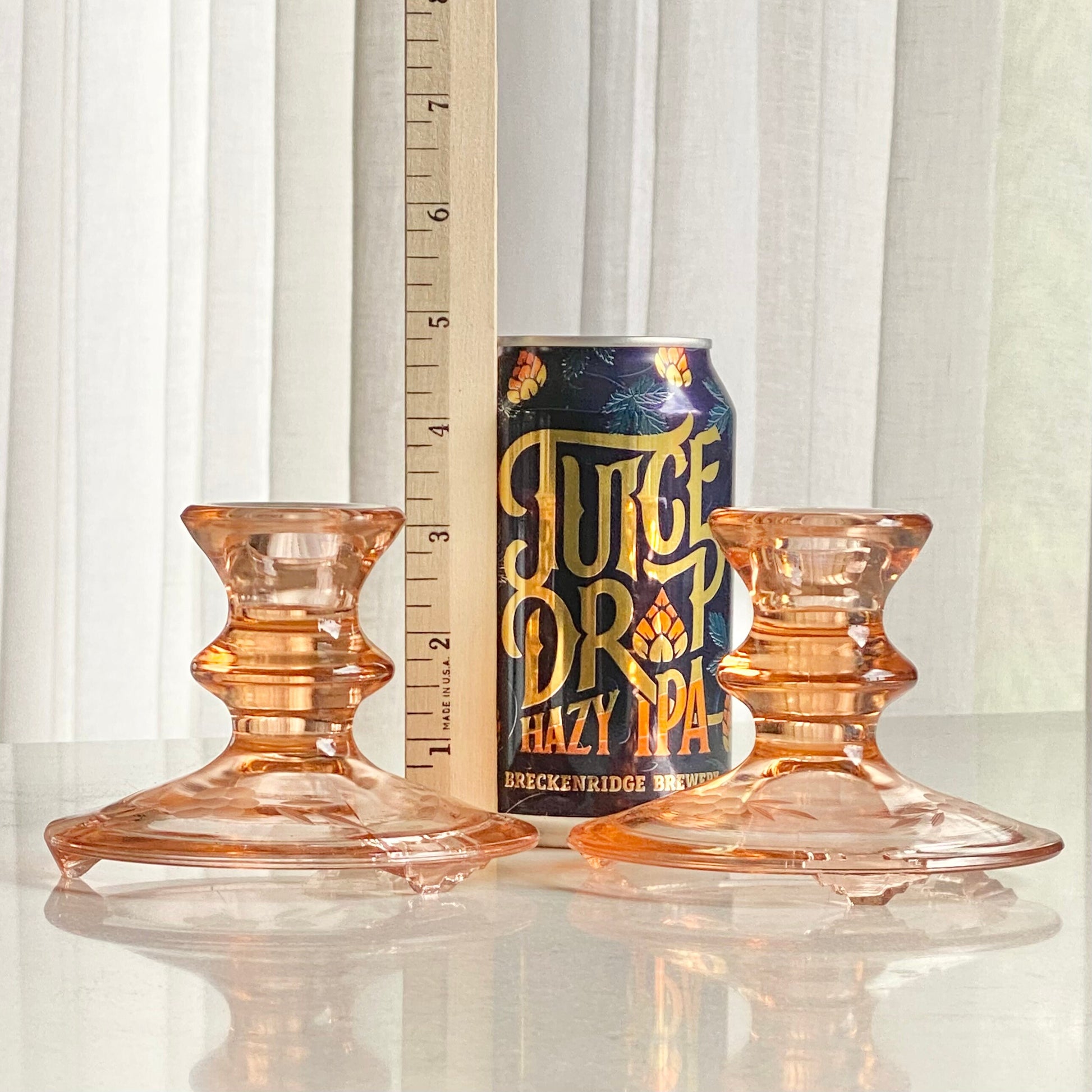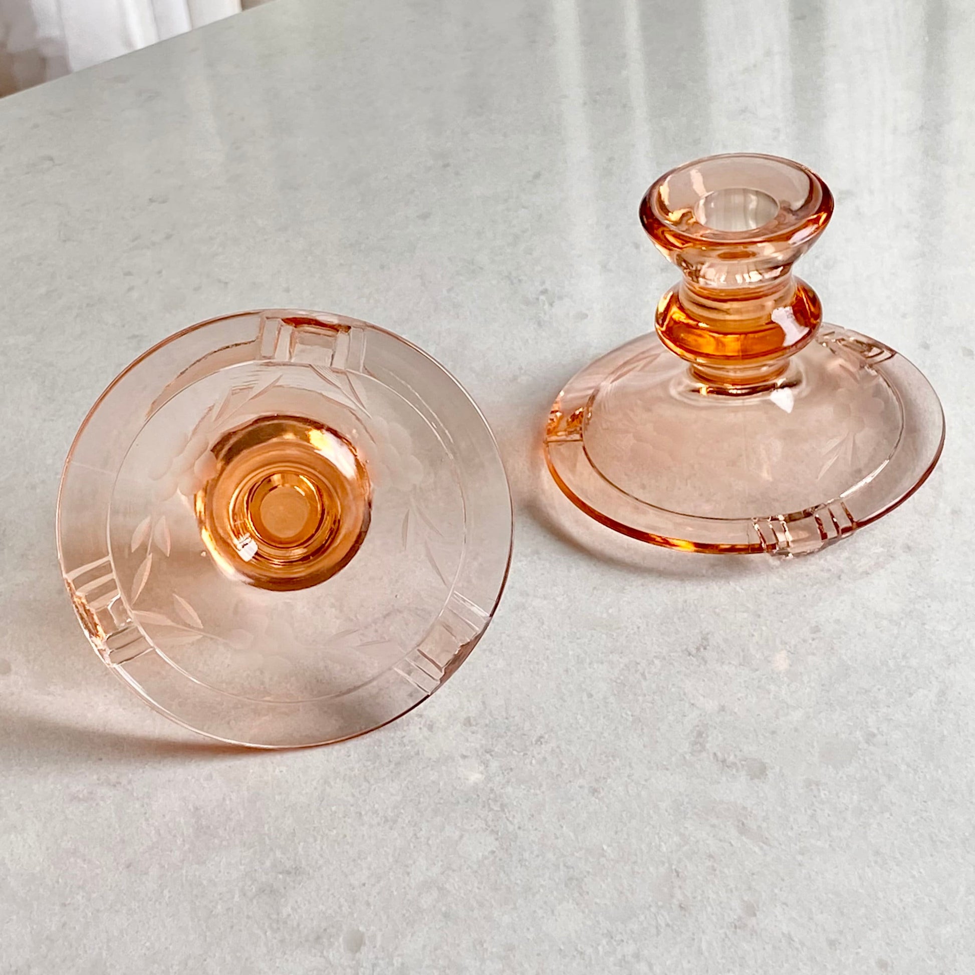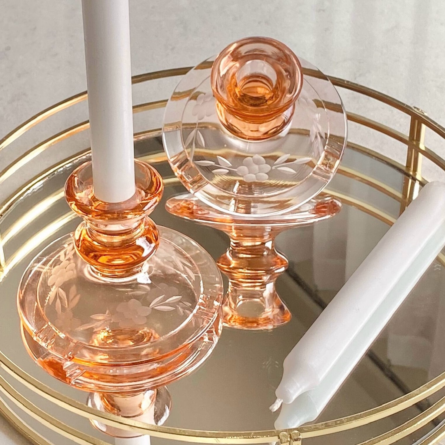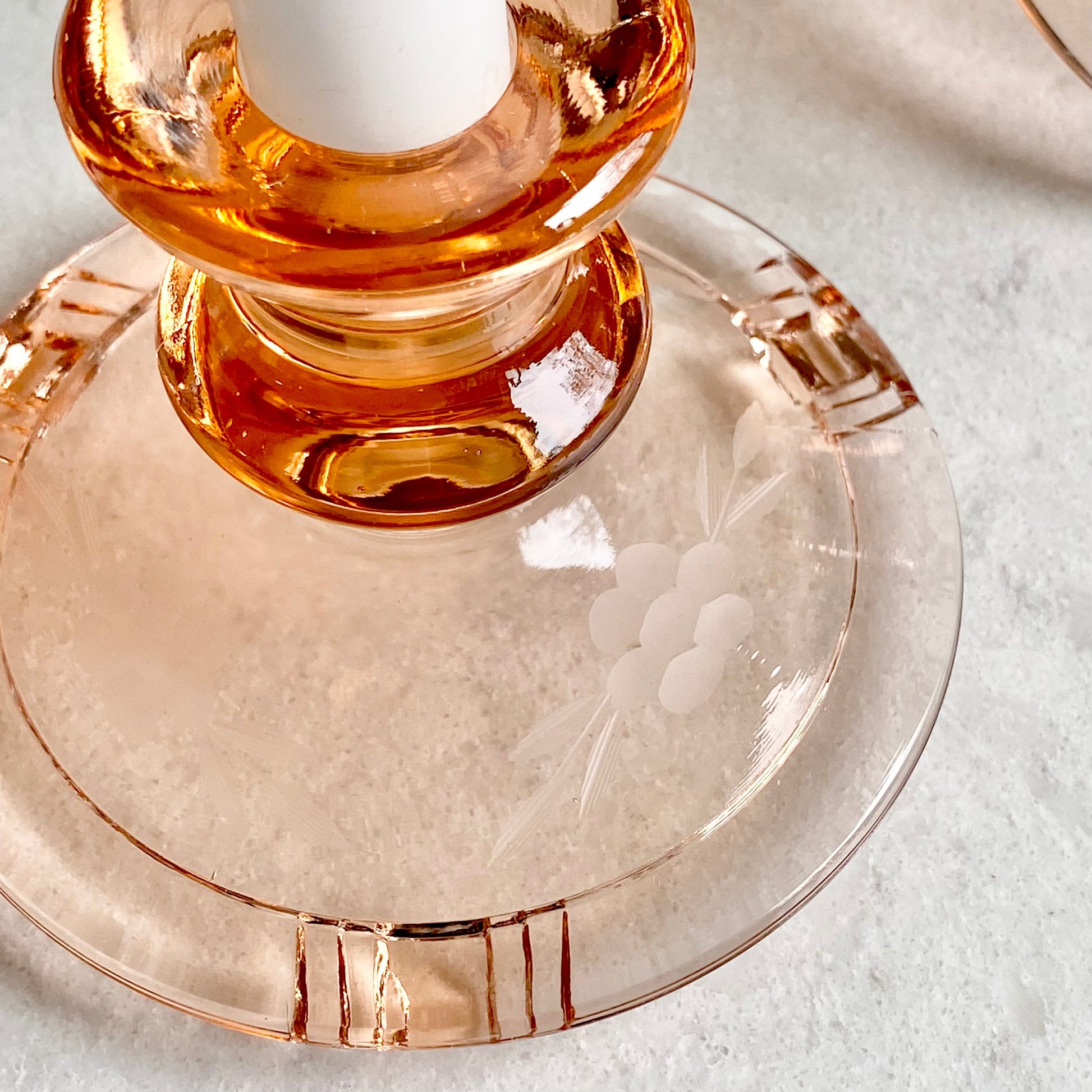 Pair of beautiful etched candle holders with a tri-toe base. The color is very hard to describe. I am calling them as ambler, but they are light in tone and not the traditional orange/gold hue typically called amber.