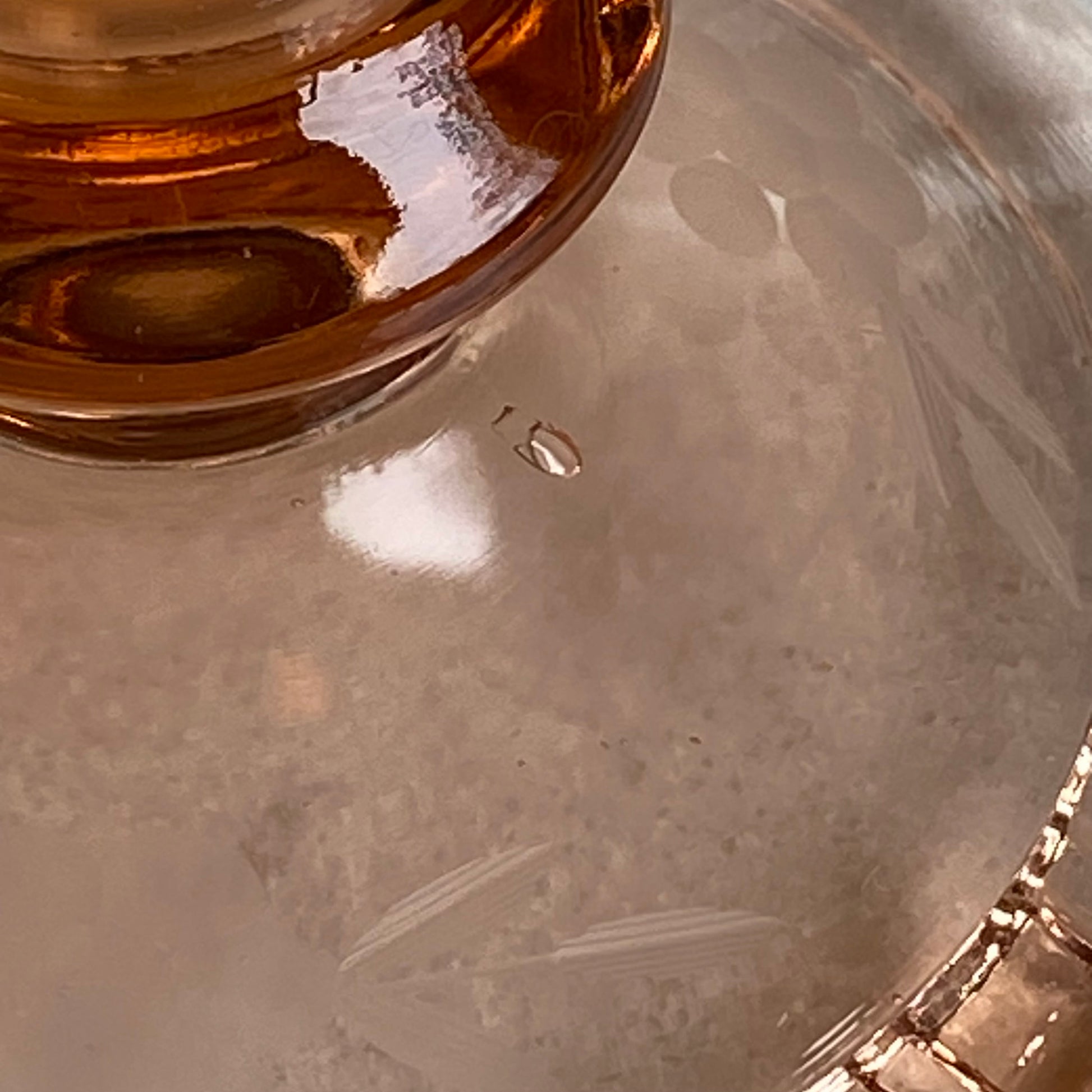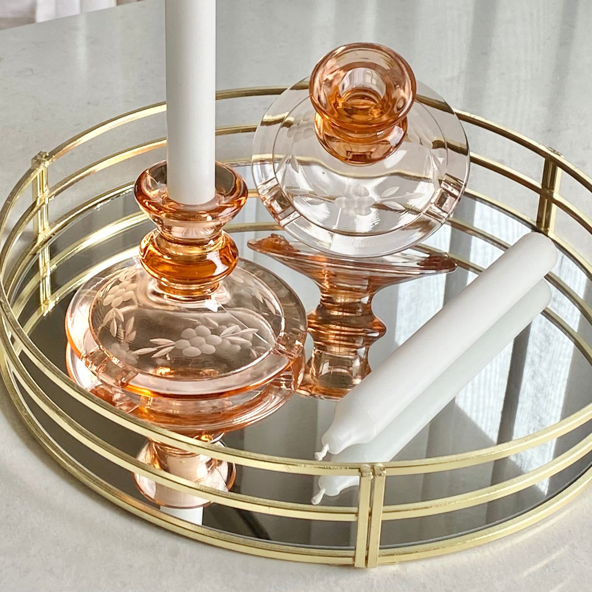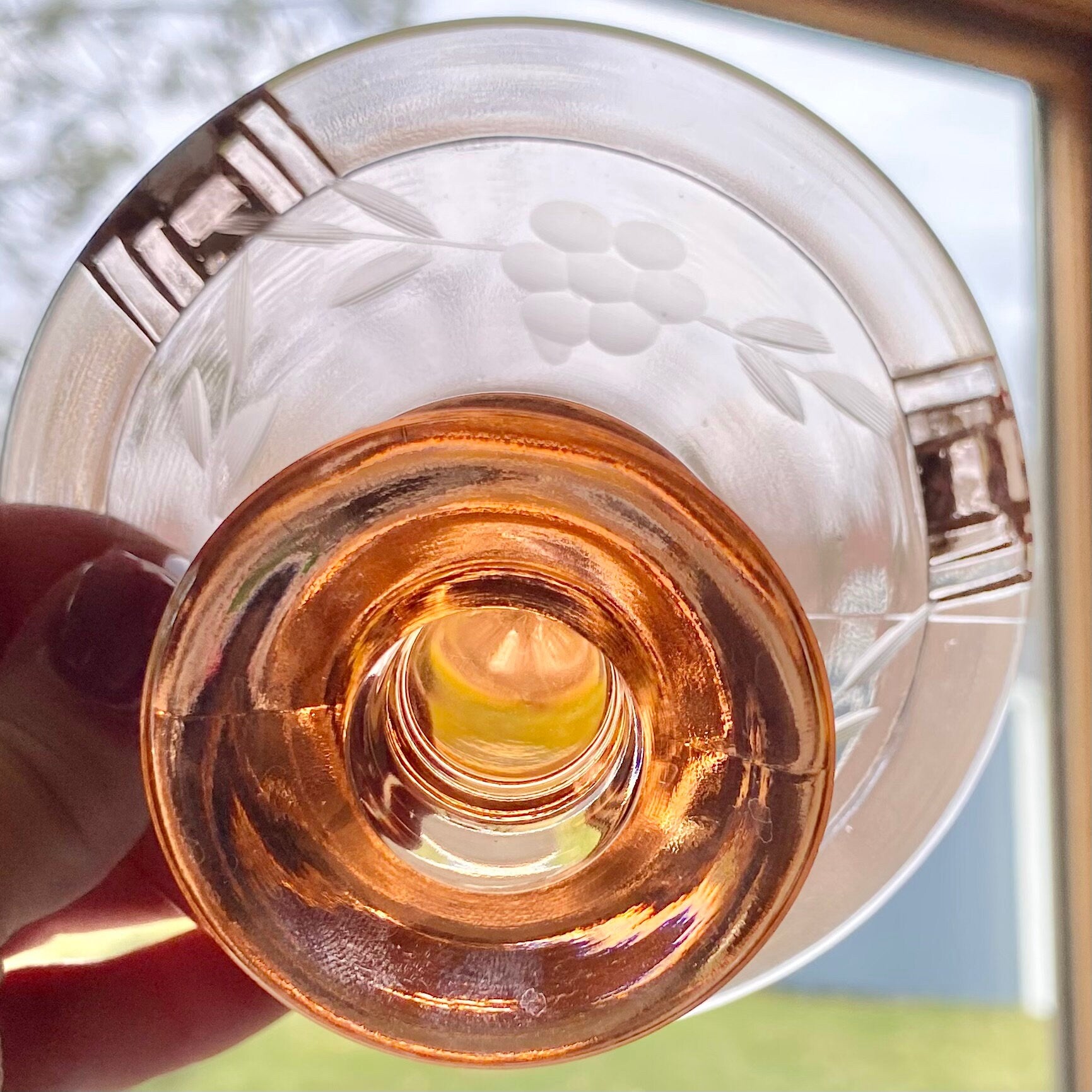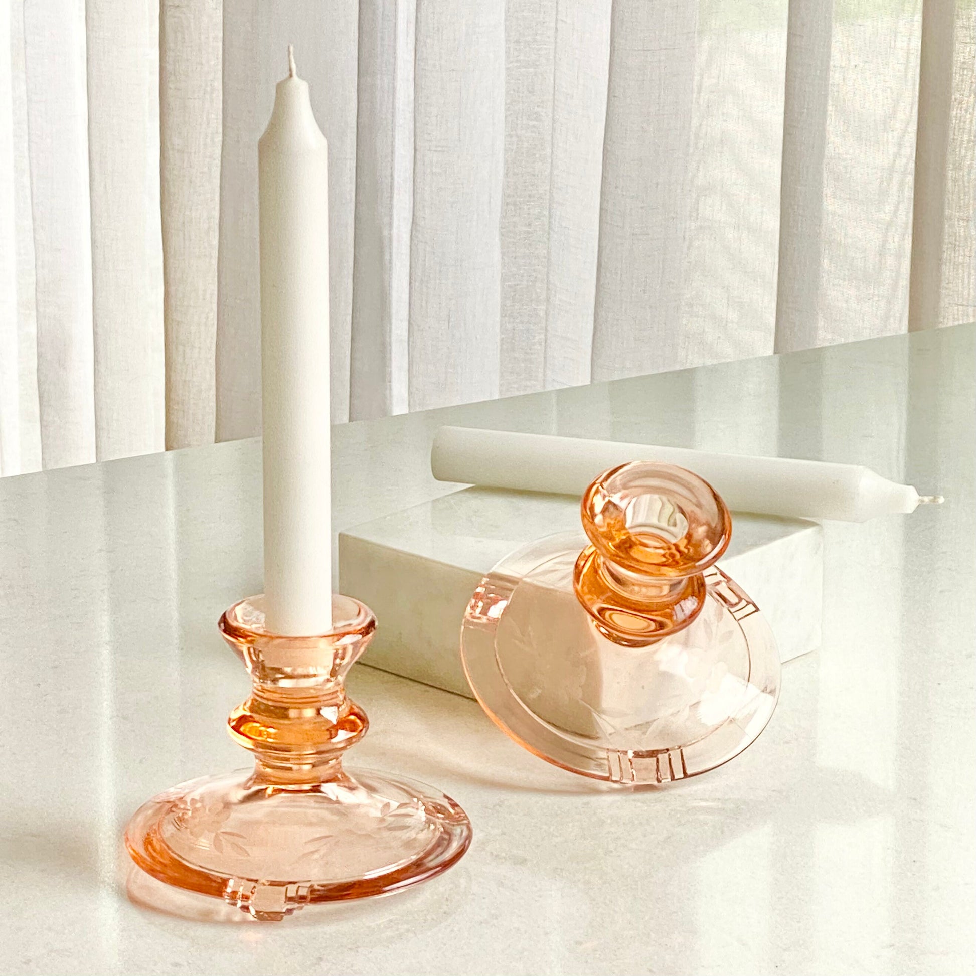 Pair of beautiful etched candle holders with a tri-toe base. The color is very hard to describe. I am calling them as ambler, but they are light in tone and not the traditional orange/gold hue typically called amber.