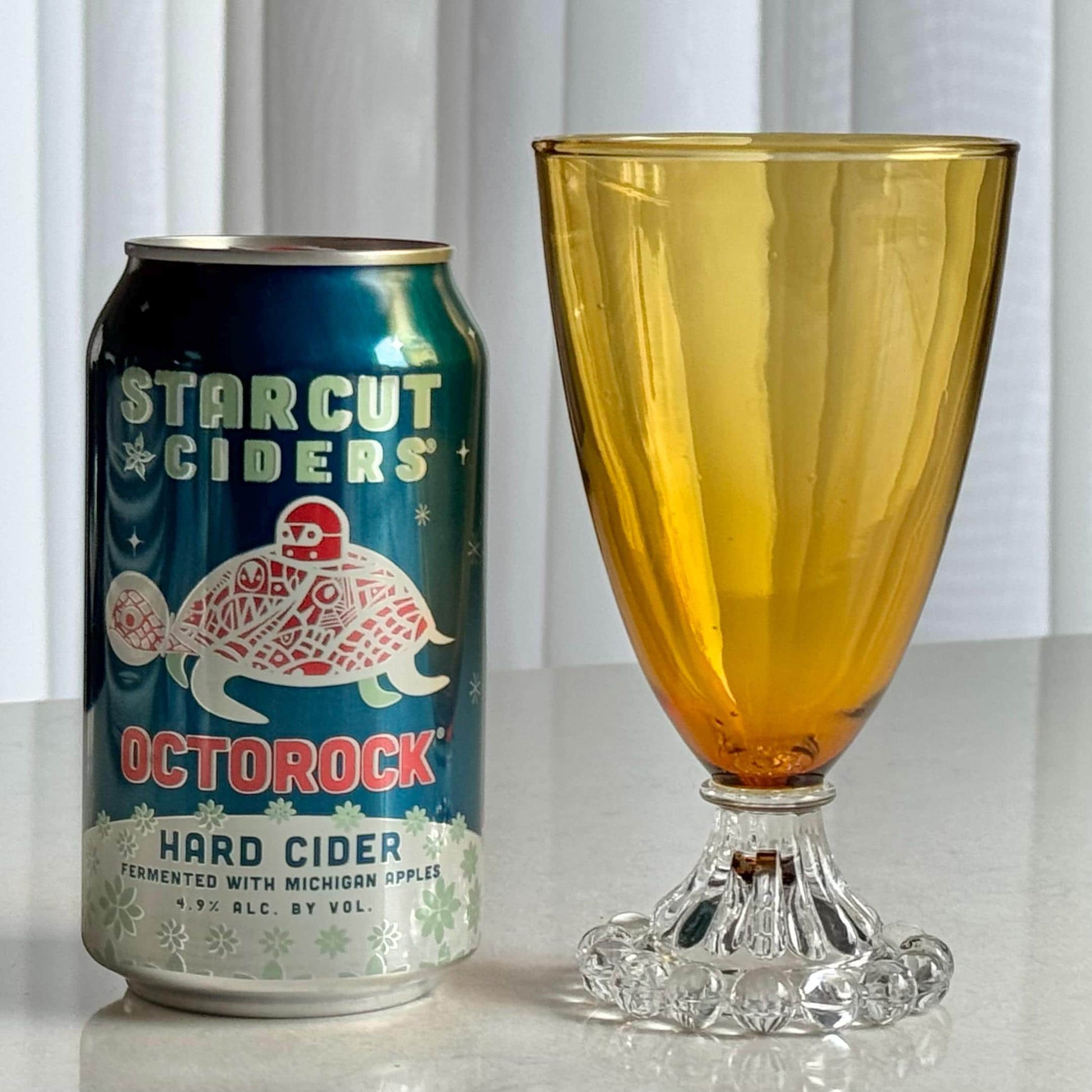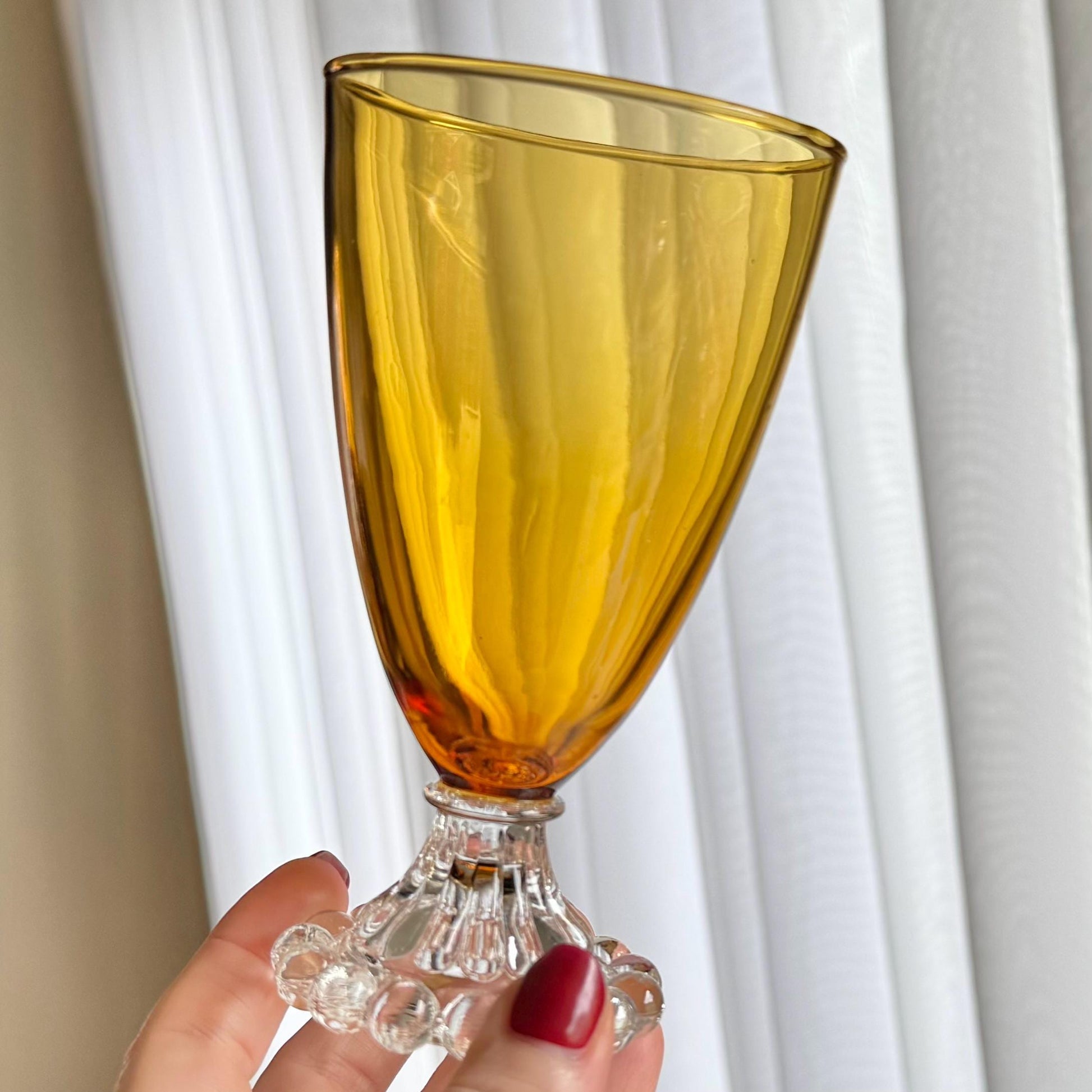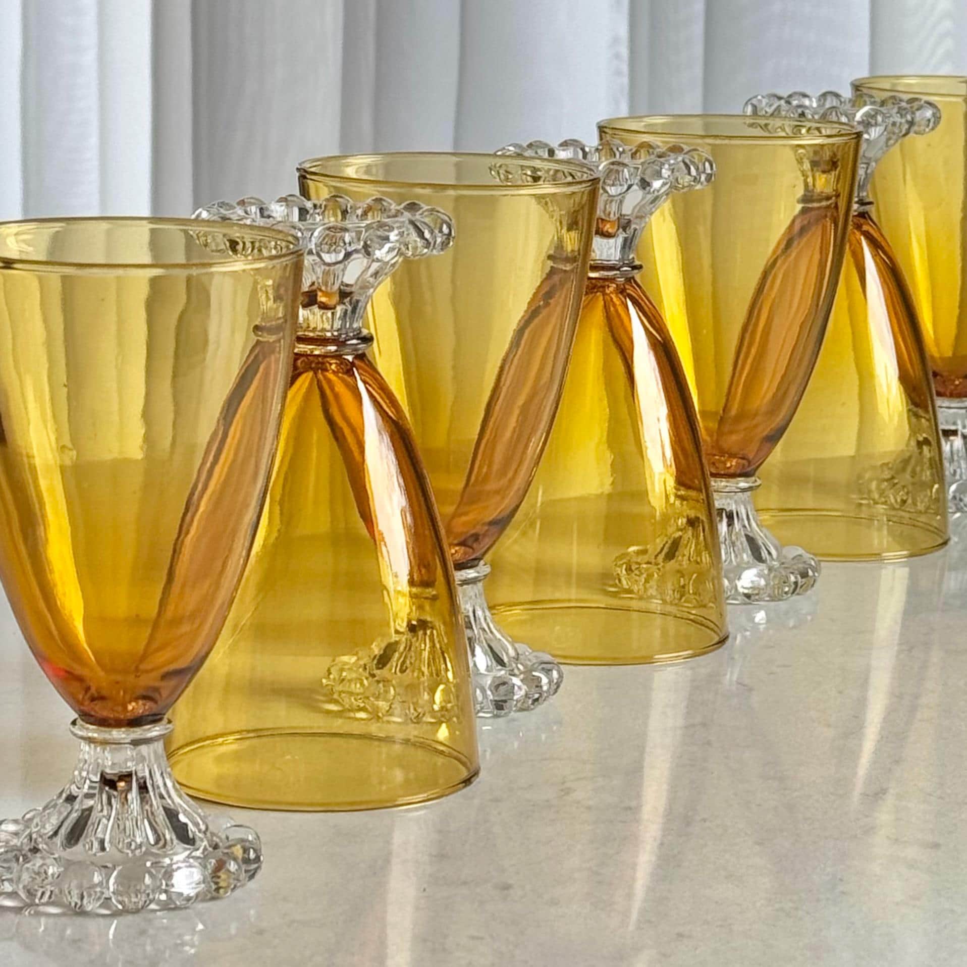 Set of ten glasses with an amber colored bowl and bubble foot base.