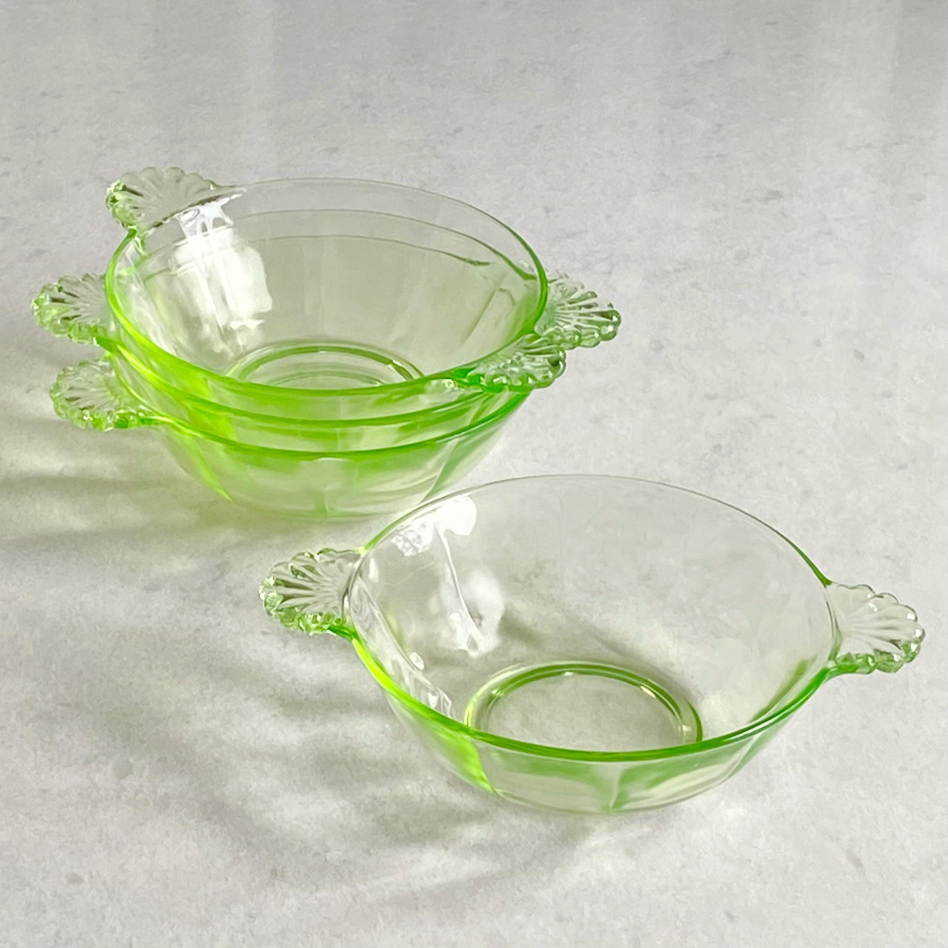Vintage Anchor Hocking Green Uranium Glass Handled Bowls - Set of 4