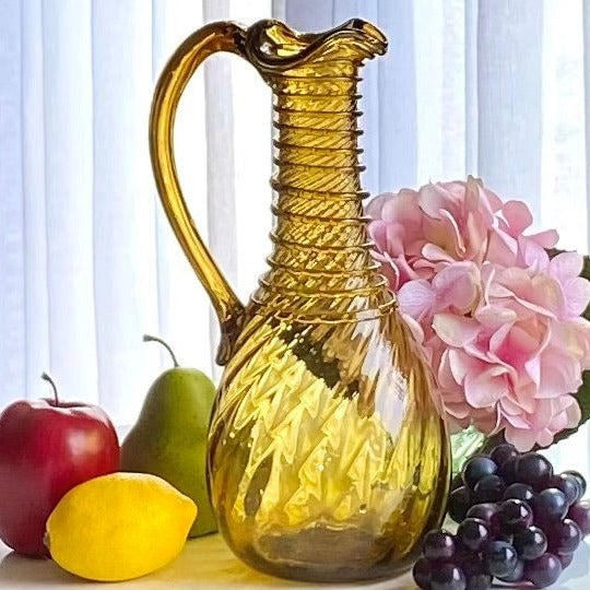 Cool hand blow pitcher with an interesting design! Perfect for serving or just display and enjoy! Approximately 12-1/2" tall and 5-1/2" across the base. Excellent vintage condition, with typical signs of the manufacturing process -- irregularities, air bubbles, pontil mark.
