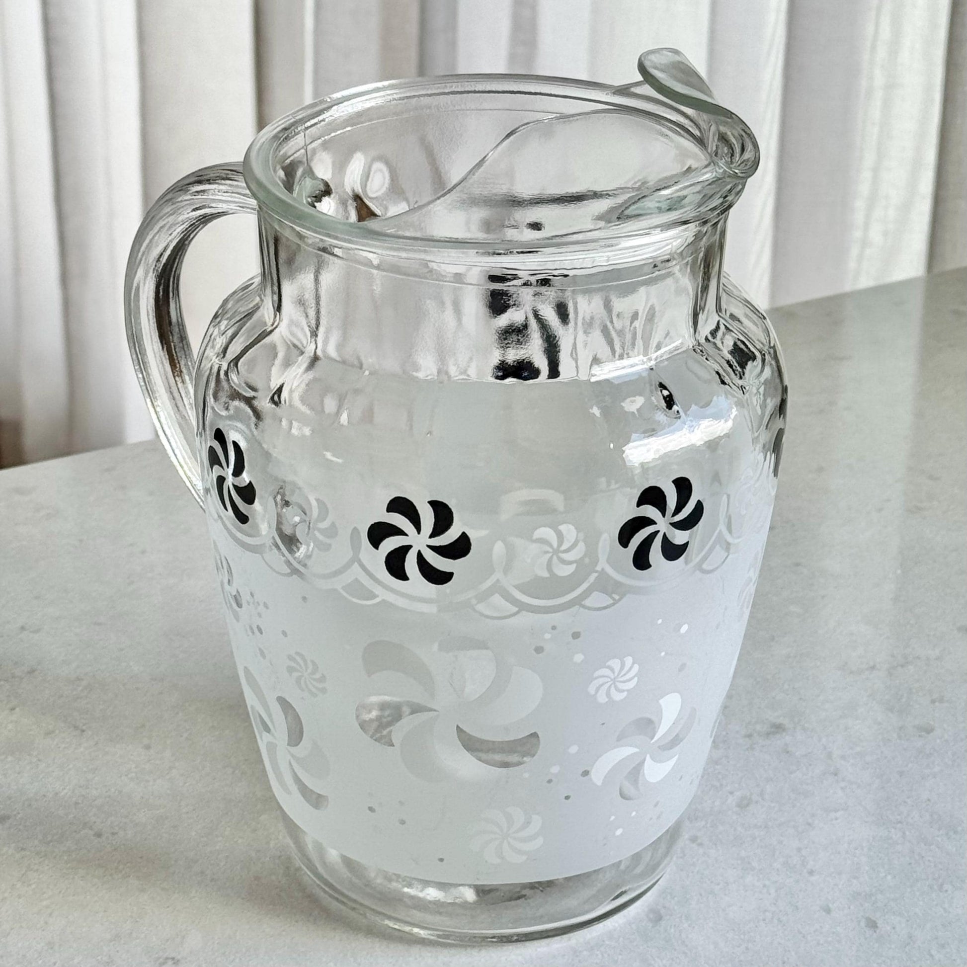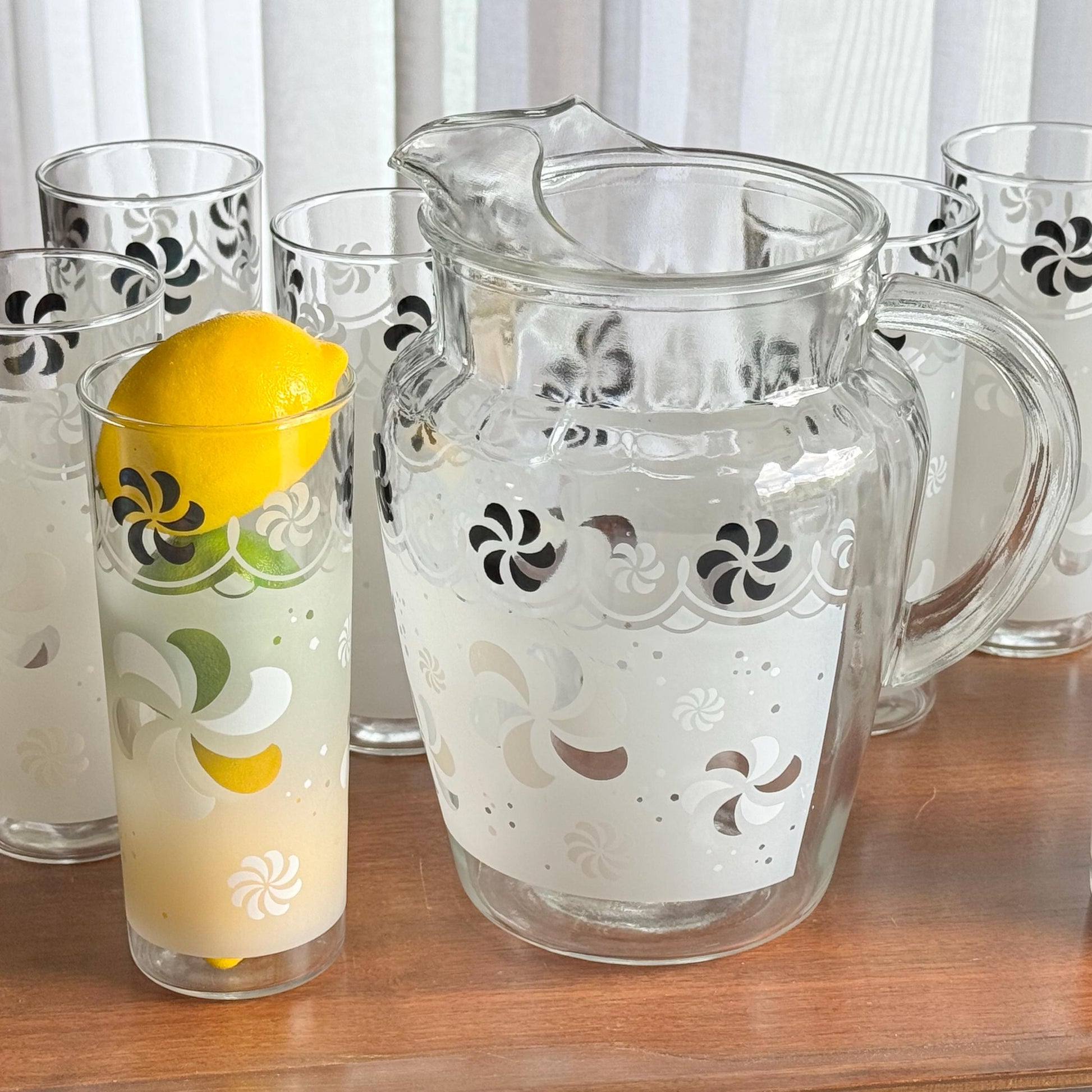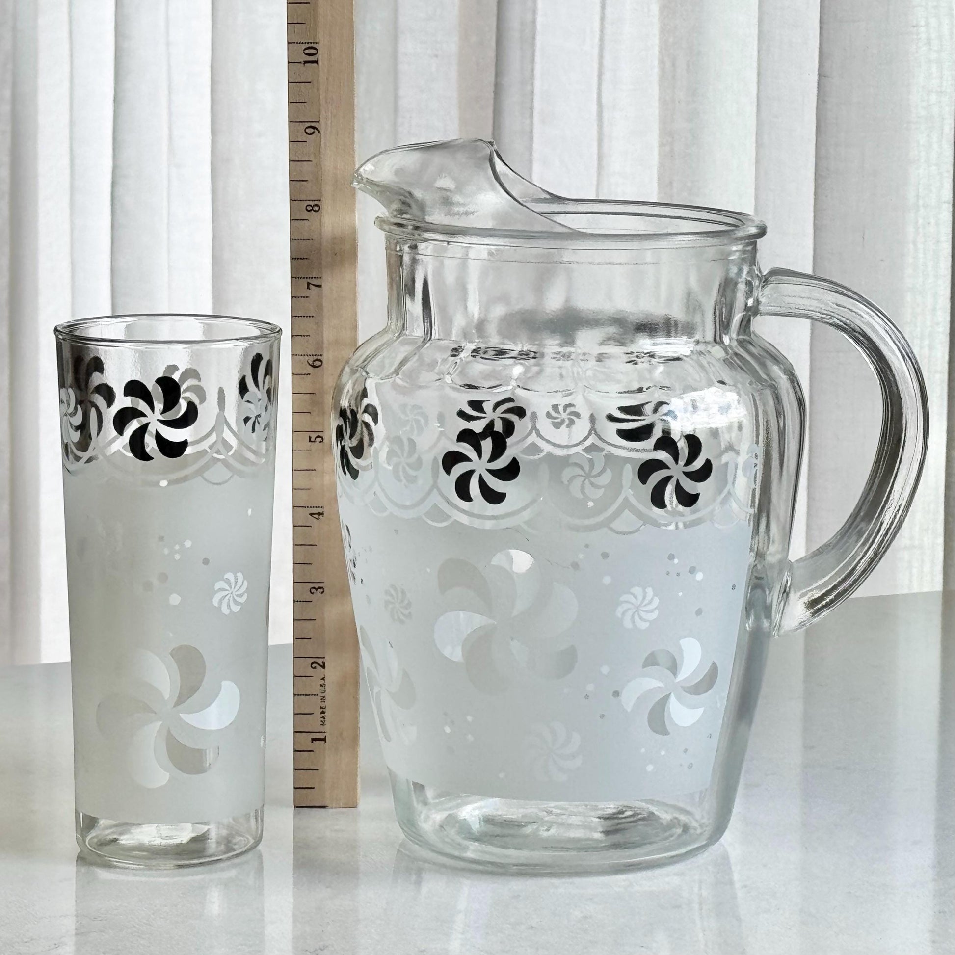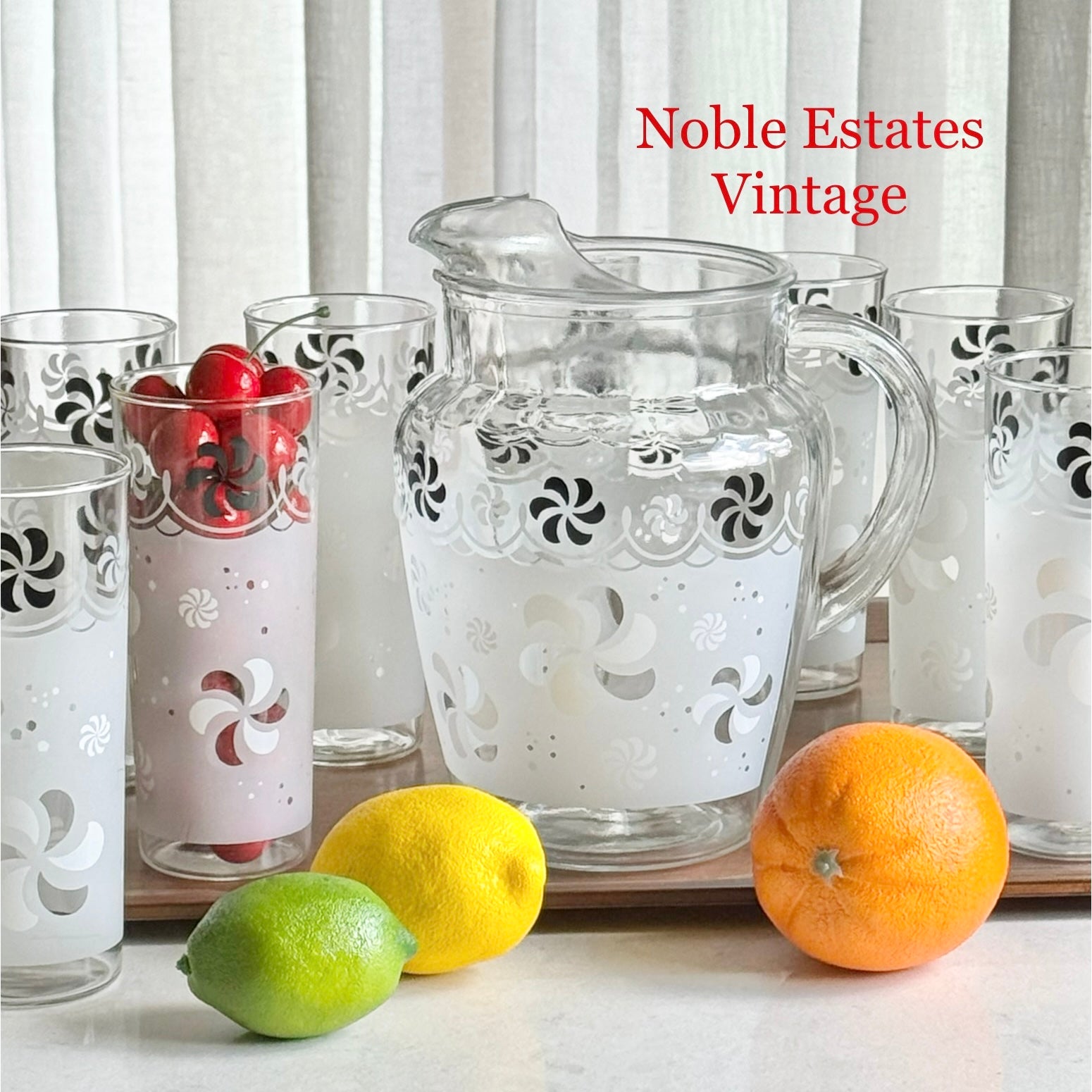 Vintage Black and White Pinwheel Pitcher and Ten (10) Glasses