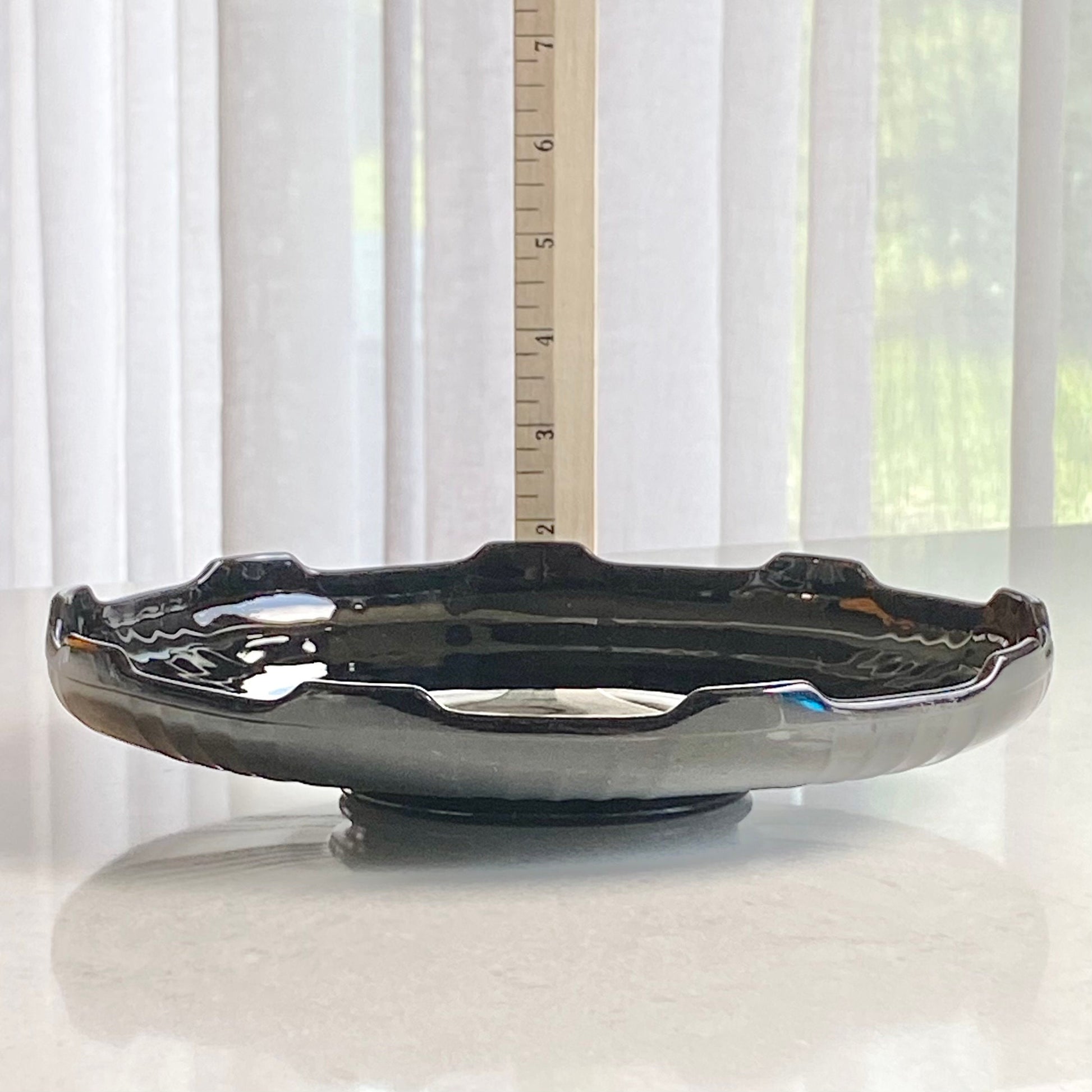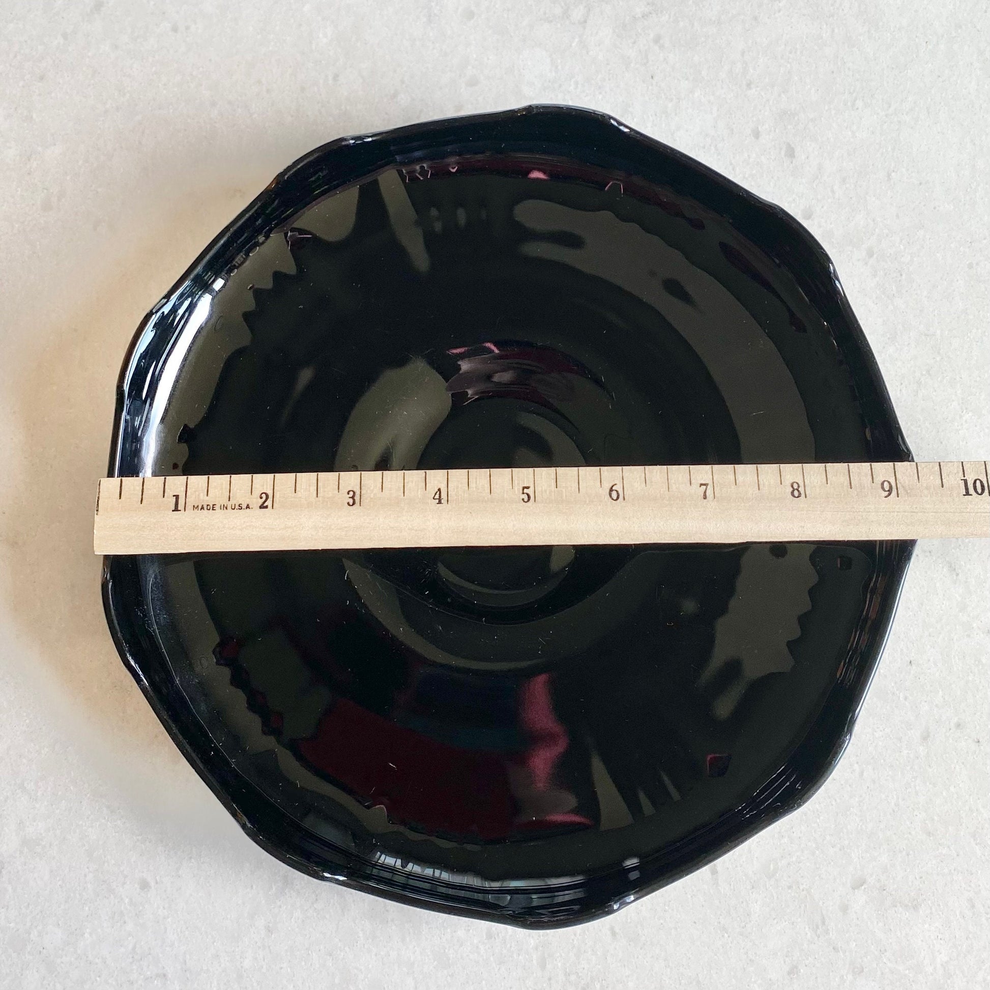 Approximately 9-1/4" across and 1-3/4" high. There are signs of the manufacturing process and some light vintage wear that you can see if you hold the piece up to the light).