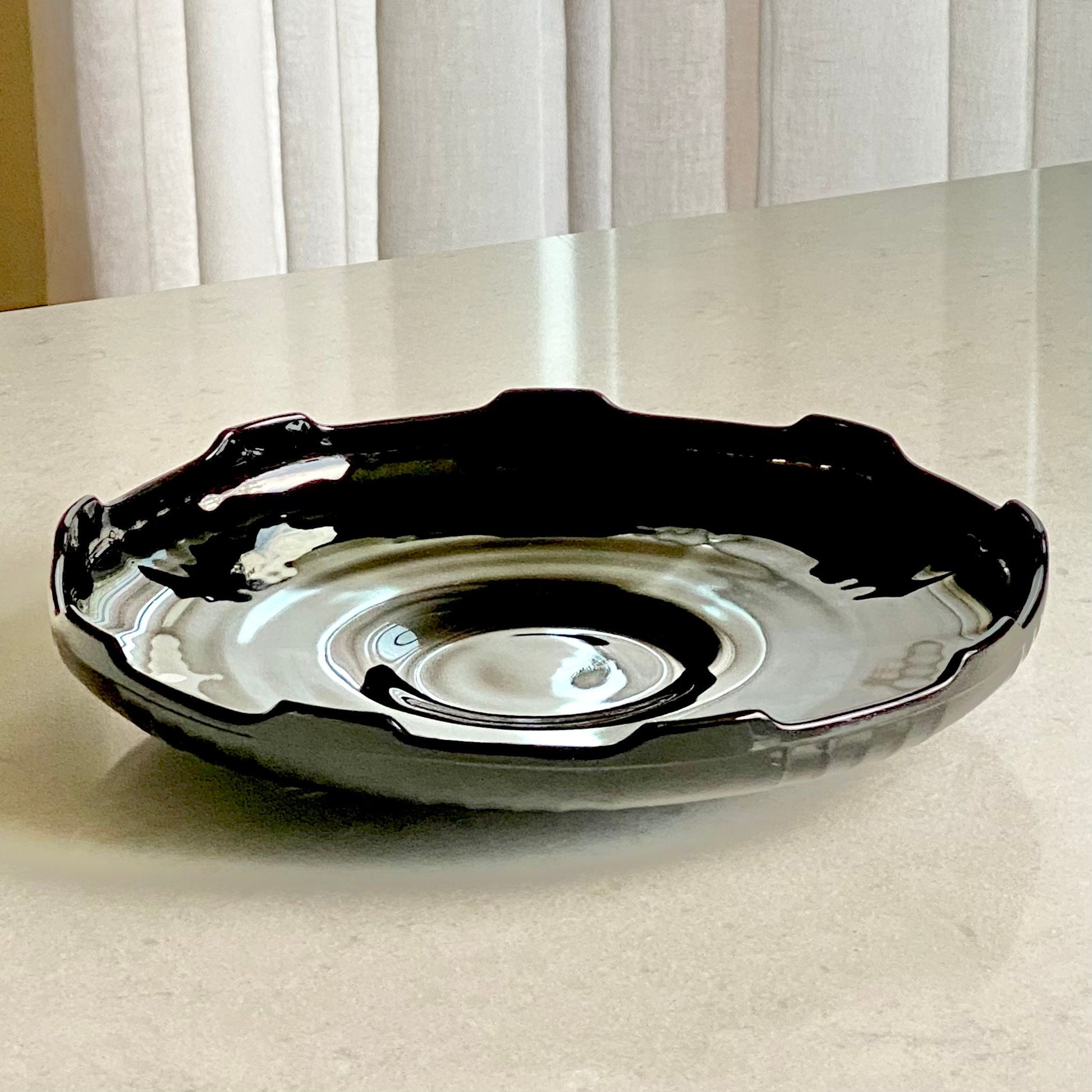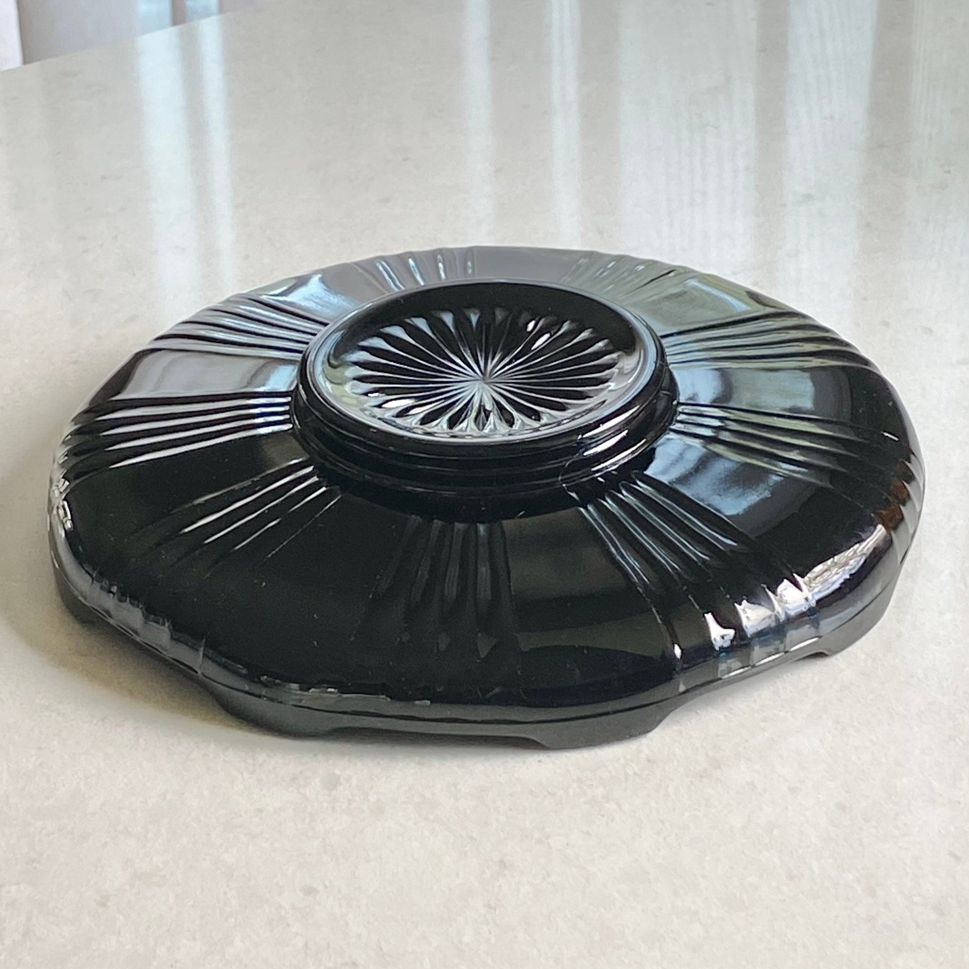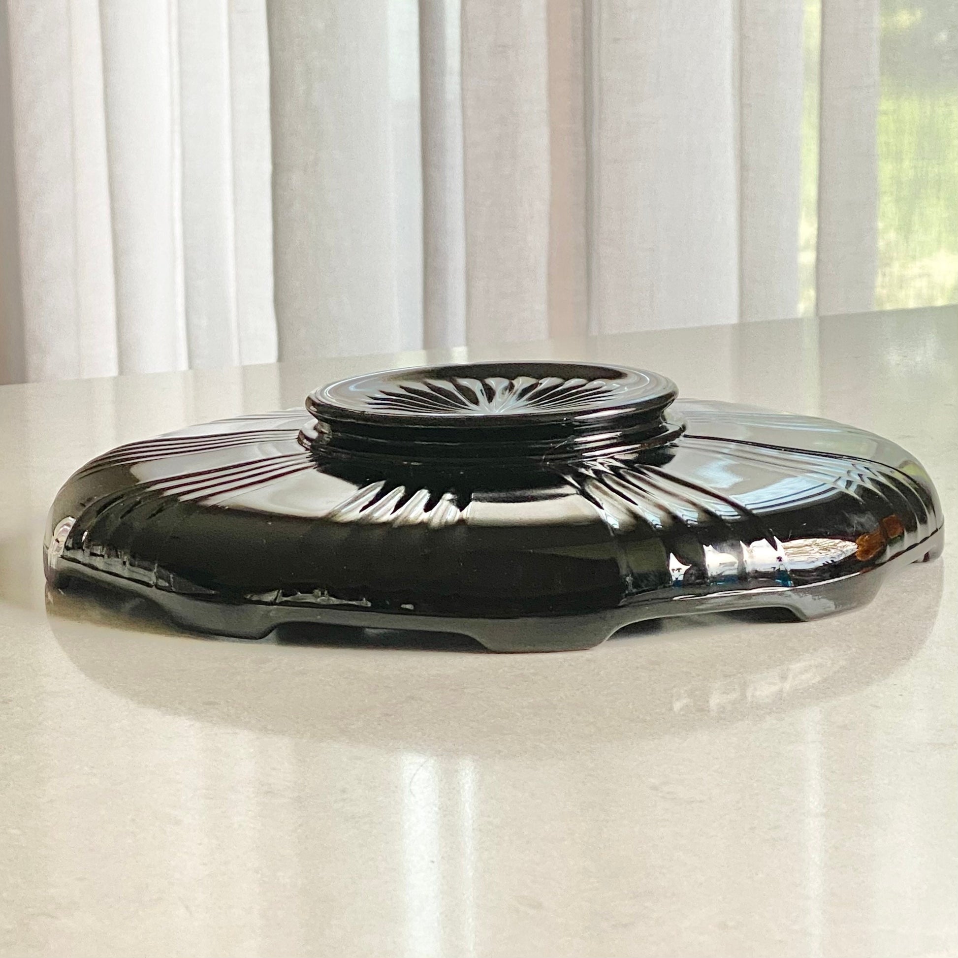 Lovely black glass bowl with an art deco design.