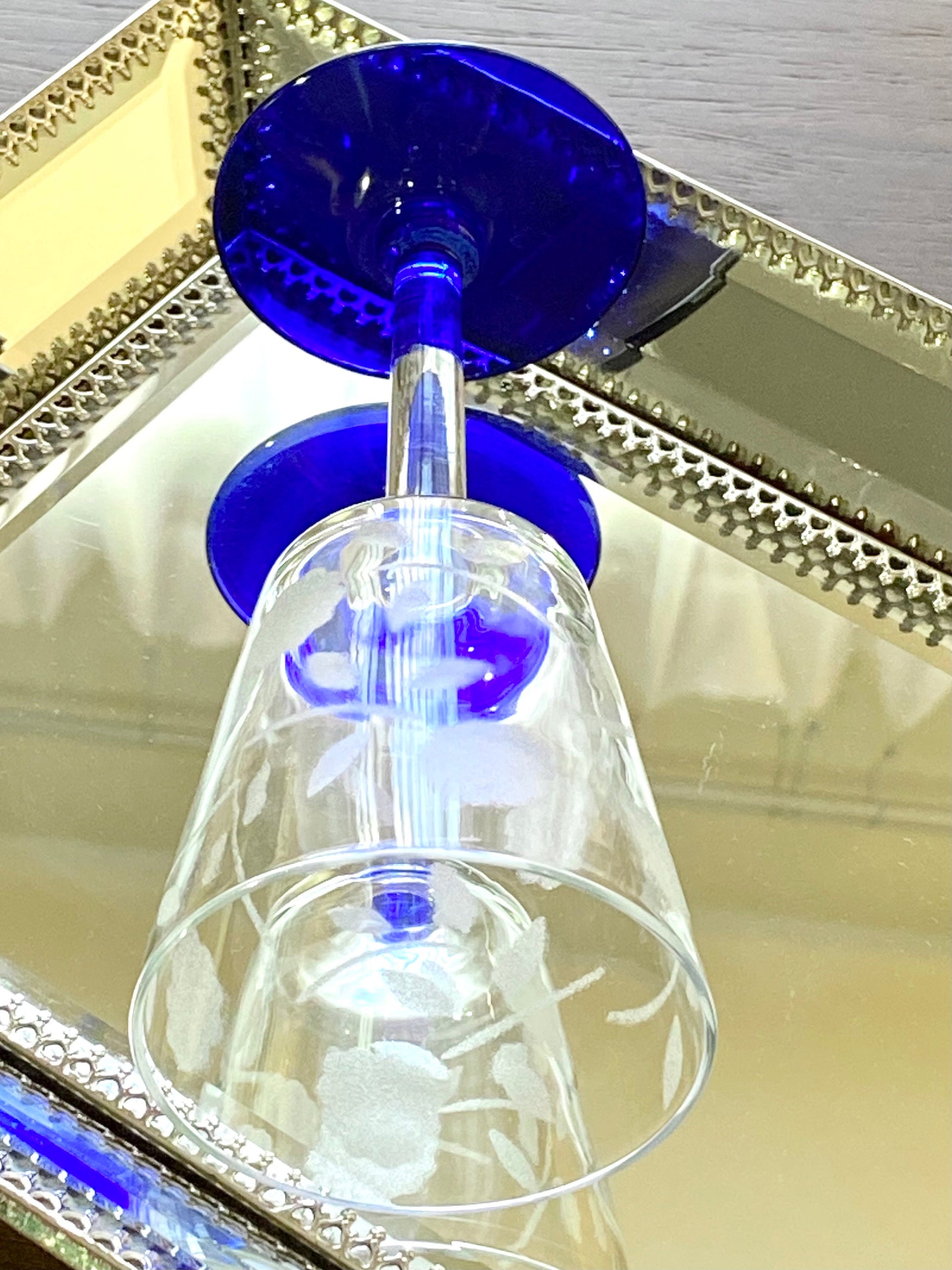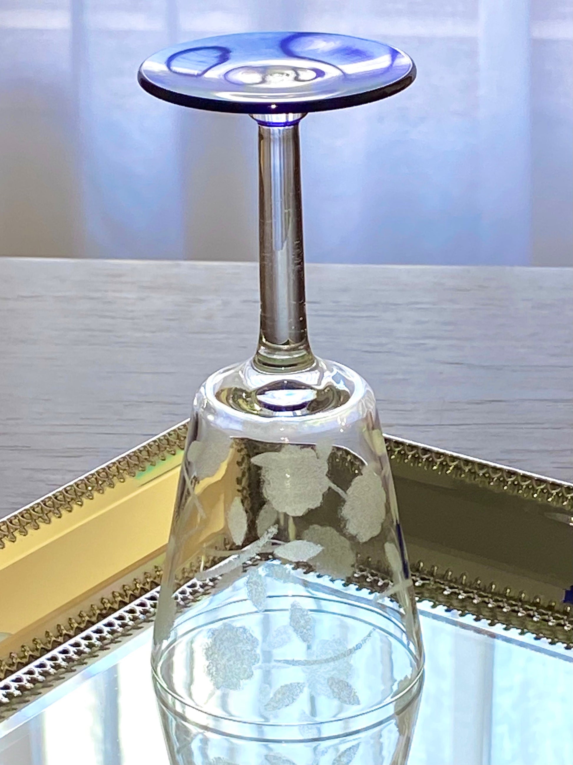 Set of four glasses with a stylized floral pattern and interesting shape.