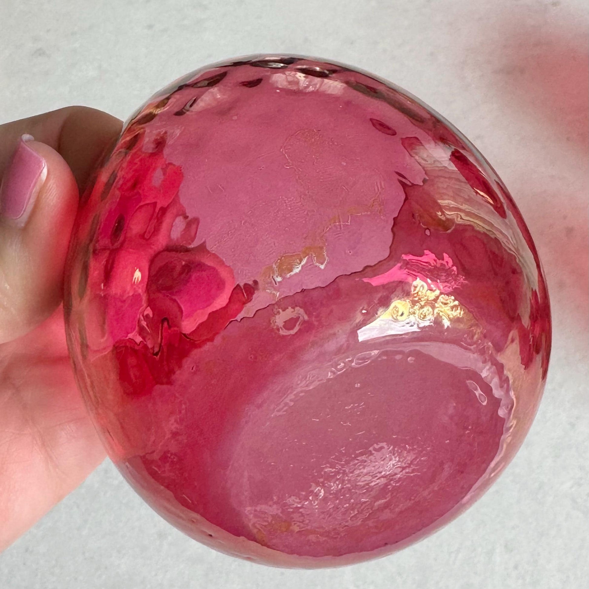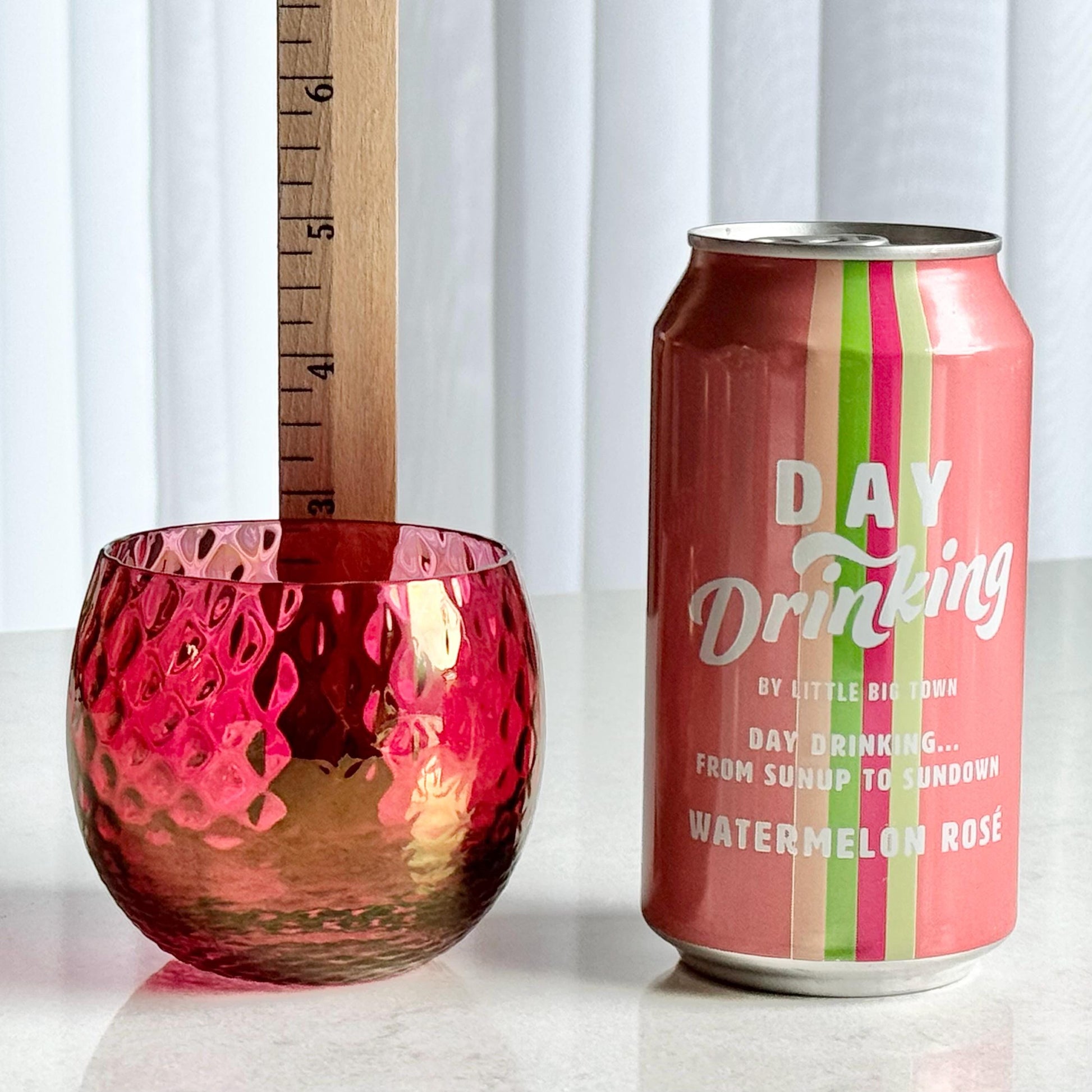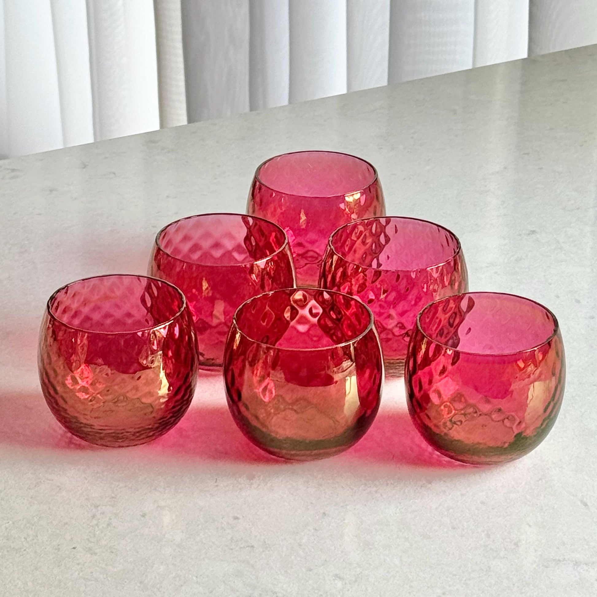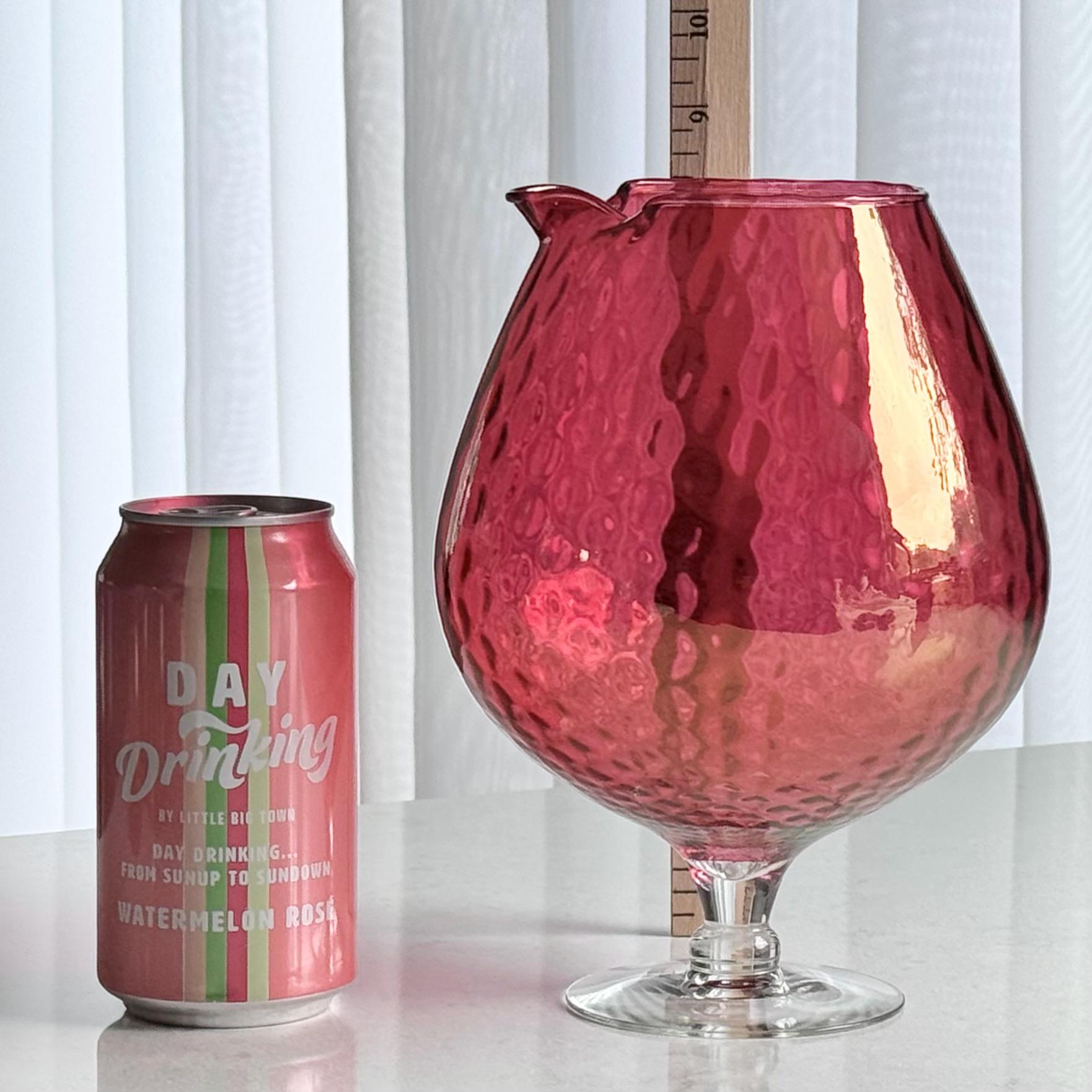 The carafe is approximately 8-1/4" tall with a capacity of about 72 ounces. The glasses are approximately 2-3/4" tall with a capacity of about 8 ounces completely full. There are air bubbles and some variation in the finish from the manufacturing process.