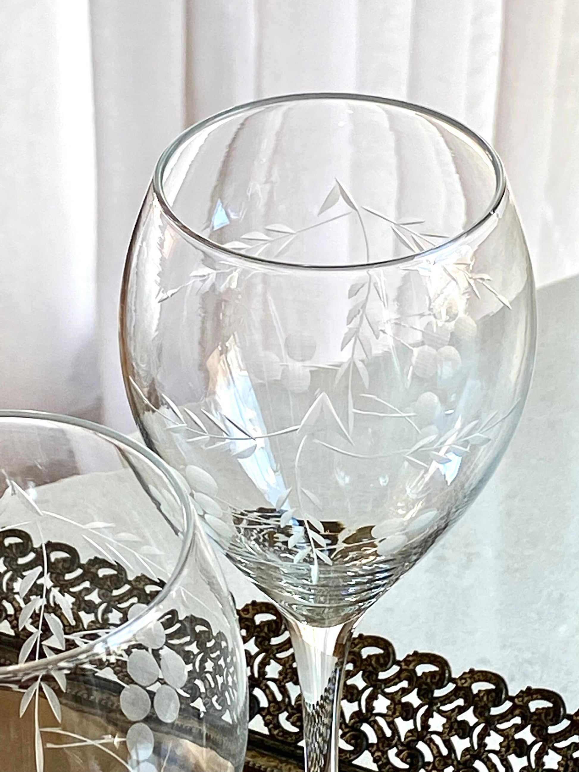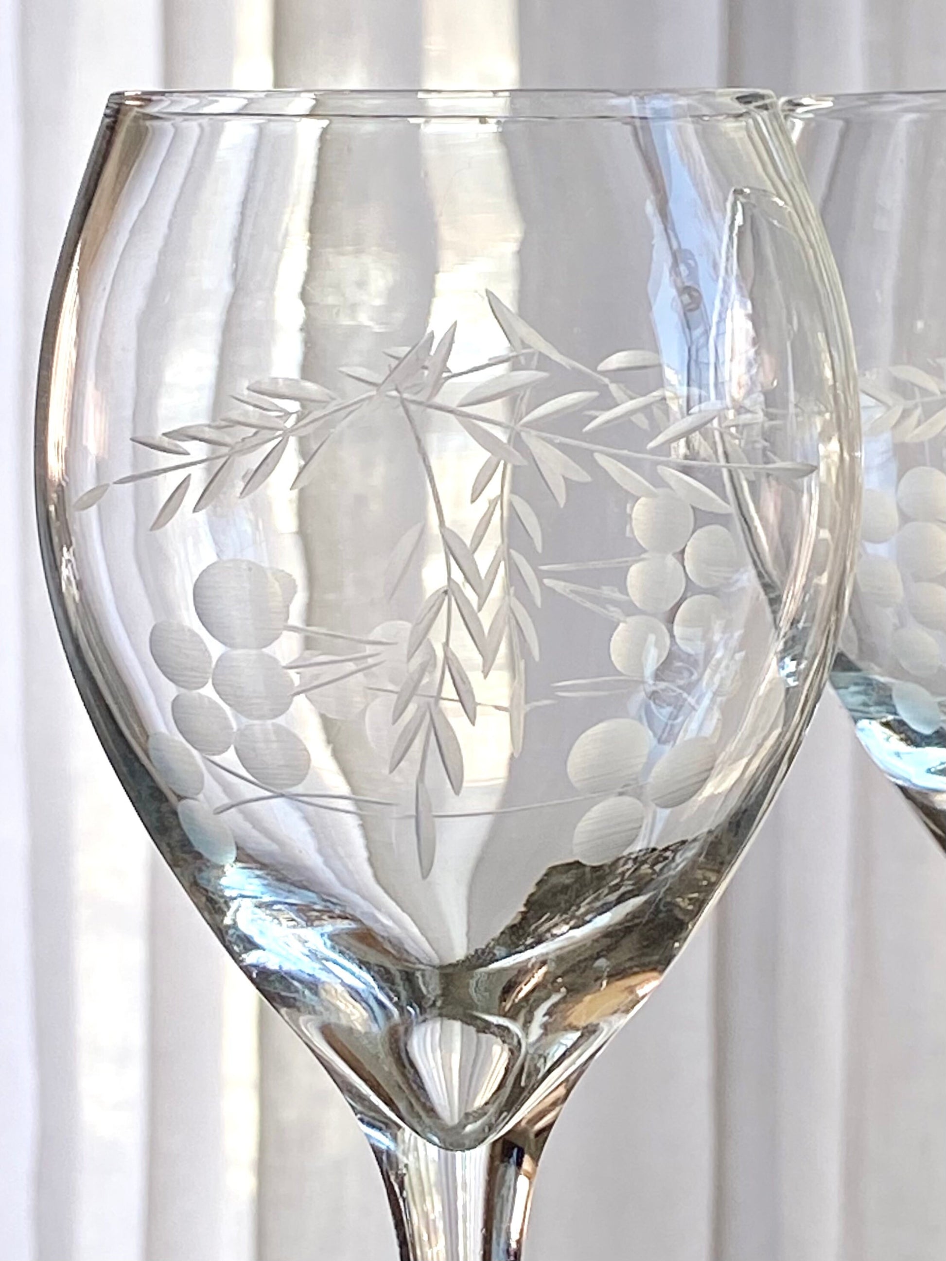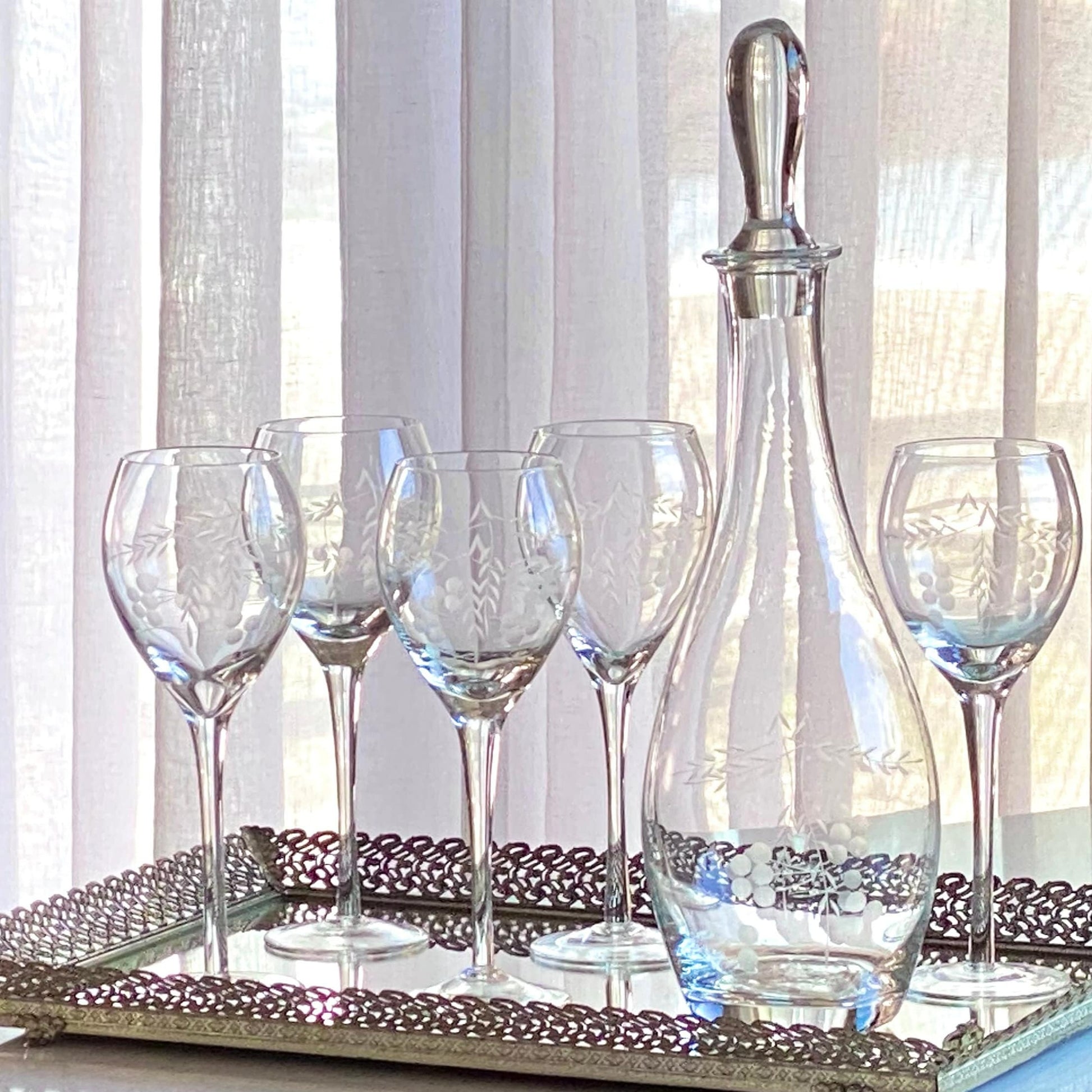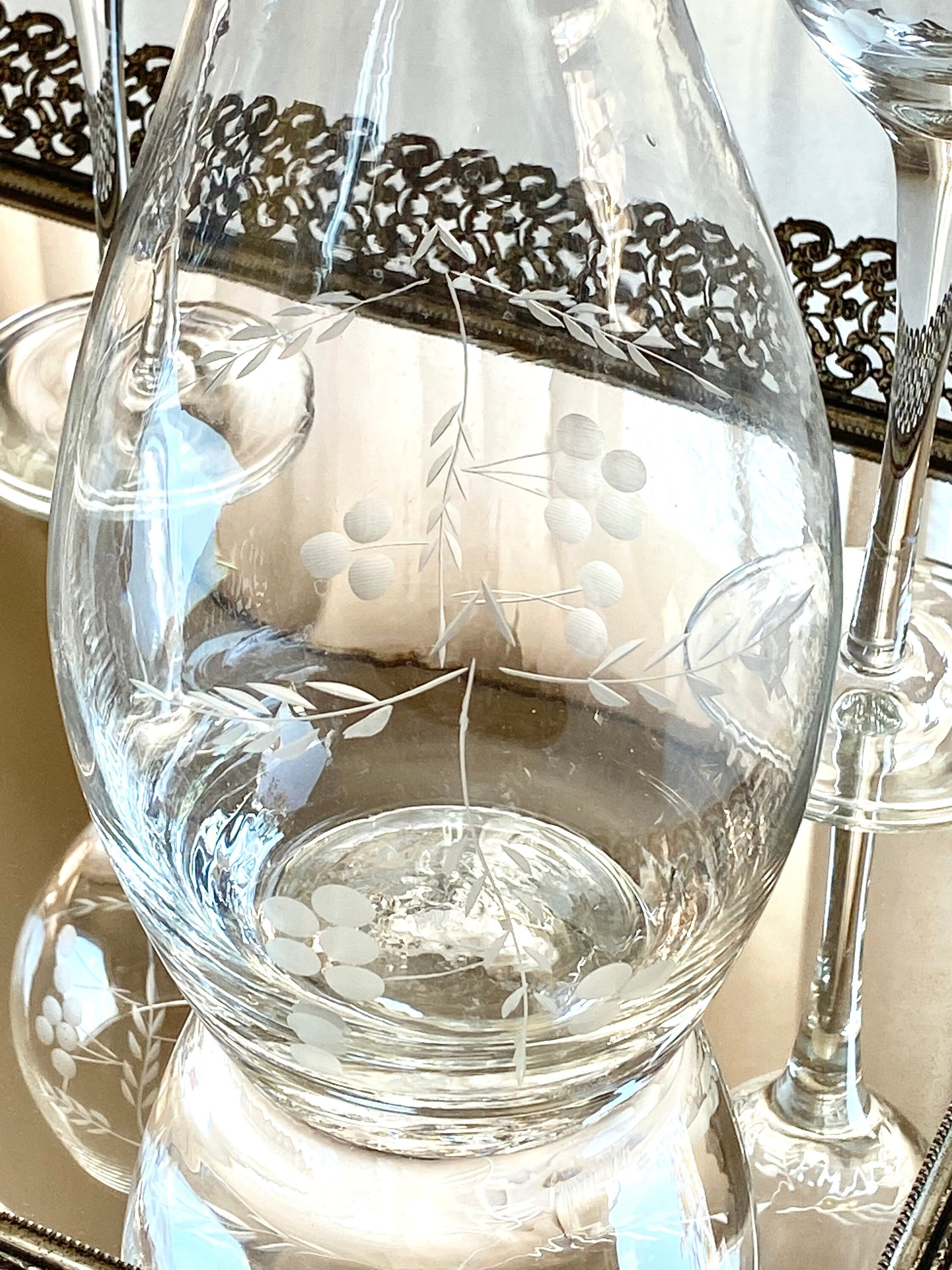 Beautiful set of five glasses and matching decanter, all with an etched design.