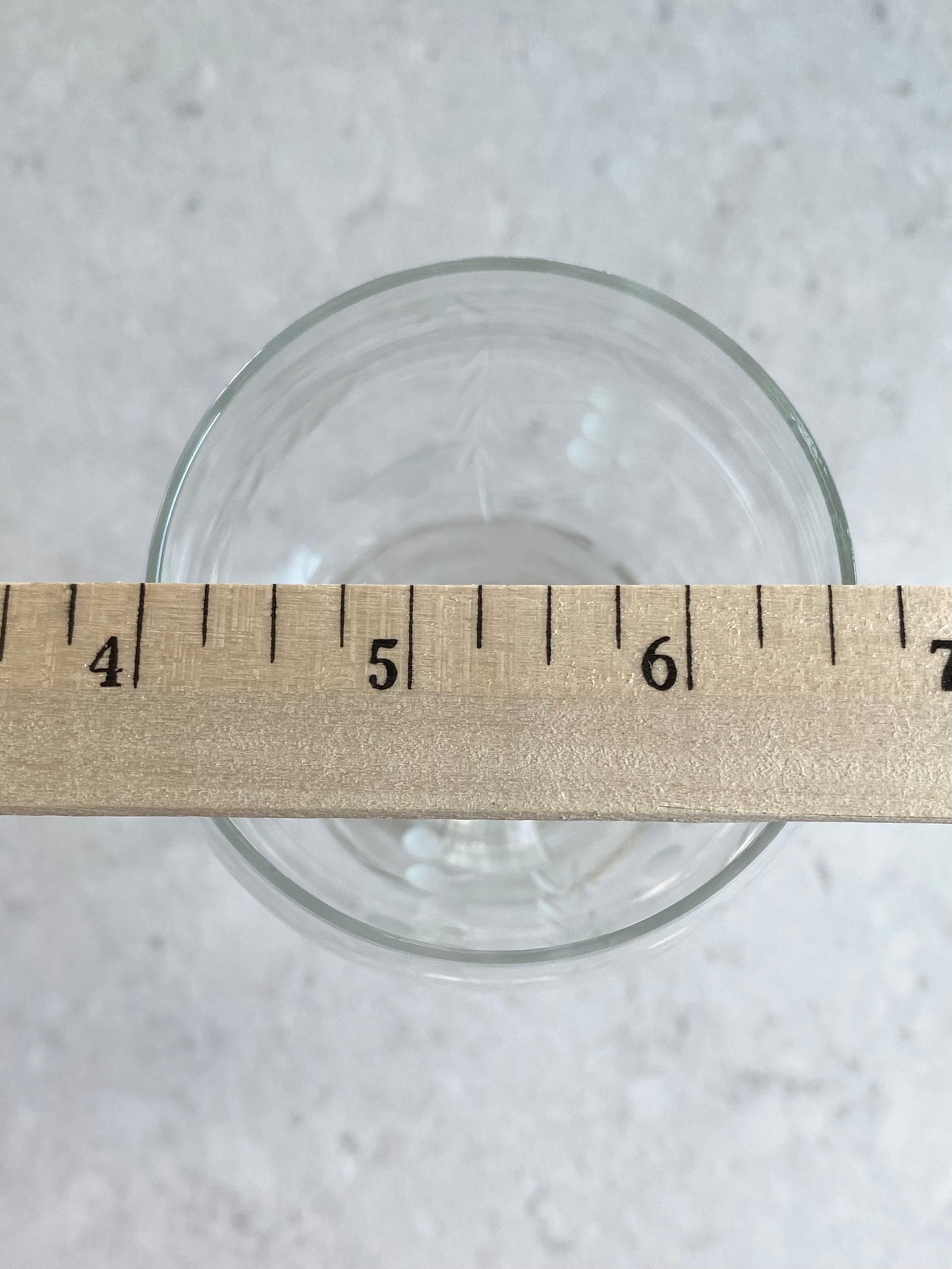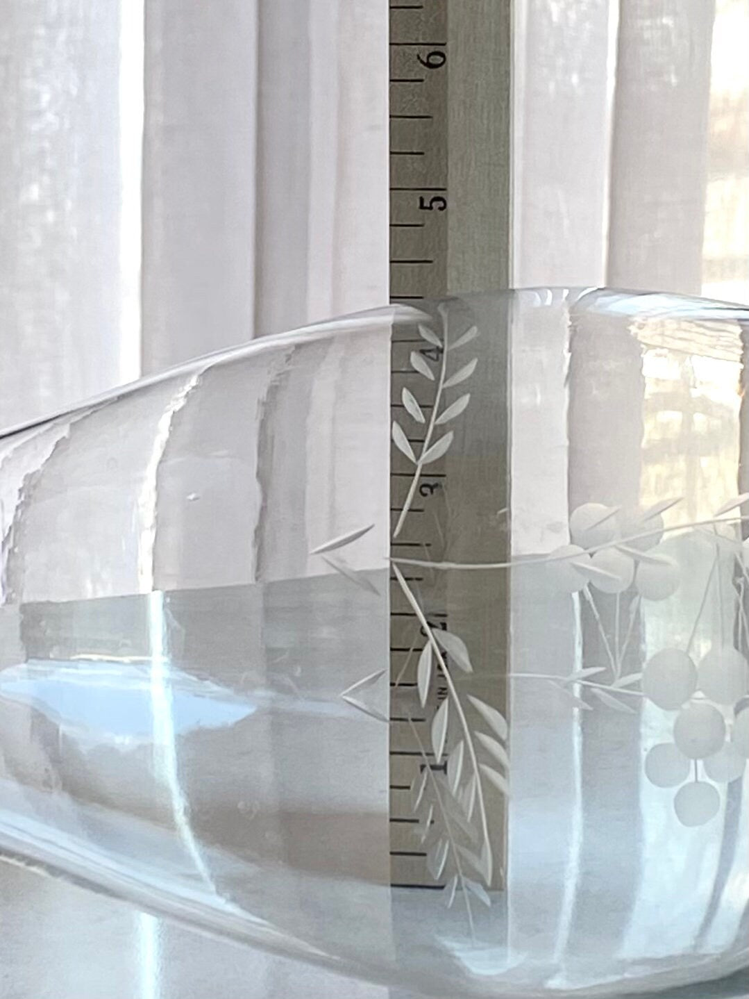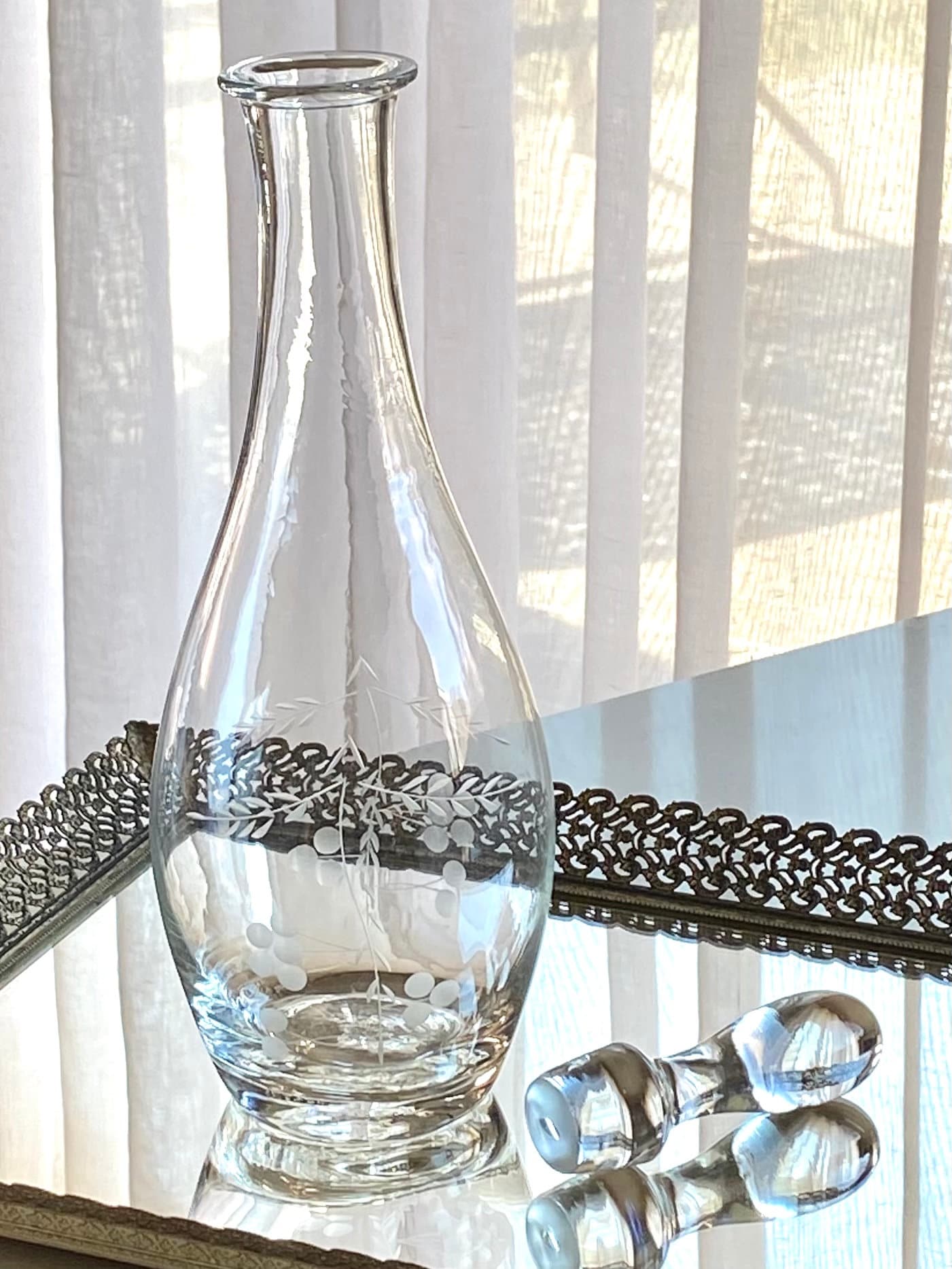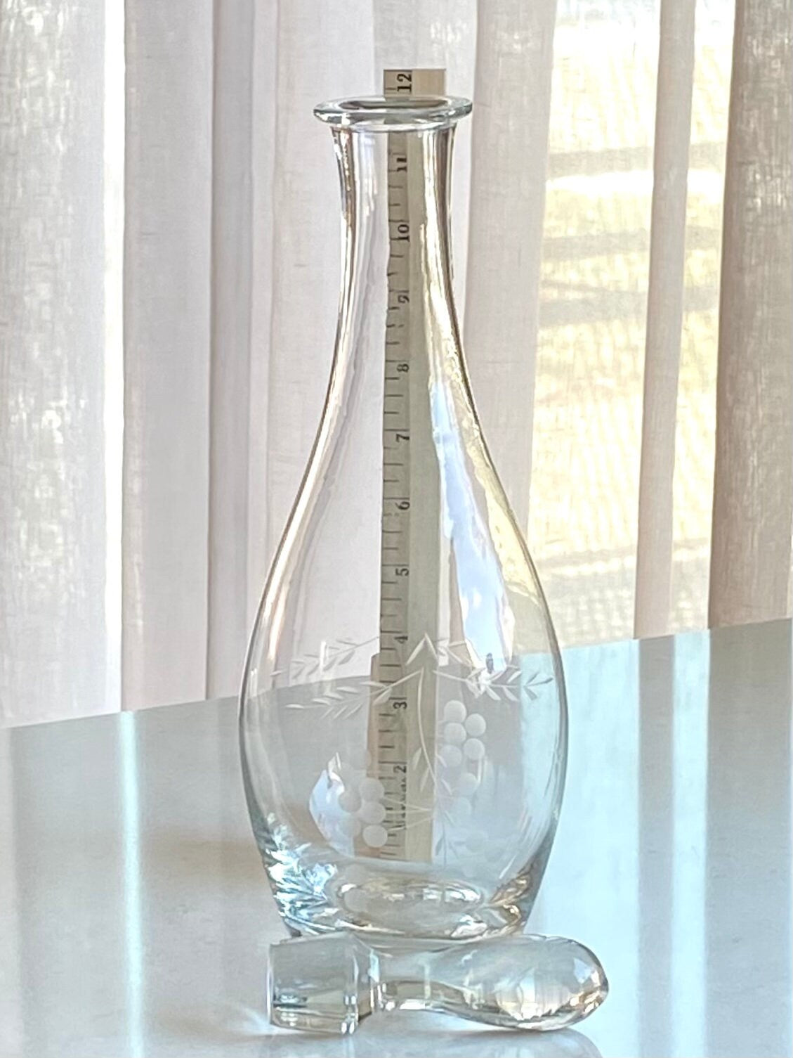 Decanter is approximately 11-3/4" tall and 13-1/4" tall with the top on, and the glasses are 8-3/8" tall and 3-1/8" across the top. Excellent vintage condition, with a very slight roughness on the stopper that I believe is from the manufacturing process.