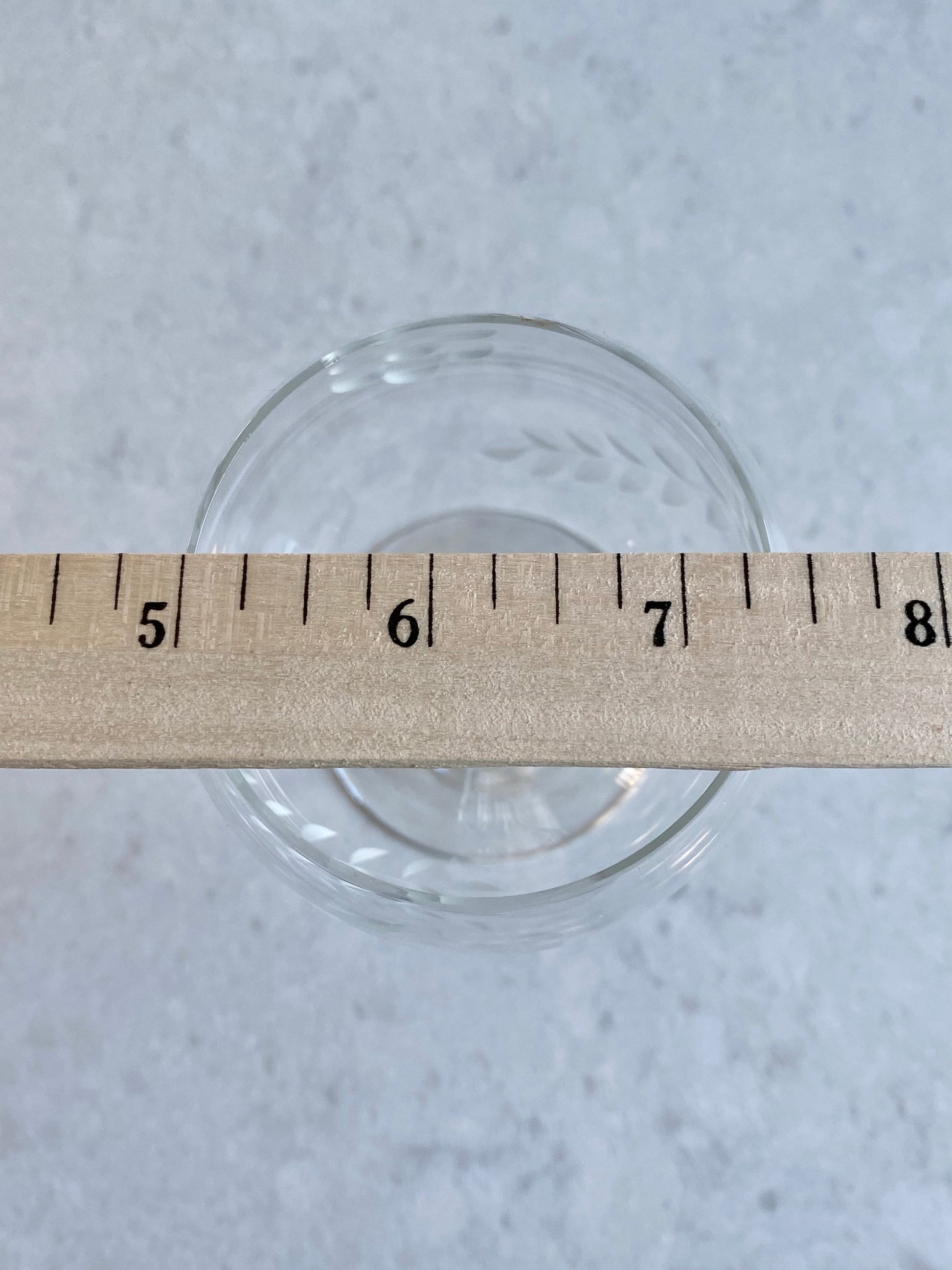 Decanter is approximately 13" tall to the top of the ball stopper, and the glasses are about 6-1/4" tall. Excellent vintage condition, although there are air bubbles typical of pieces of this vintage, and a slight roughness on the inside of the rims of a few of the glasses from the manufacturing process.