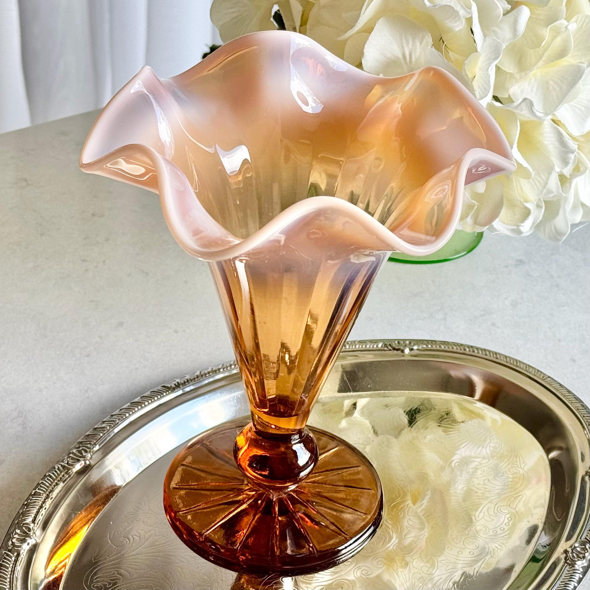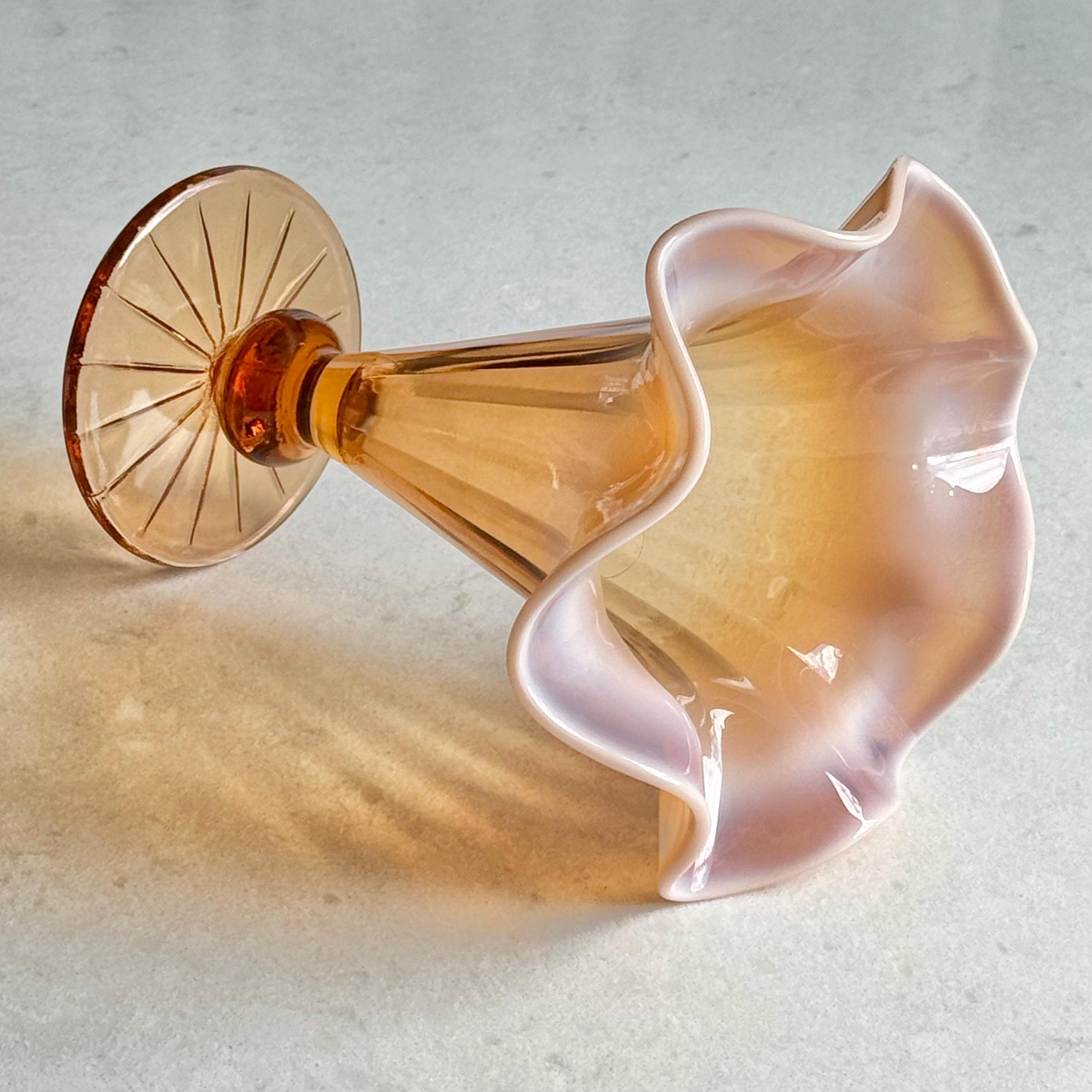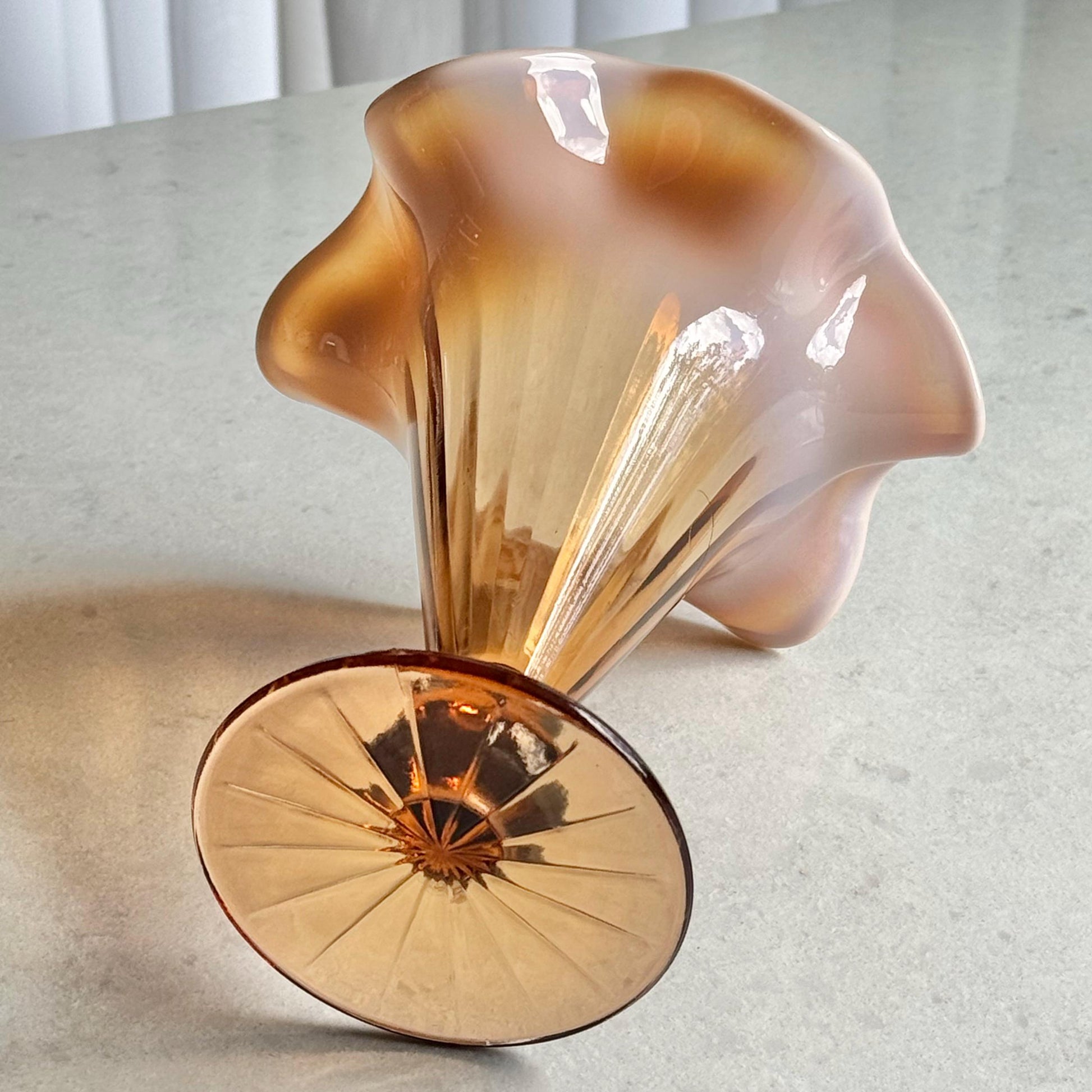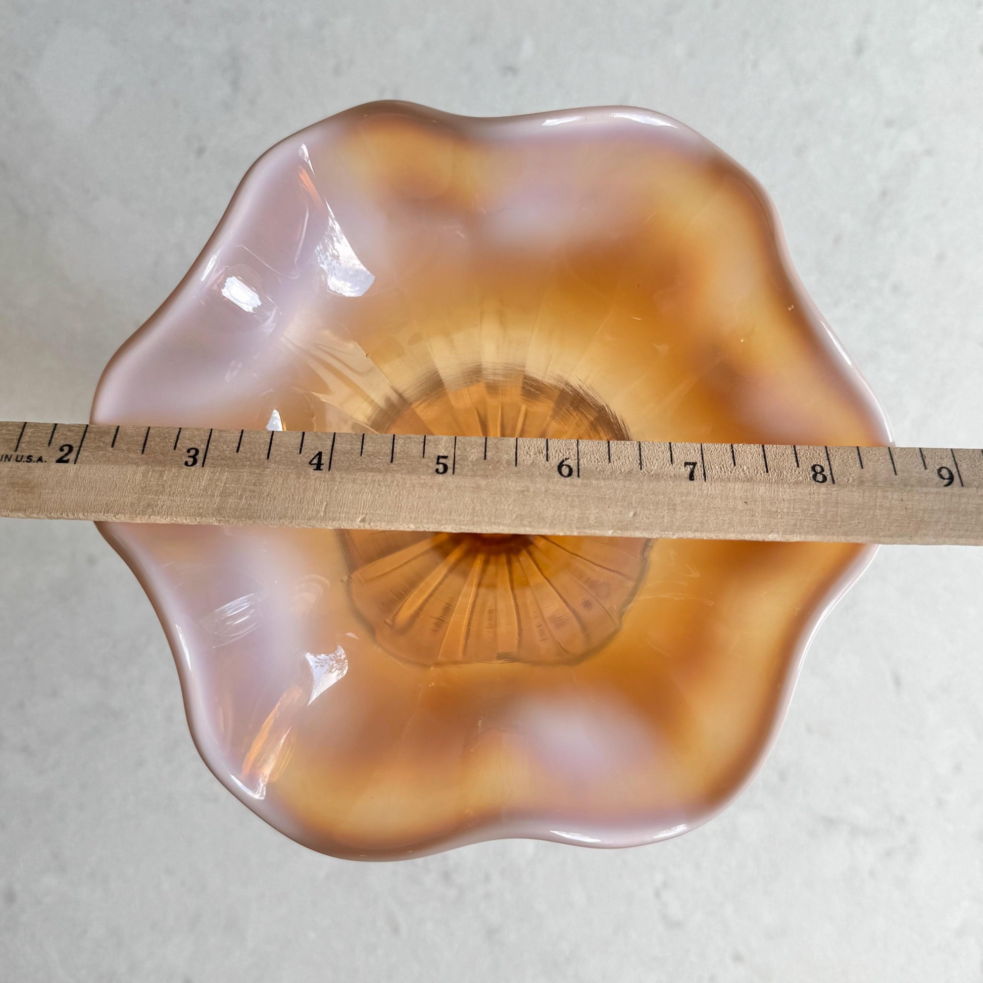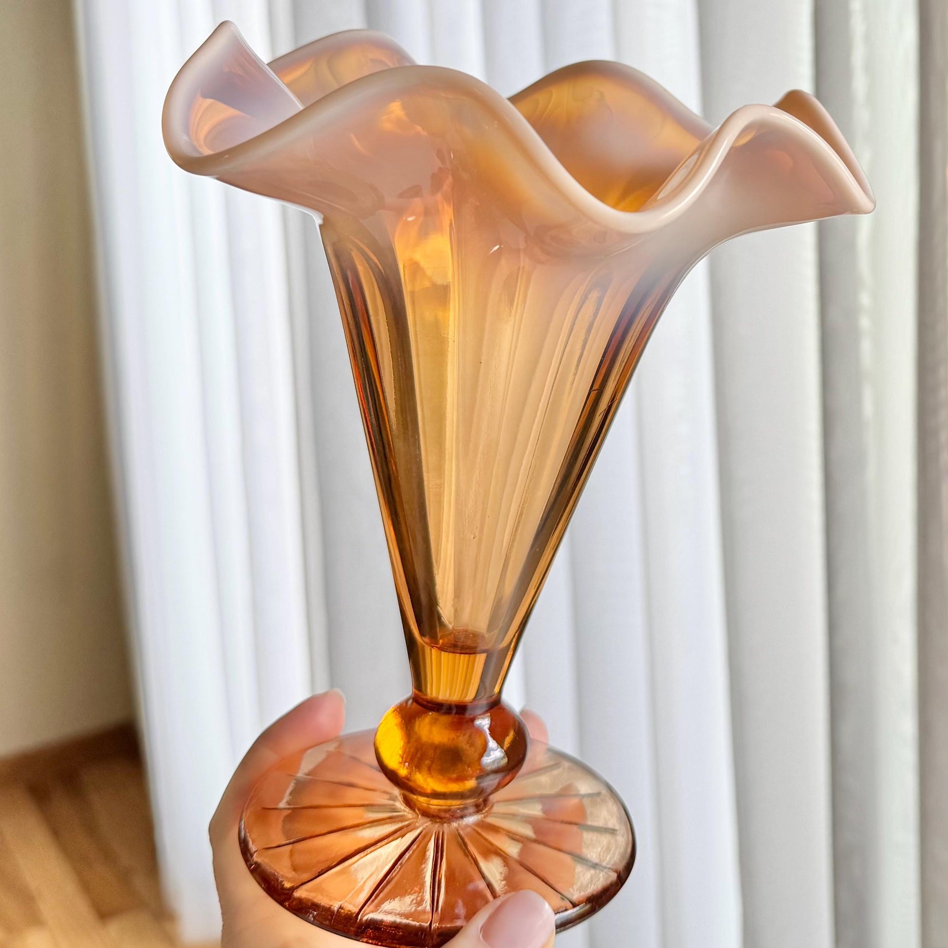 Beautiful vase with a ruffled top. The color is very difficul to capture -- it is a "pinkish amber."