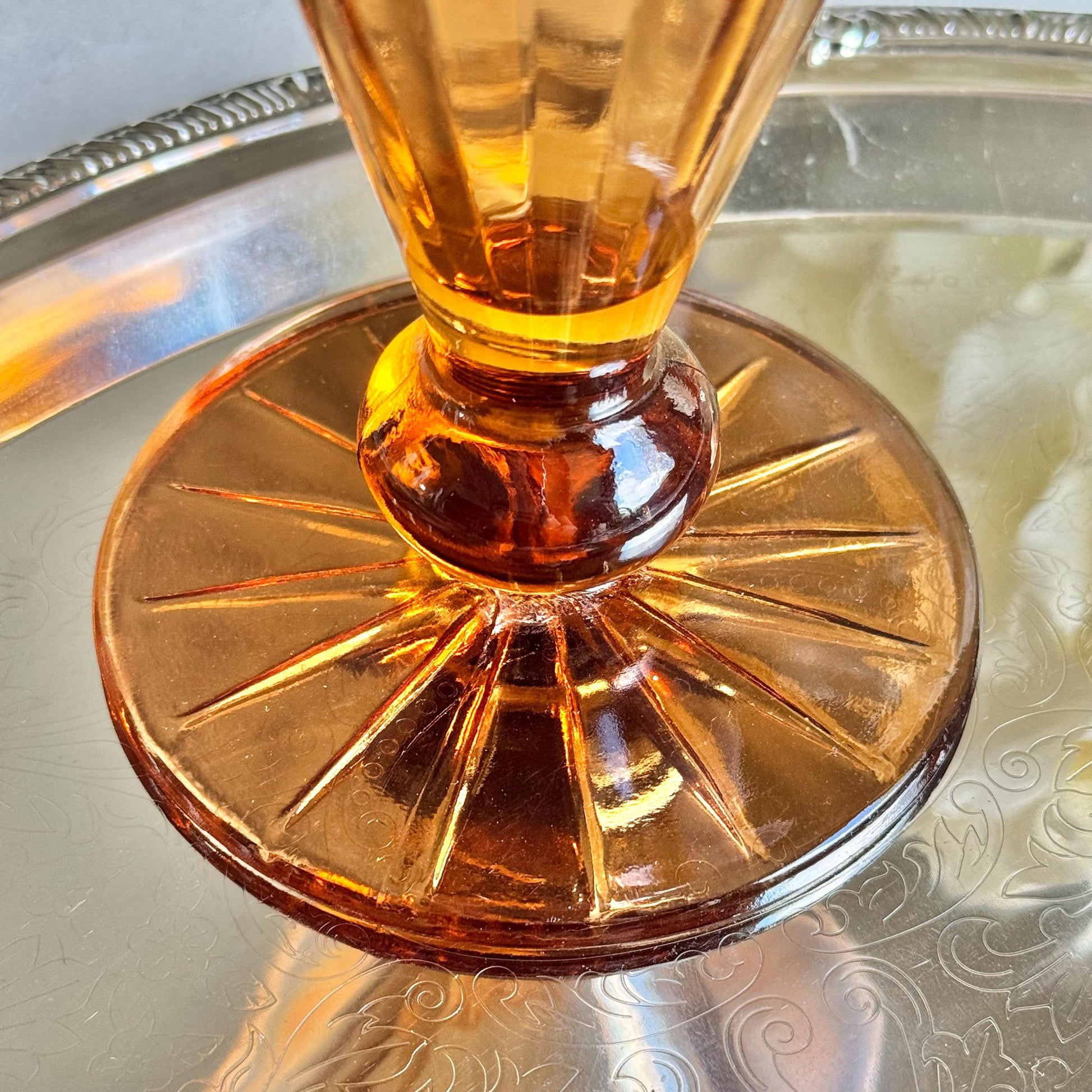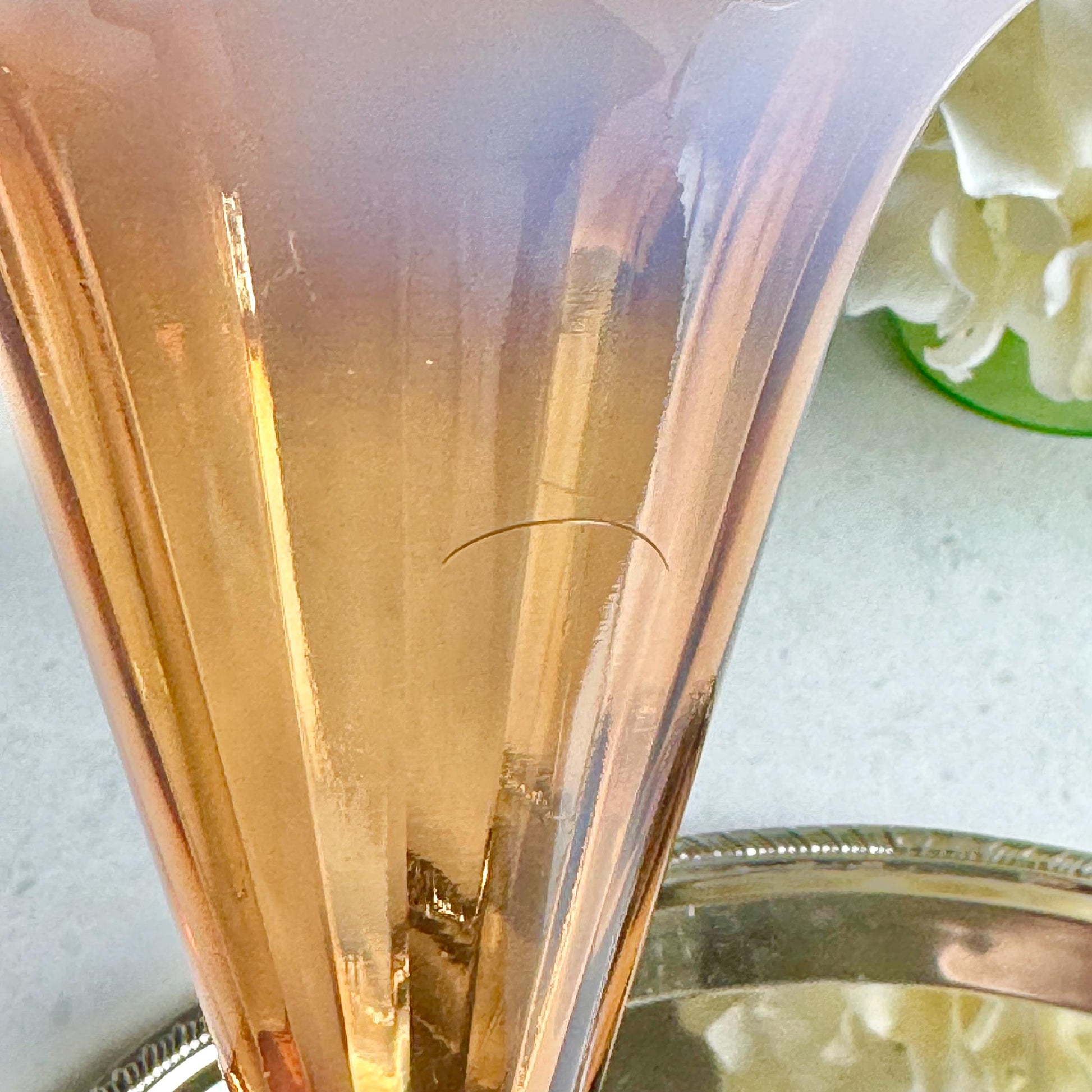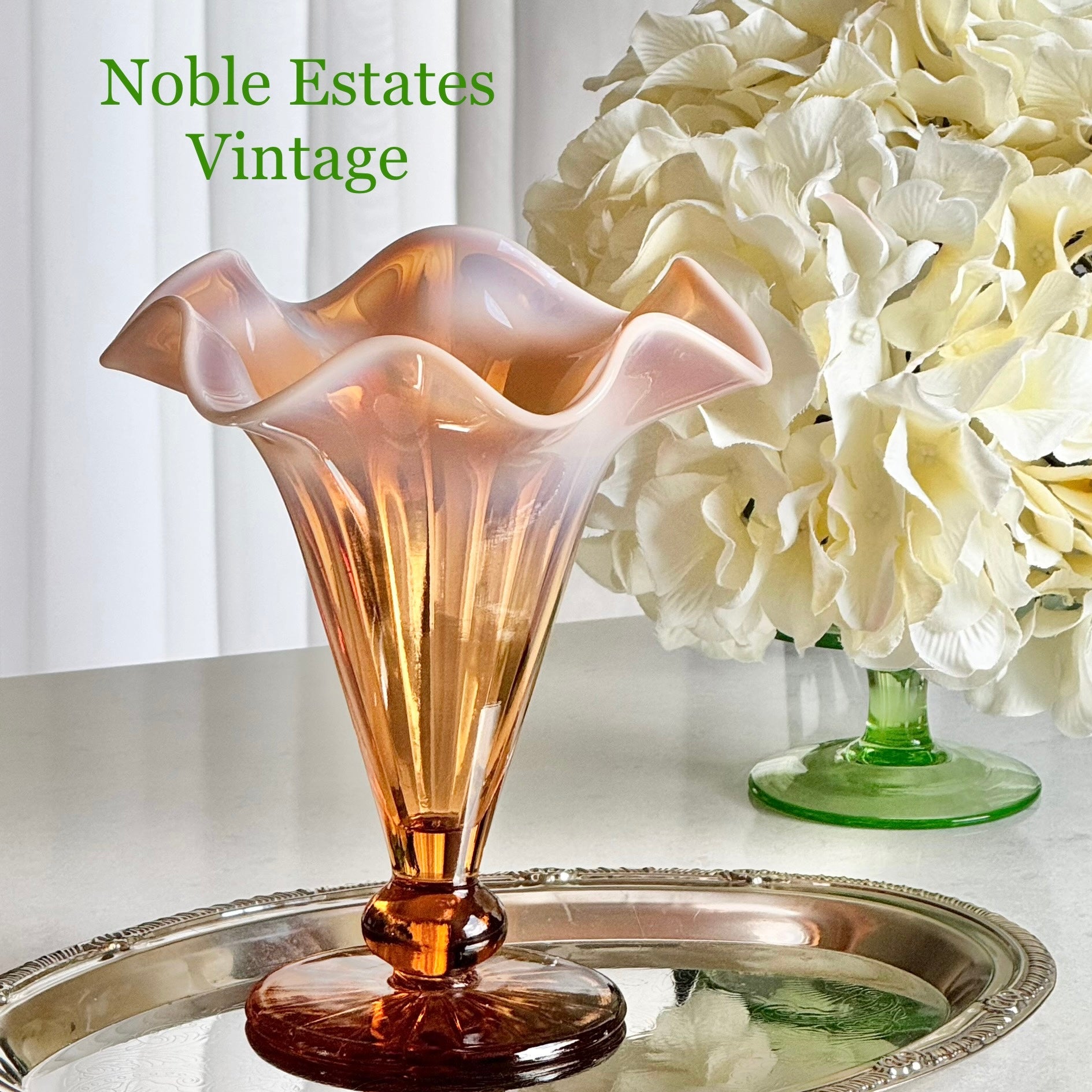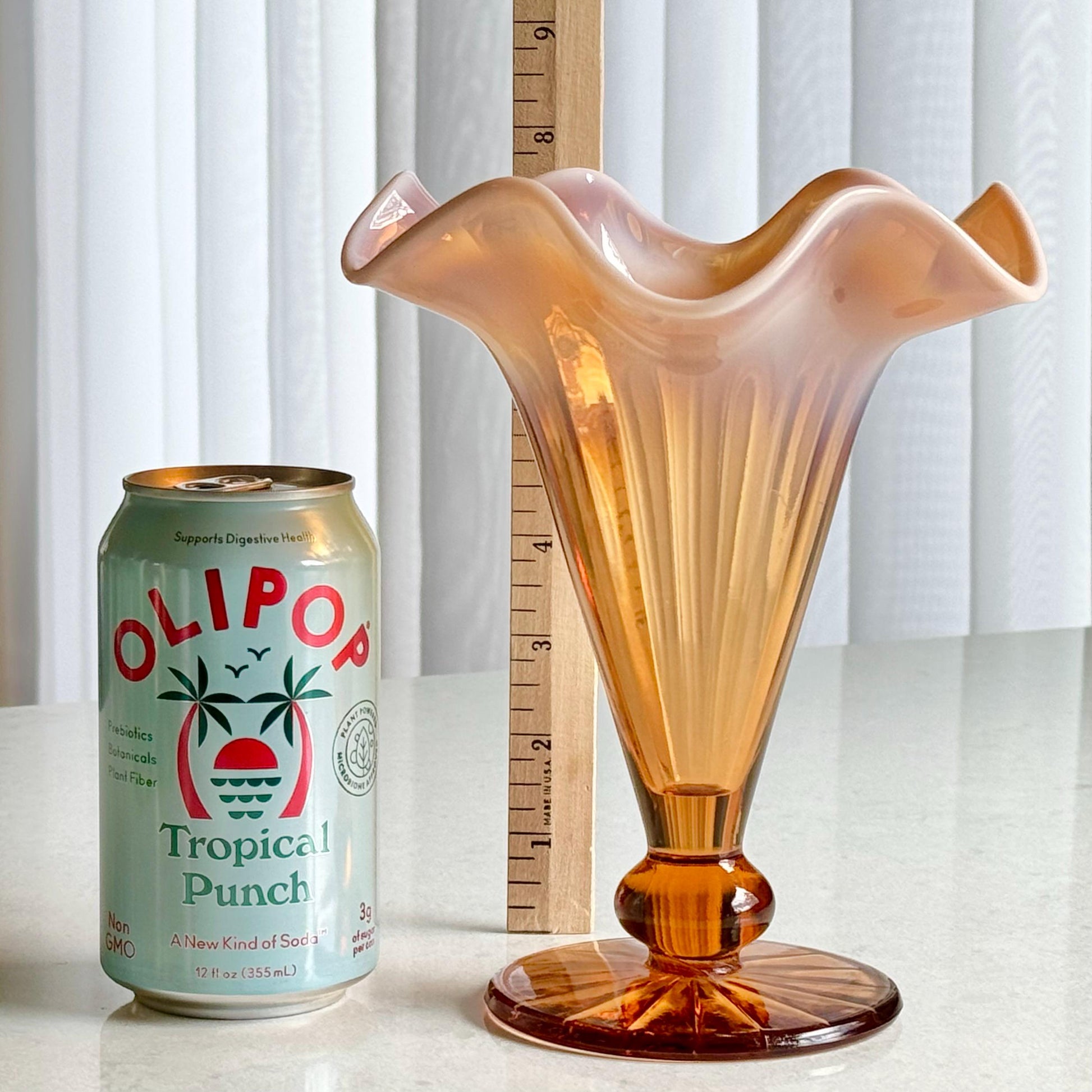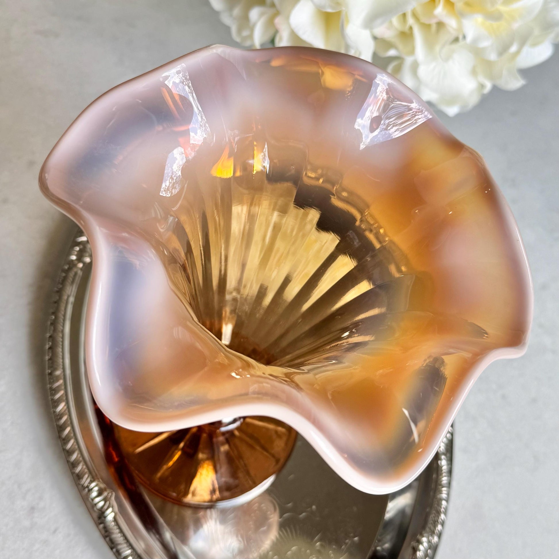 Beautiful vase with a ruffled top. The color is very difficul to capture -- it is a "pinkish amber."