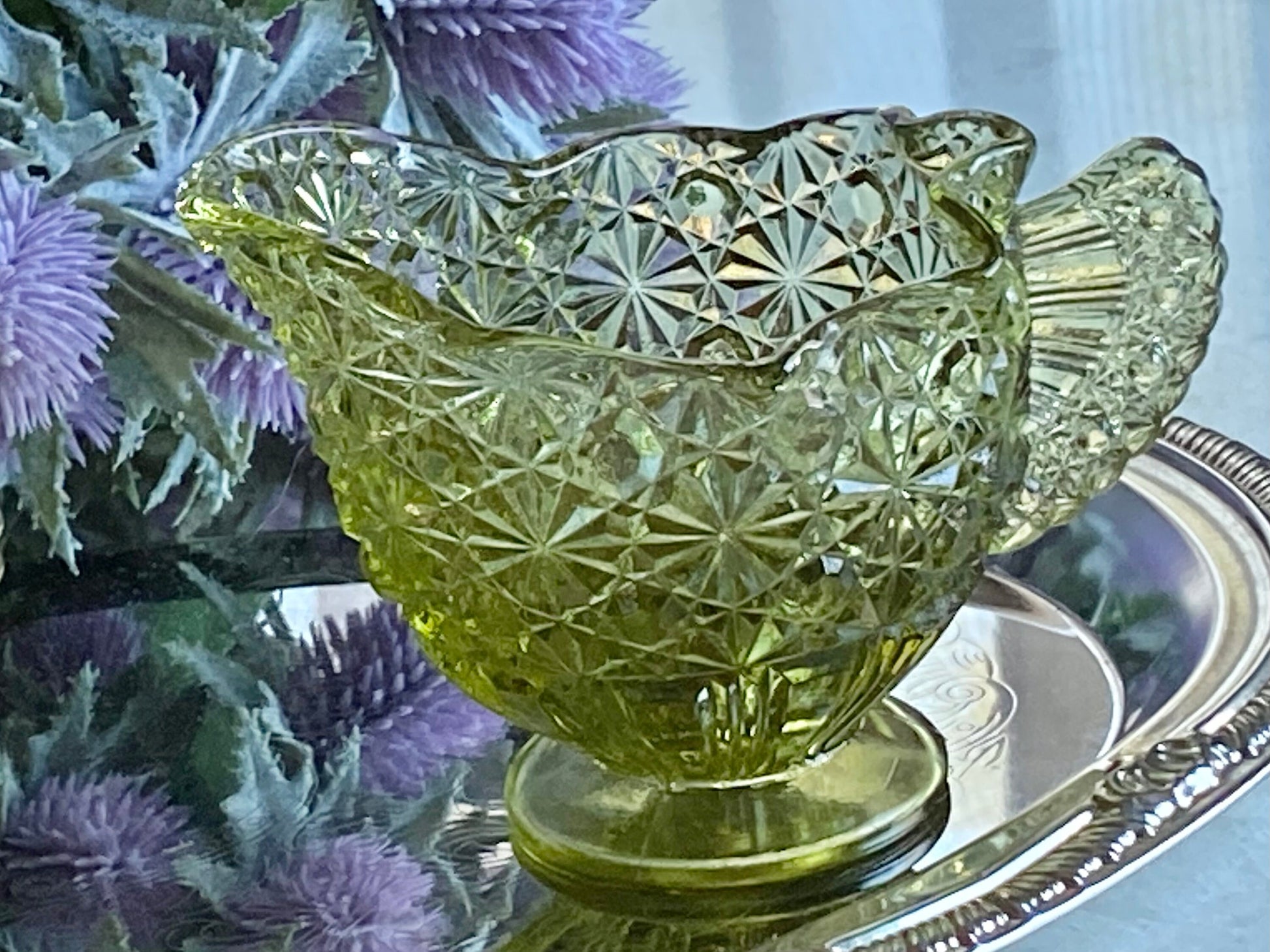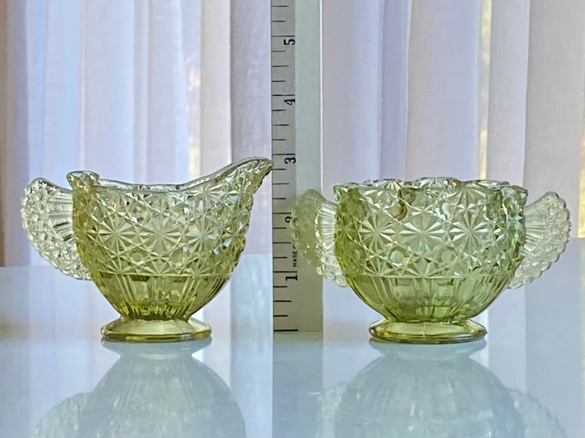 Absolutely charming vintage sugar and creamer set in beautiful green patterned glass!