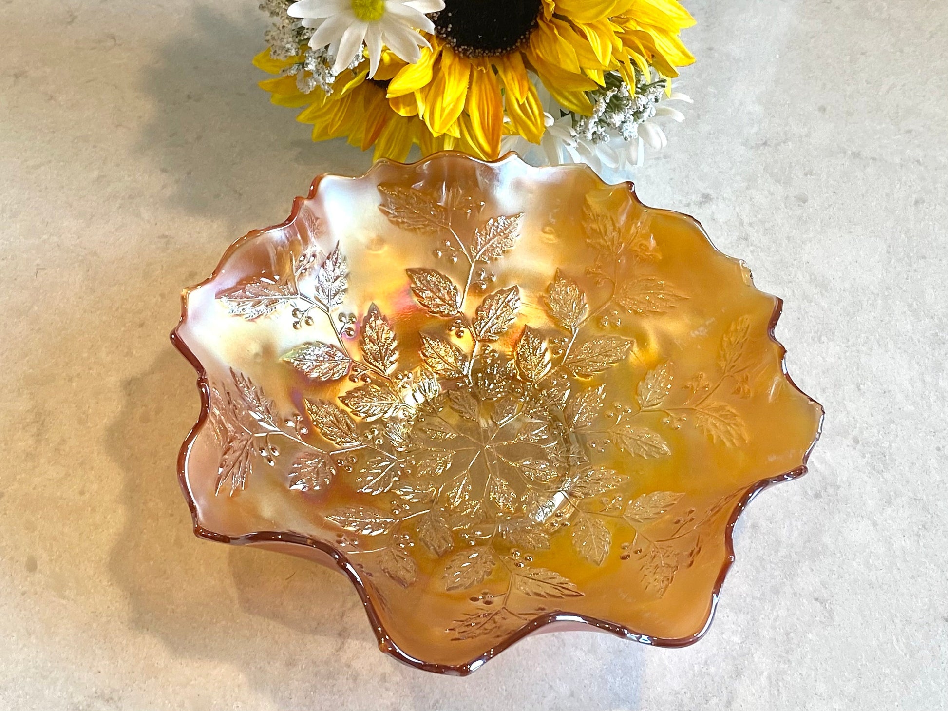 Beautiful carnival glass bowl with a rippled edge. Perfect for candy, fruit, serving, as a centerpiece, and so much more. Approximately 9" across and 2-3/4" tall.