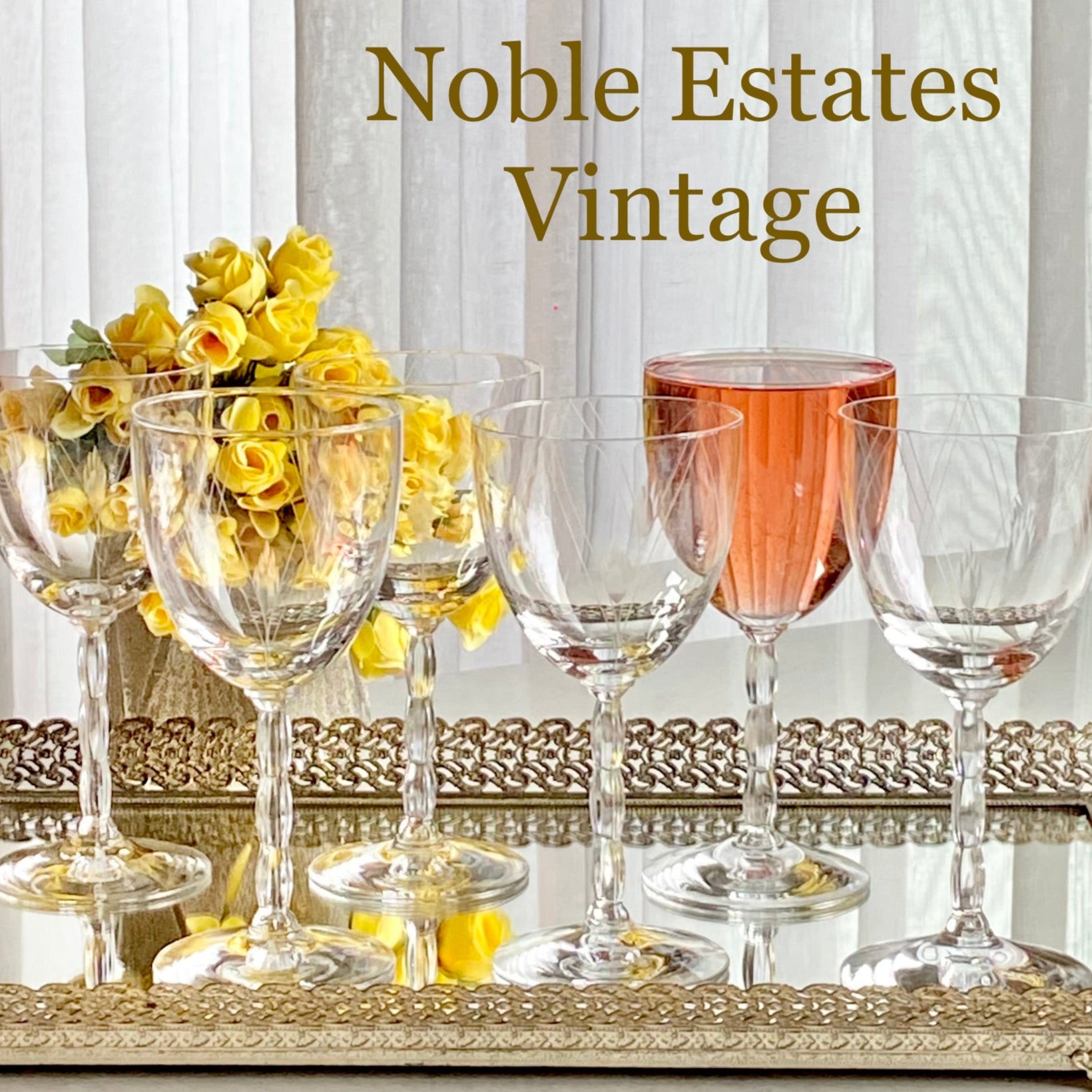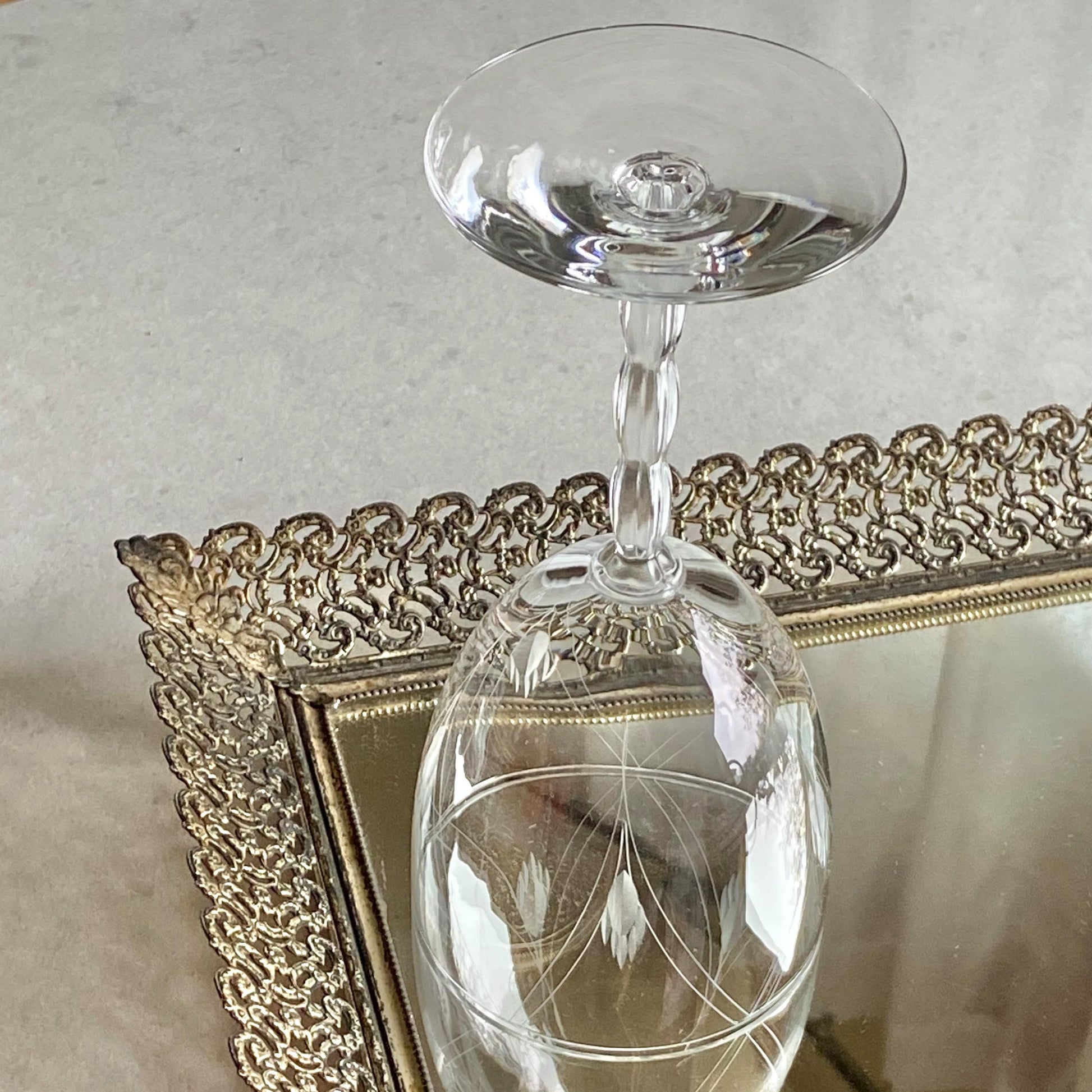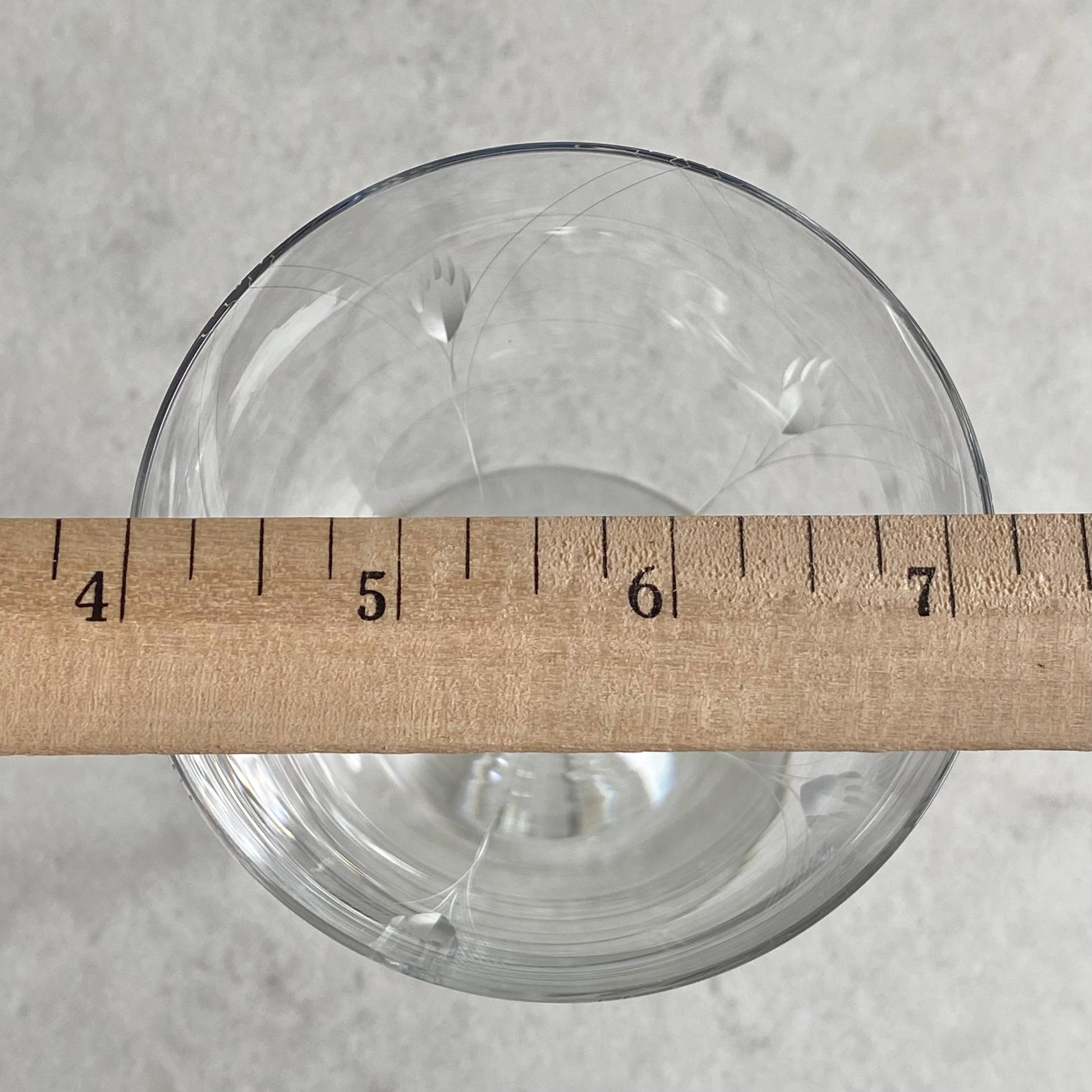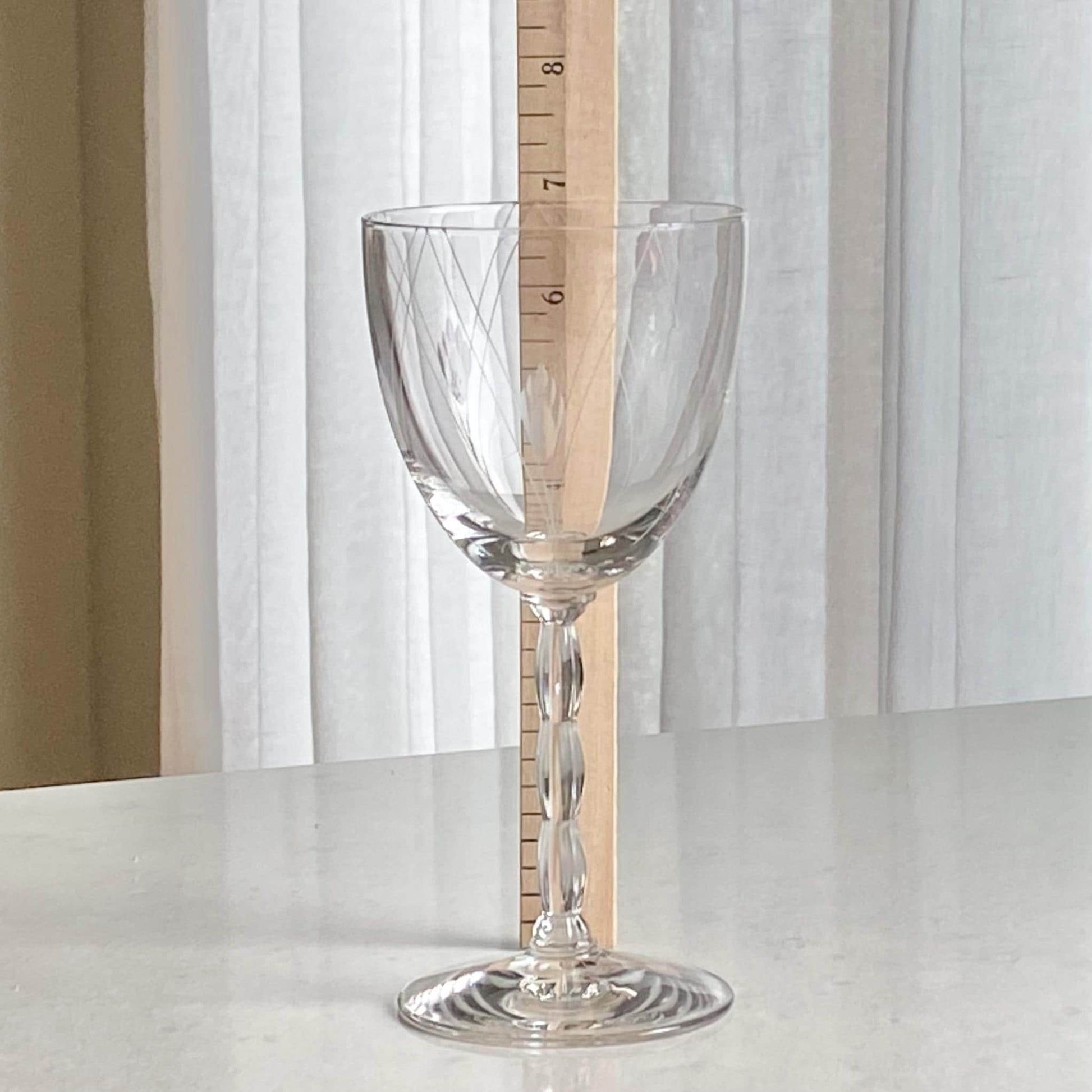 Set of seven elegant glasses with an etched bowl and interesting stem. Approximately 6-3/4” tall and 3-1/8” across the rim with a capacity of about 8 ounces completely full. Excellent vintage condition. There is another size of glasses available as shown in the last photo, and listed separately. FREE SHIPPING in the continental U.S. included in the price. If you are outside of this area please contact me for options. Any props used are for photo purposes only and not a part of the items being sold.