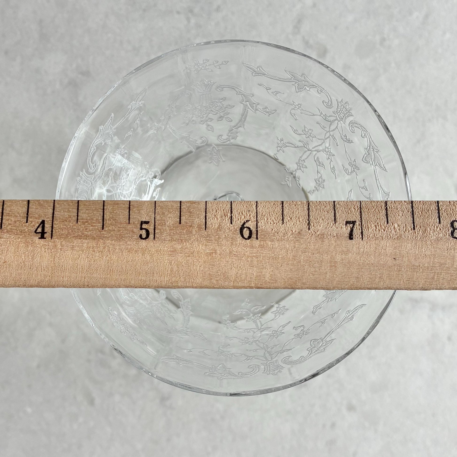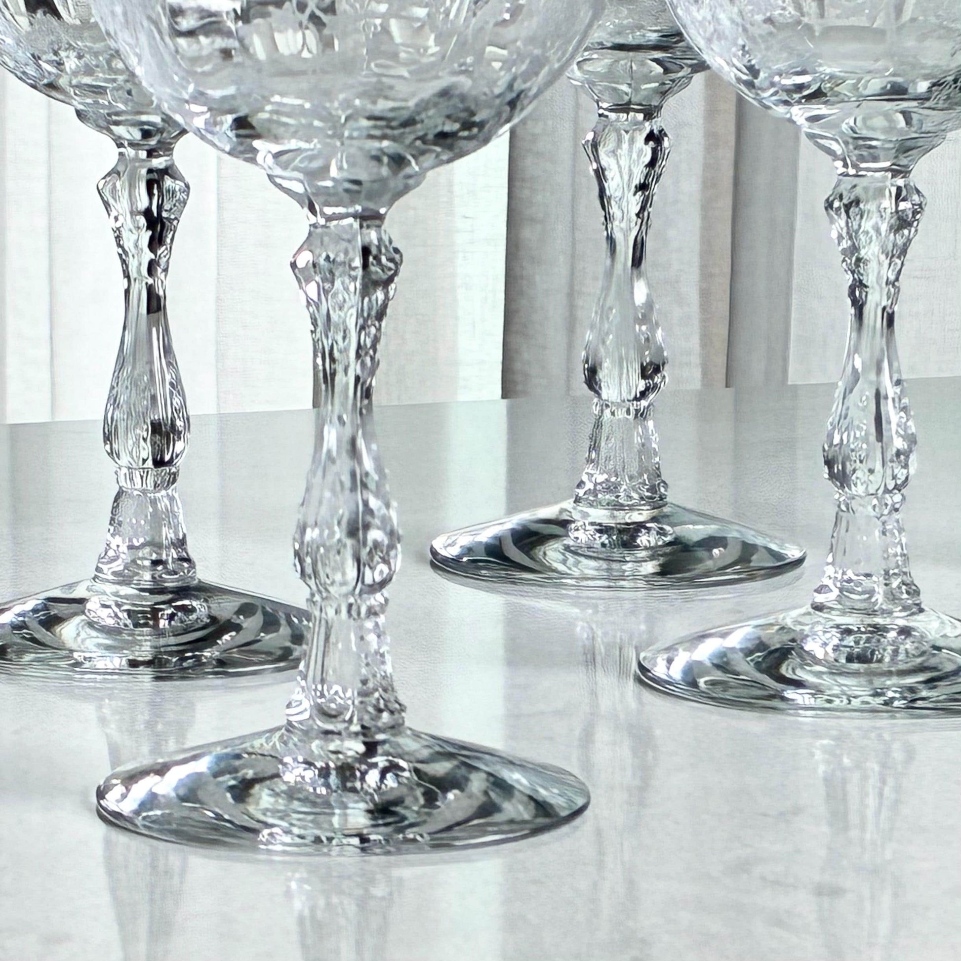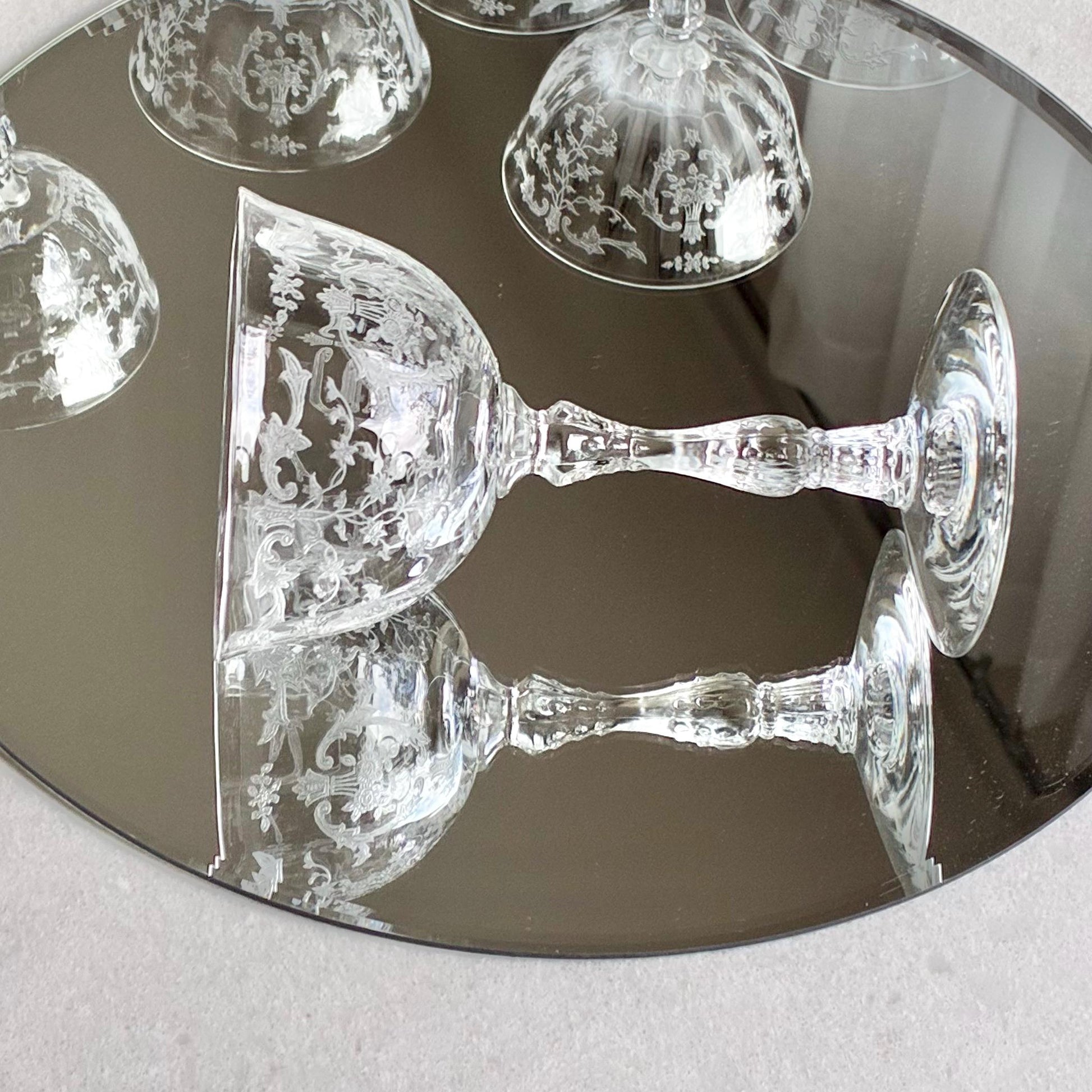 Set of six beautifully etched Fostoria Navarre glasses.