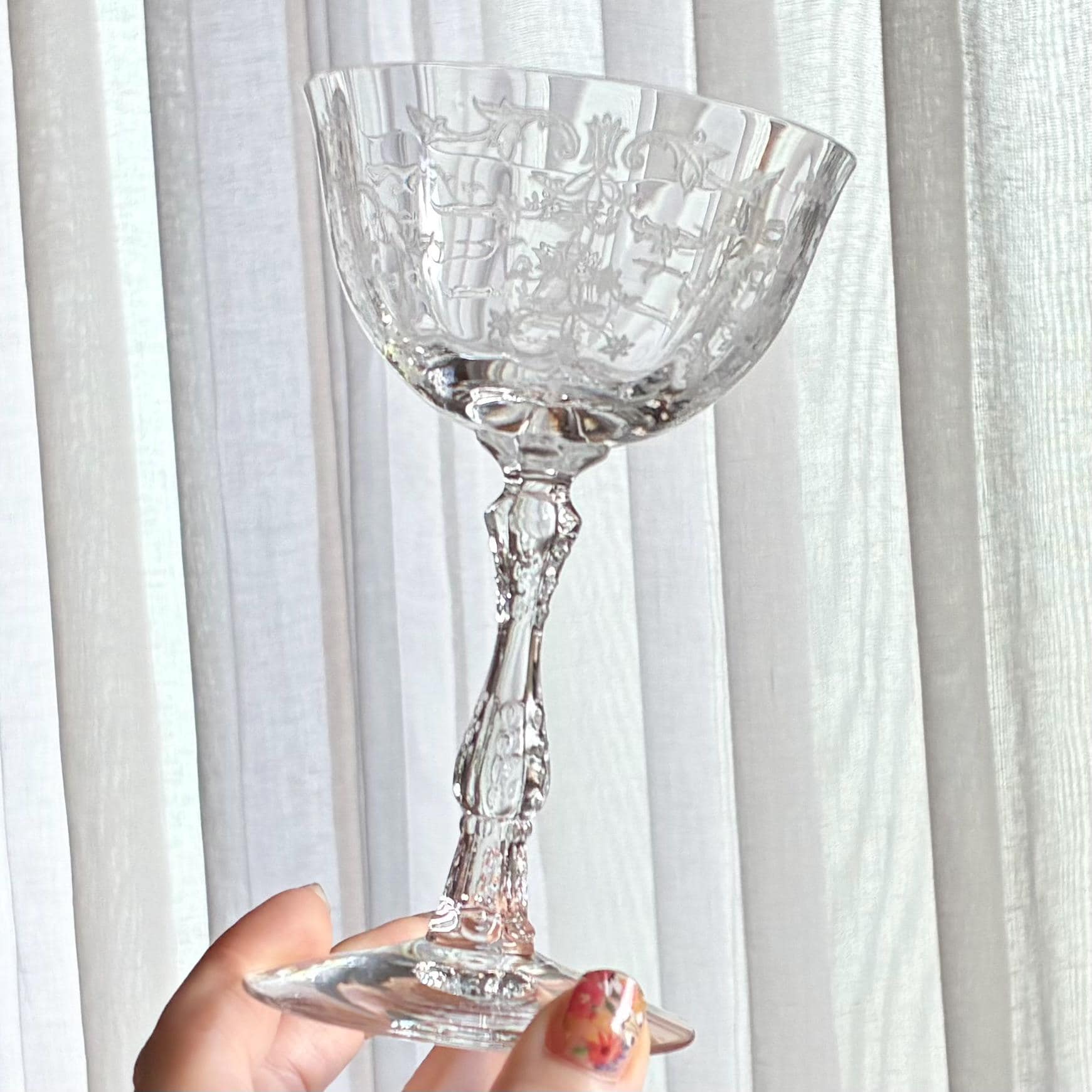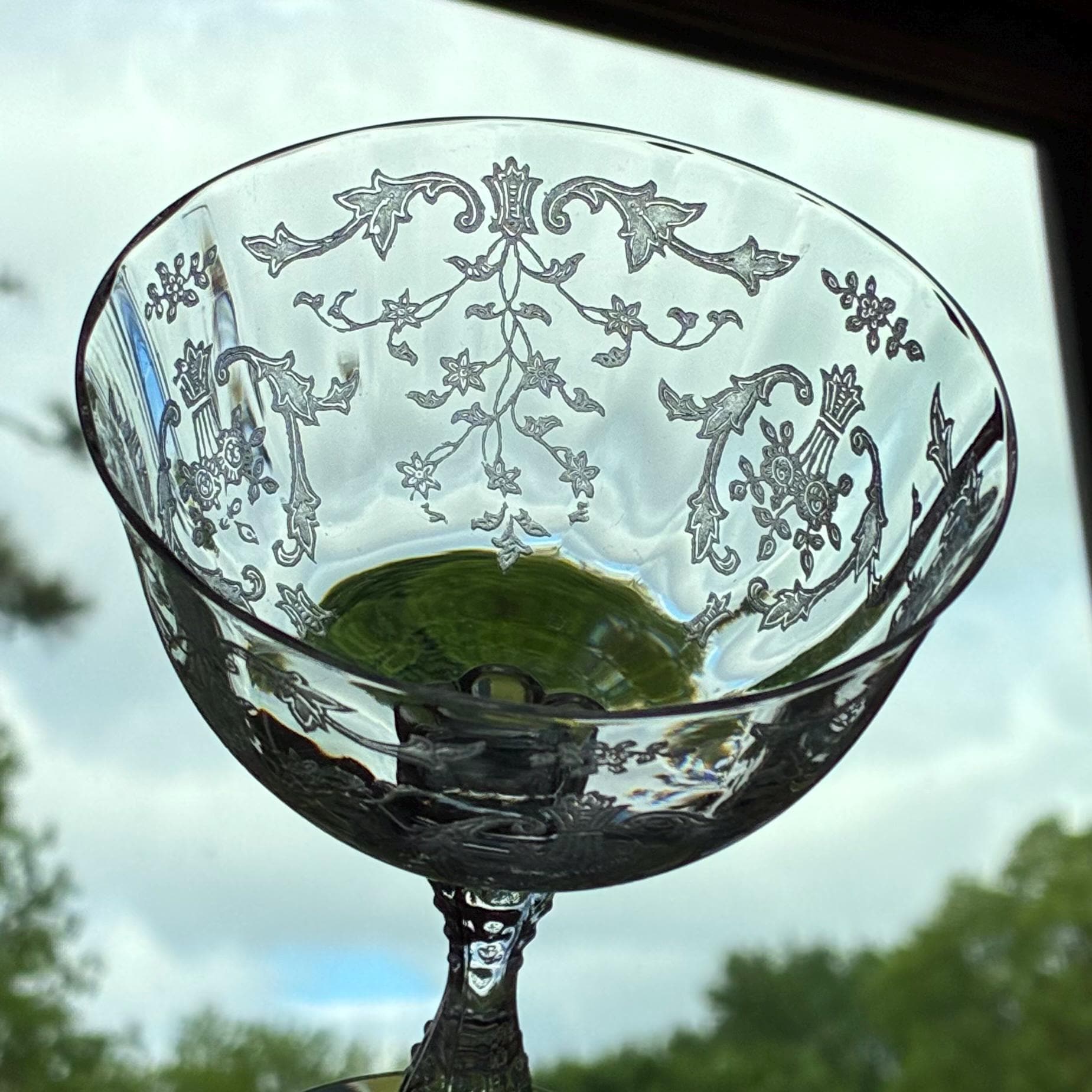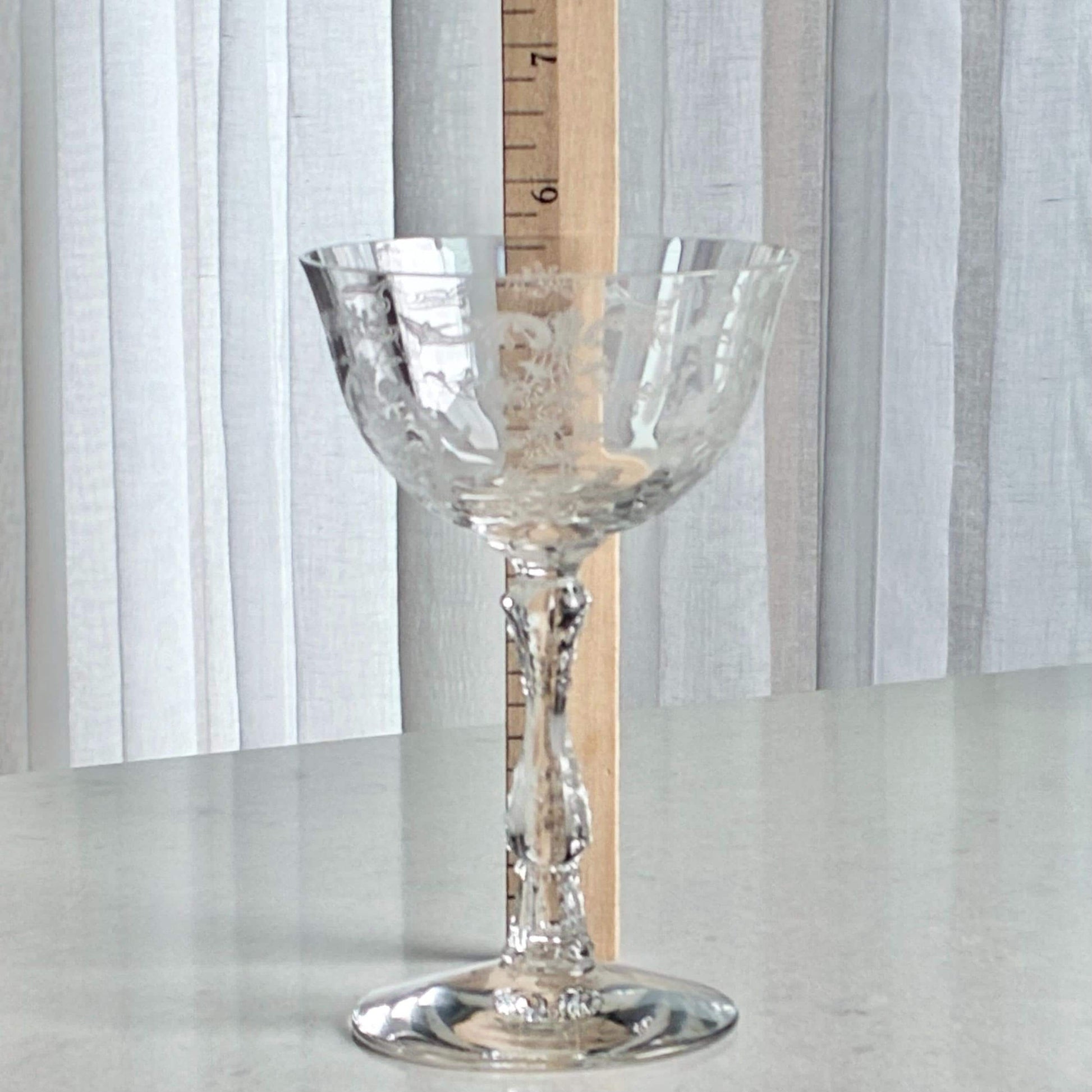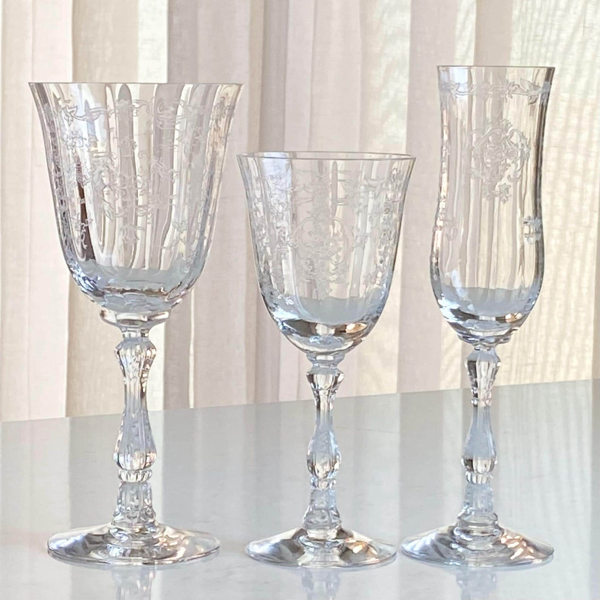 Set of six beautifully etched Fostoria Navarre glasses.