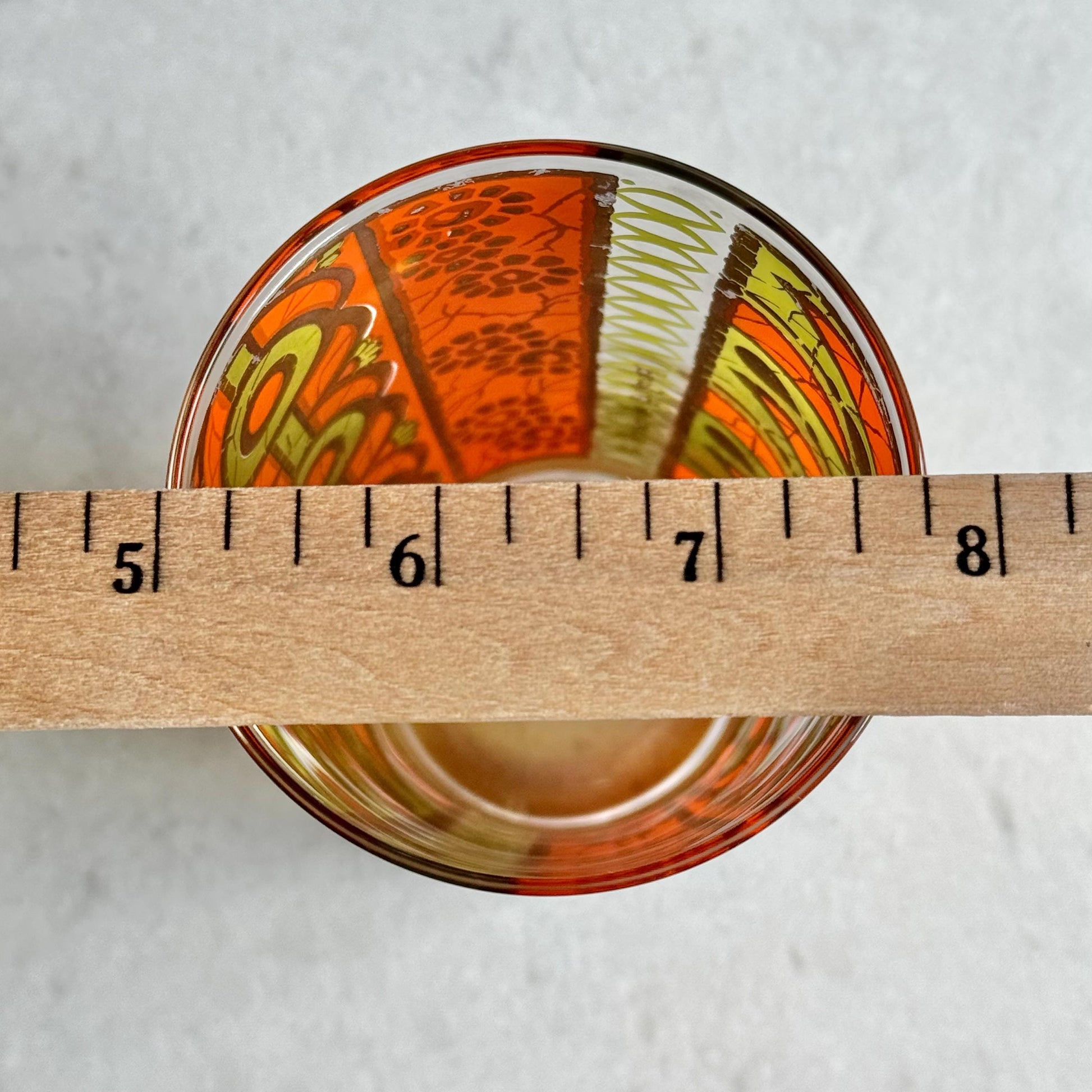 Approximately 5-5/8" tall and 2-3/4" across the rim with a capacity of about 12 ounces completely full. Excellent vintage condition.