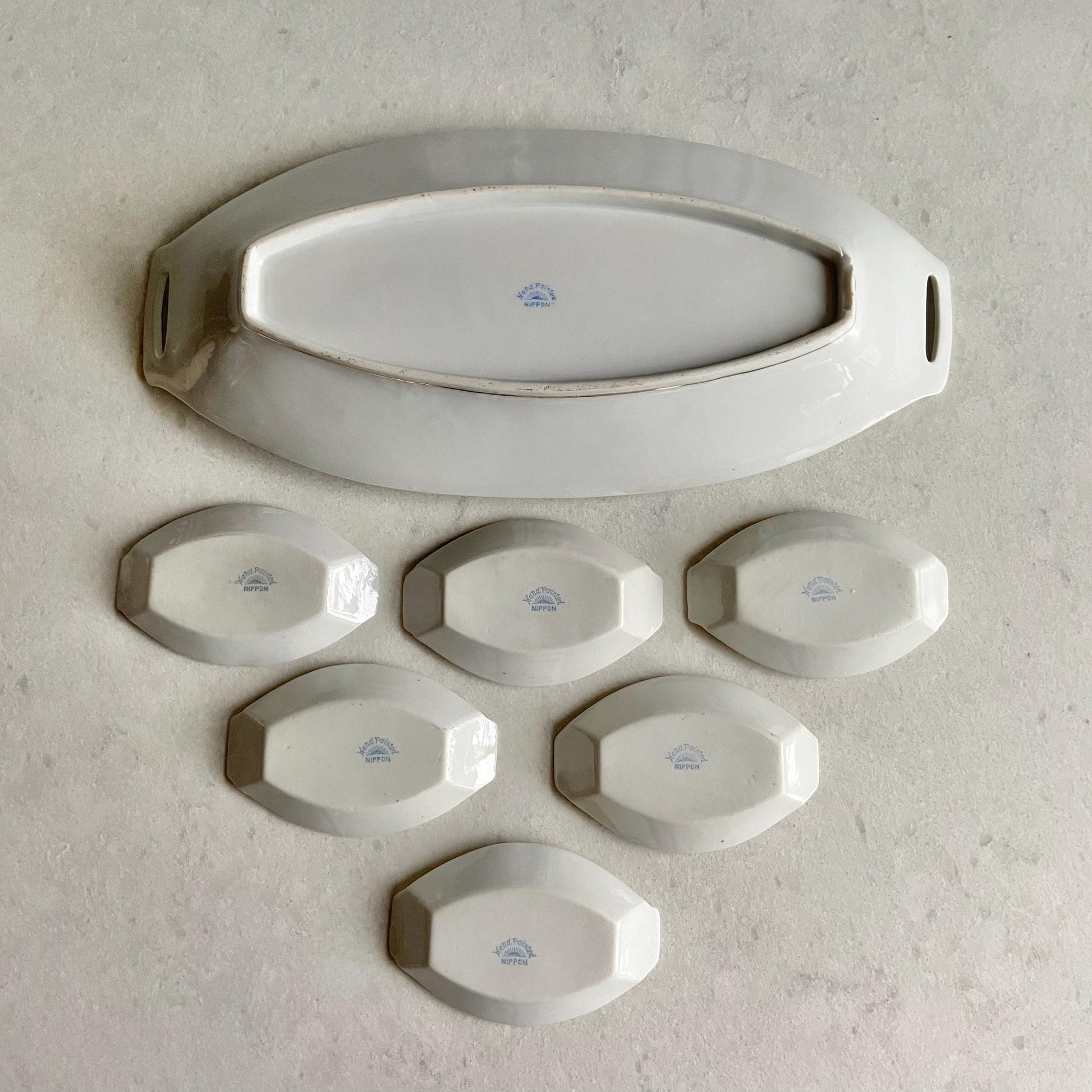 Vintage Gold Rimmed Hand Painted Nippon Celery Dish and Six (6) Sauce Dishes / Salt Cellars / Nut Dishes - Seven (7) Pieces Total