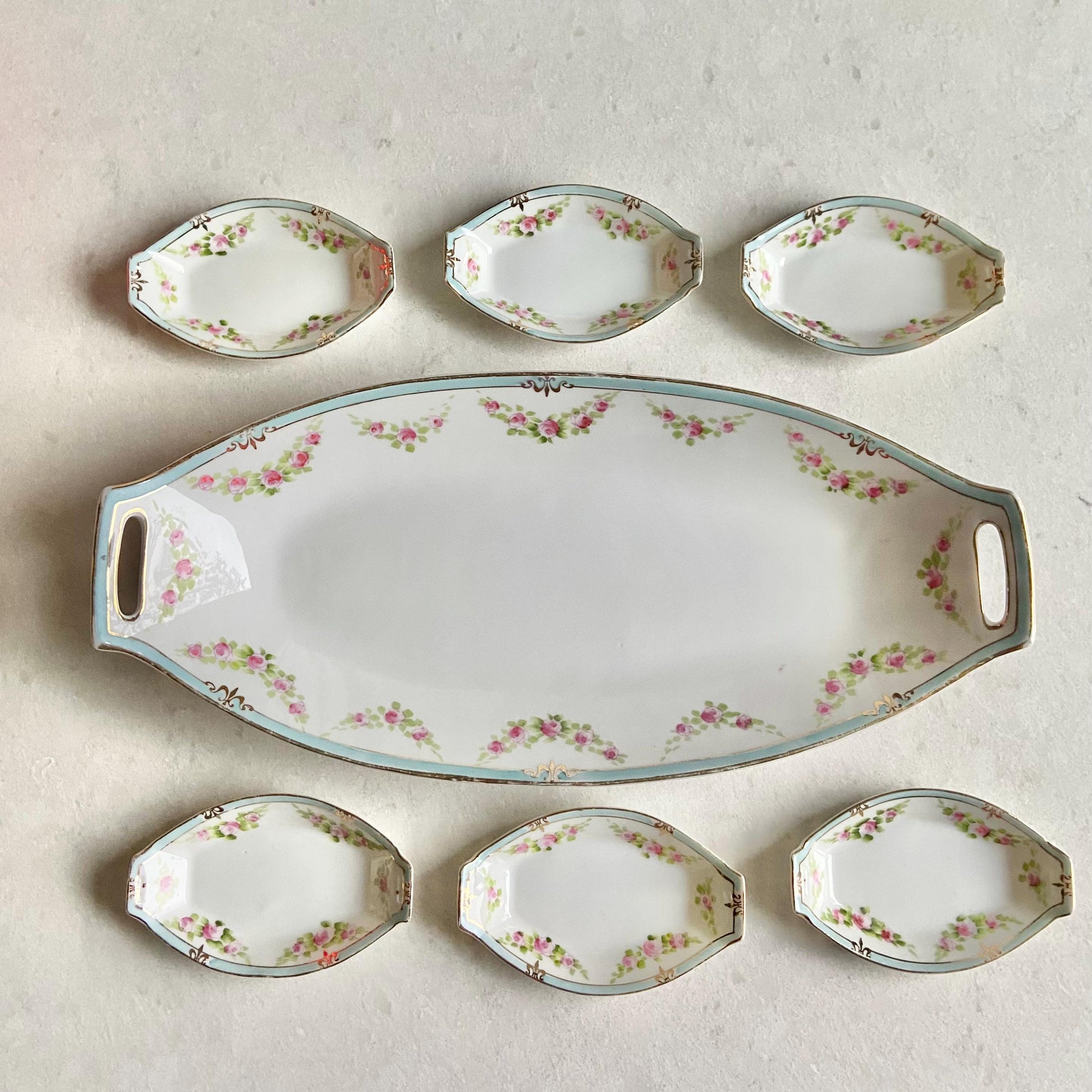 Lovely hand painted oval serving dish and set of six small dishes, perfect for salt, condiments, sauces, nuts, or small trinkets.