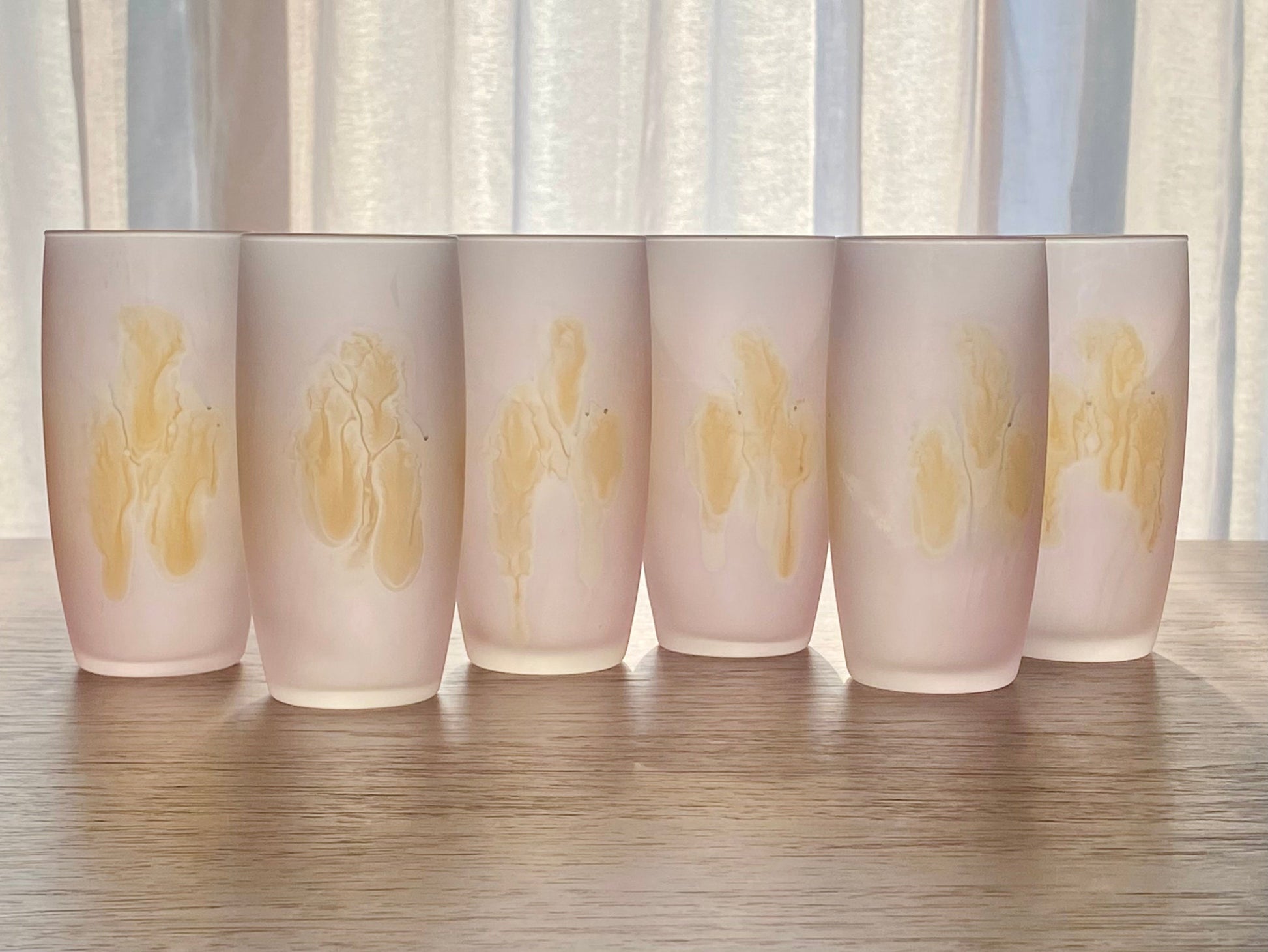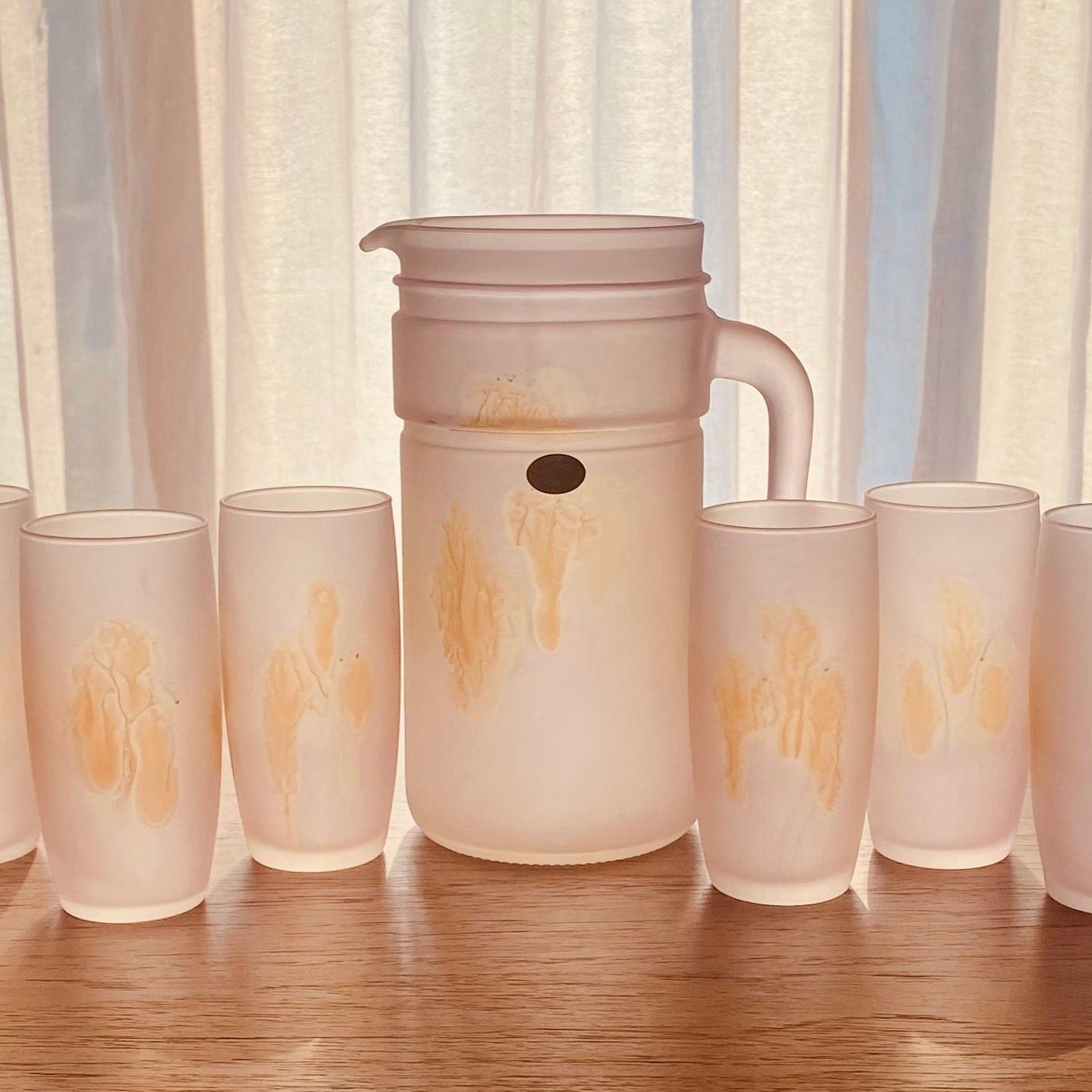 Vintage Hand Painted Frosted Art Glass Pitcher and Six (6) Glasses