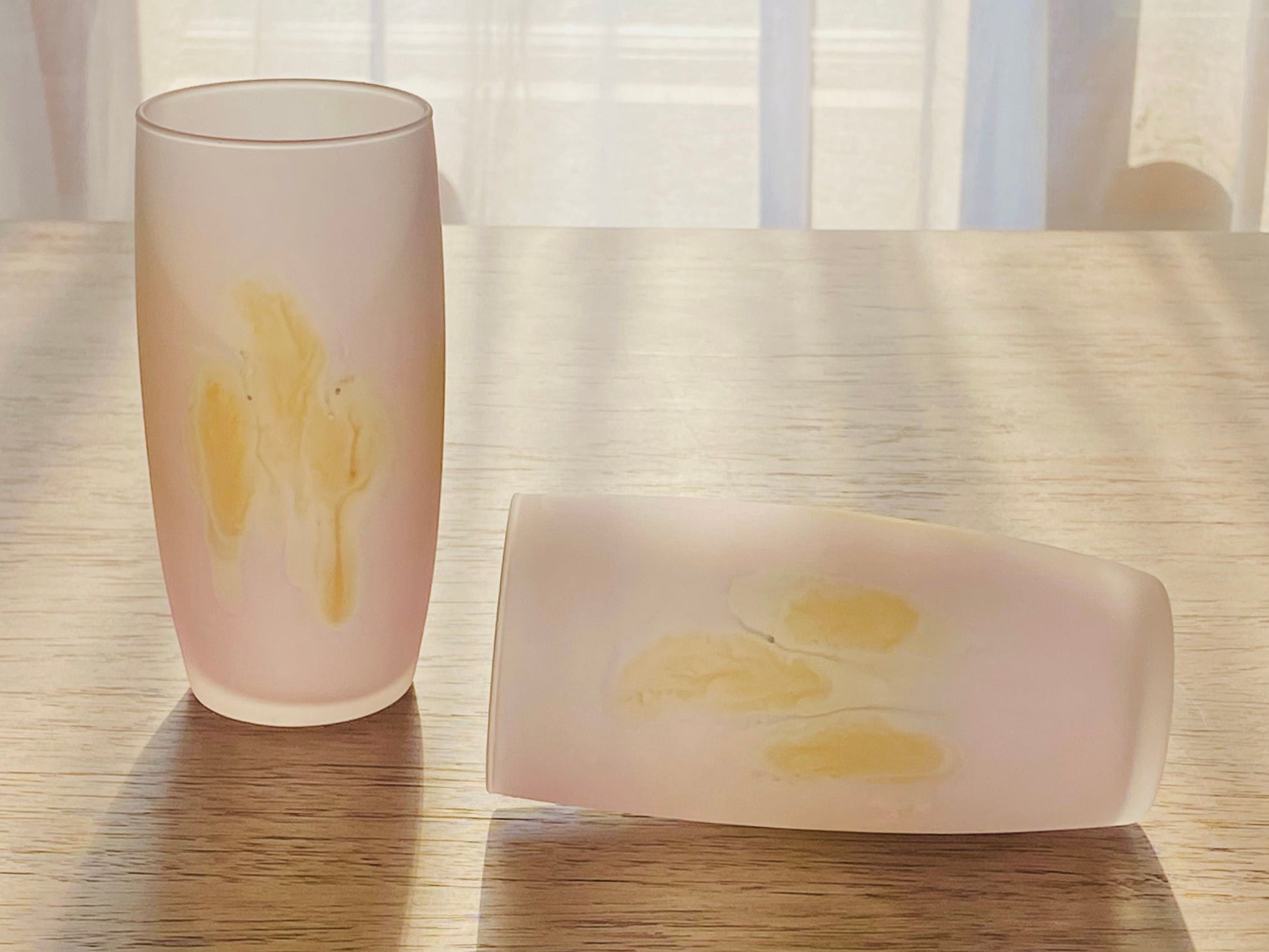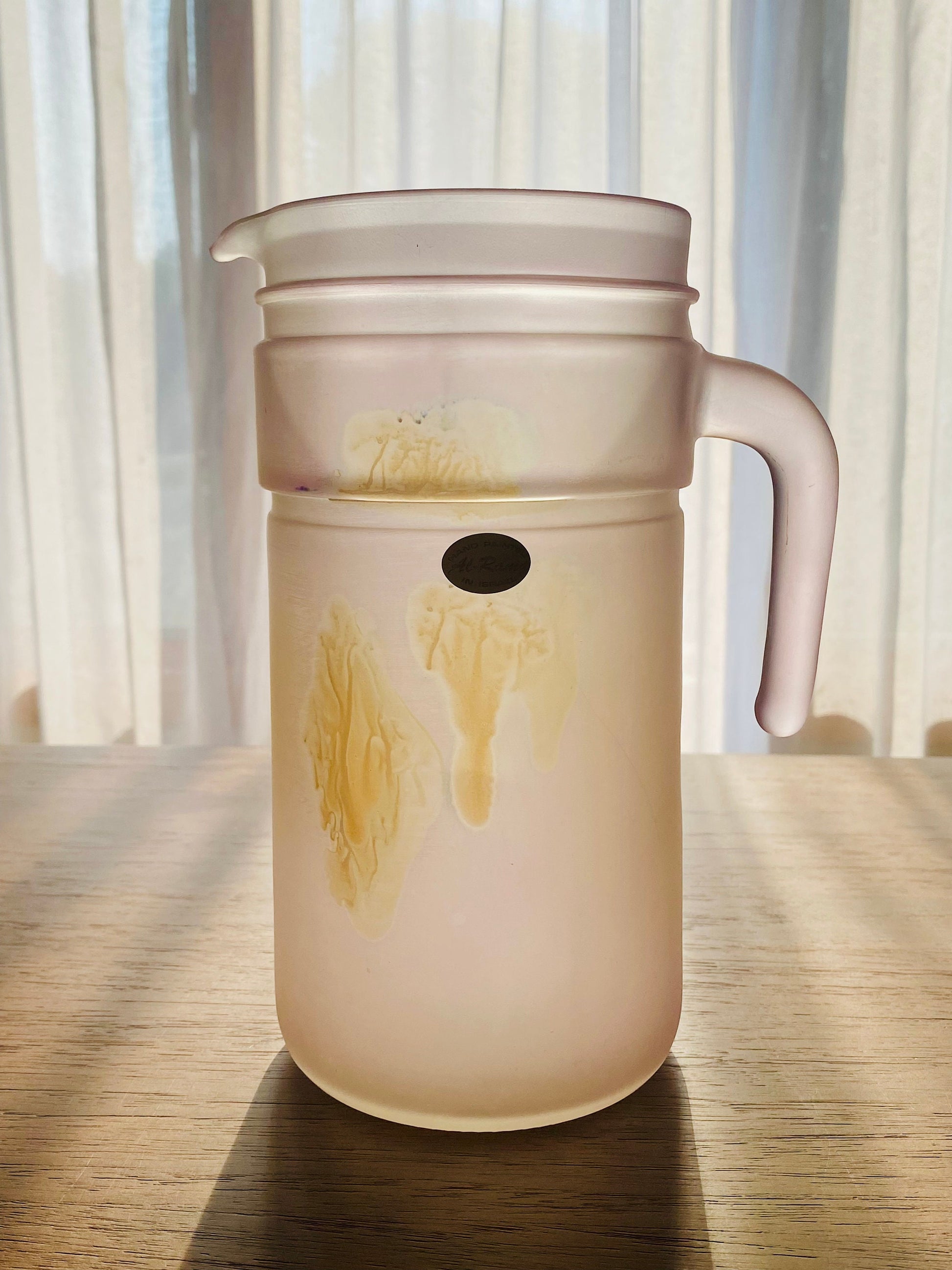 Gorgeous frosted pink hand painted pitcher and six glasses.