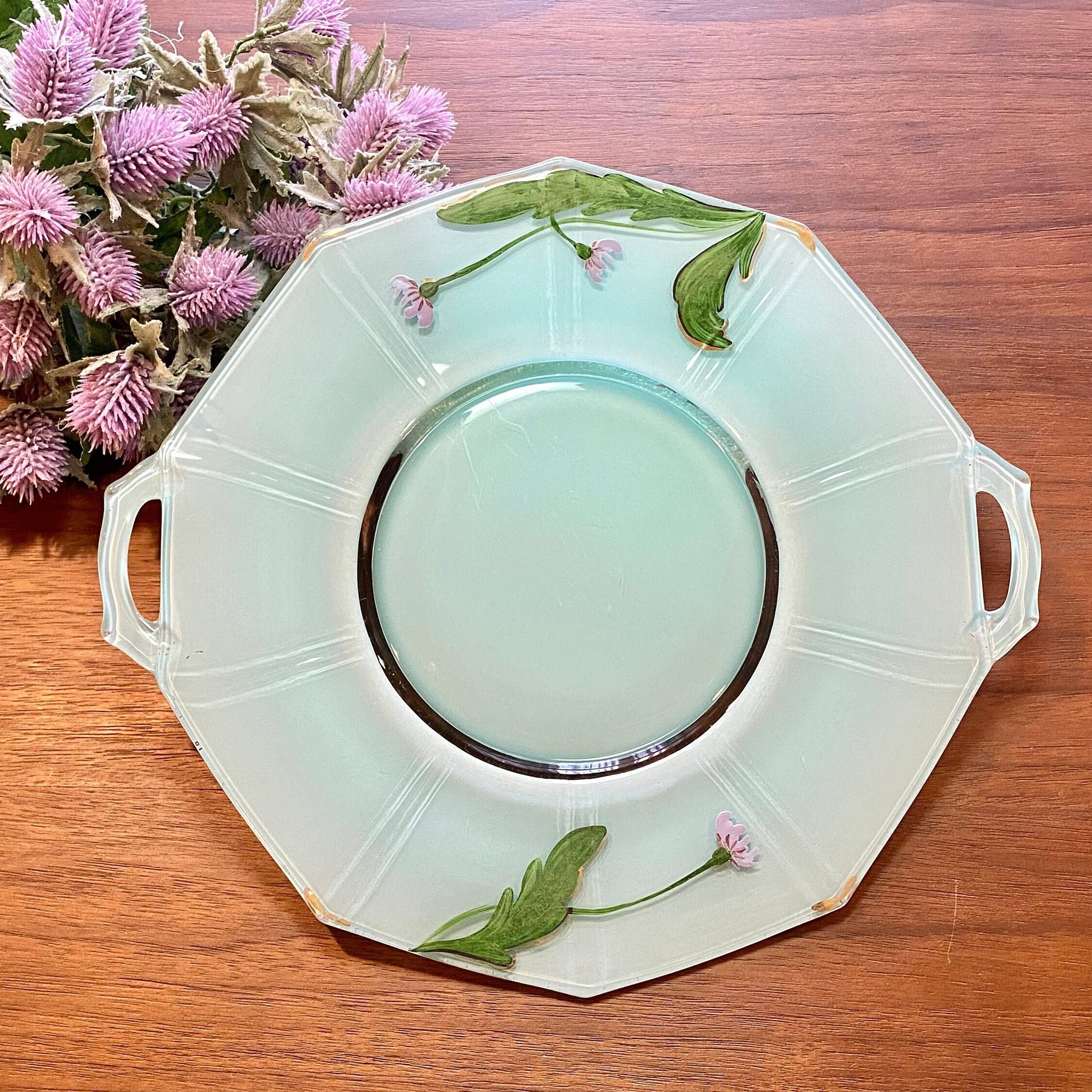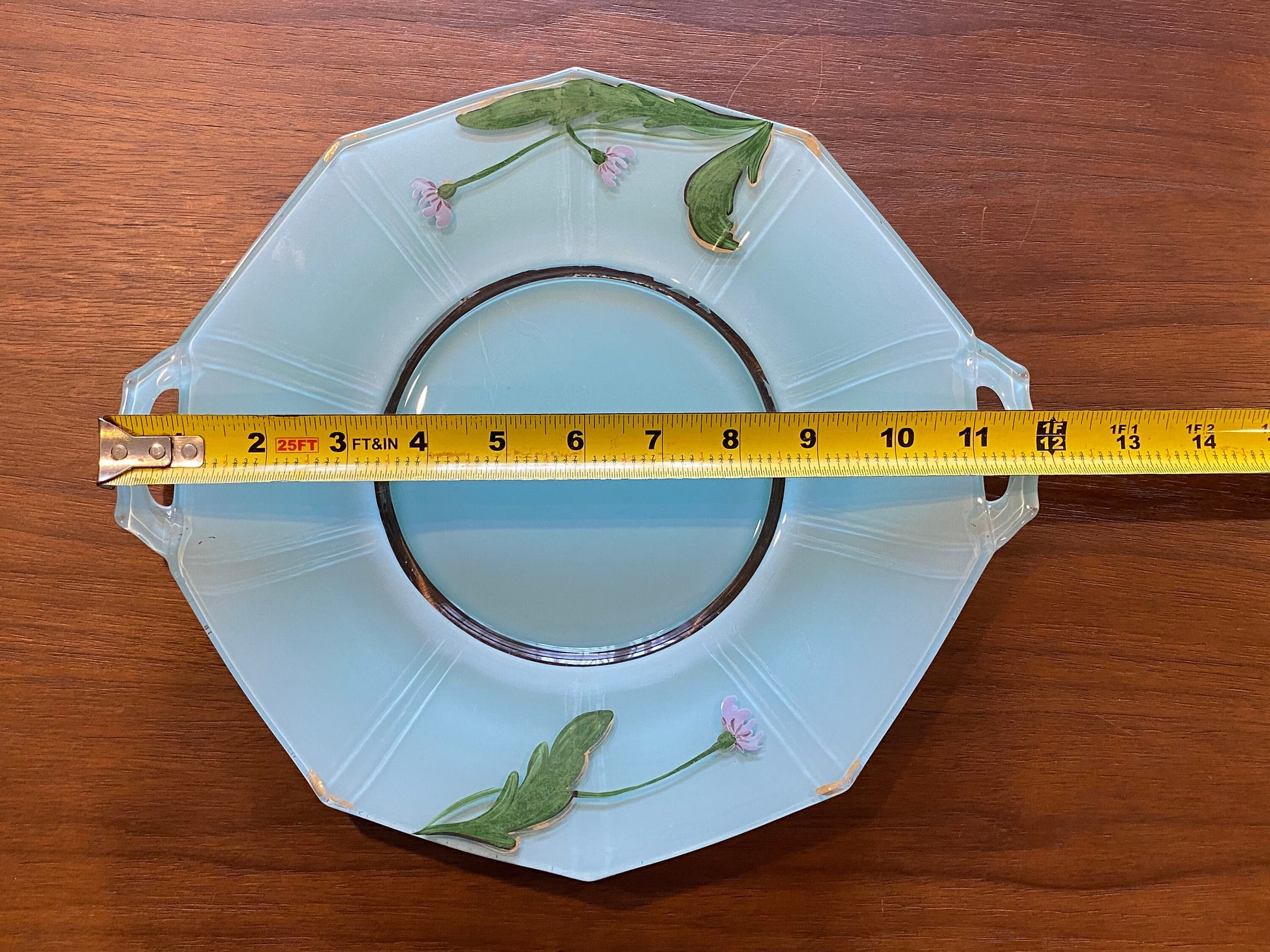 Beautiful vintage plate with hand painted flowers and an elegant shape. Approximately 12" across the handles.