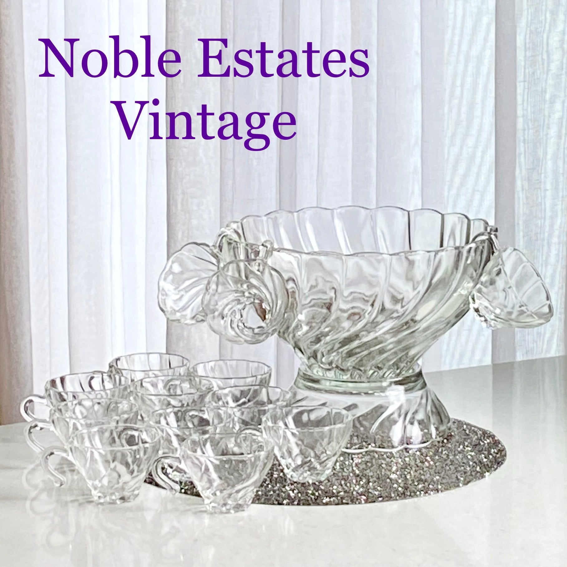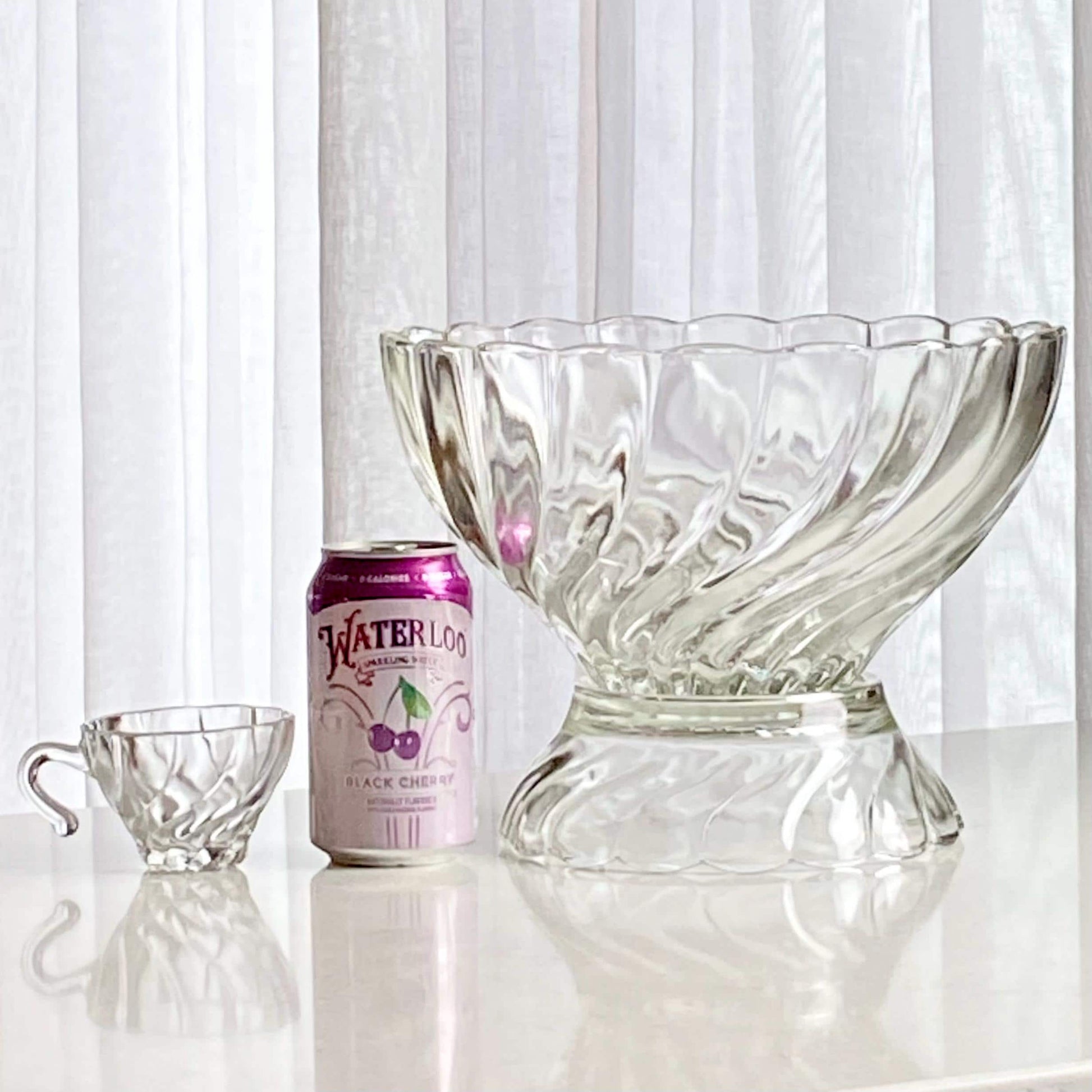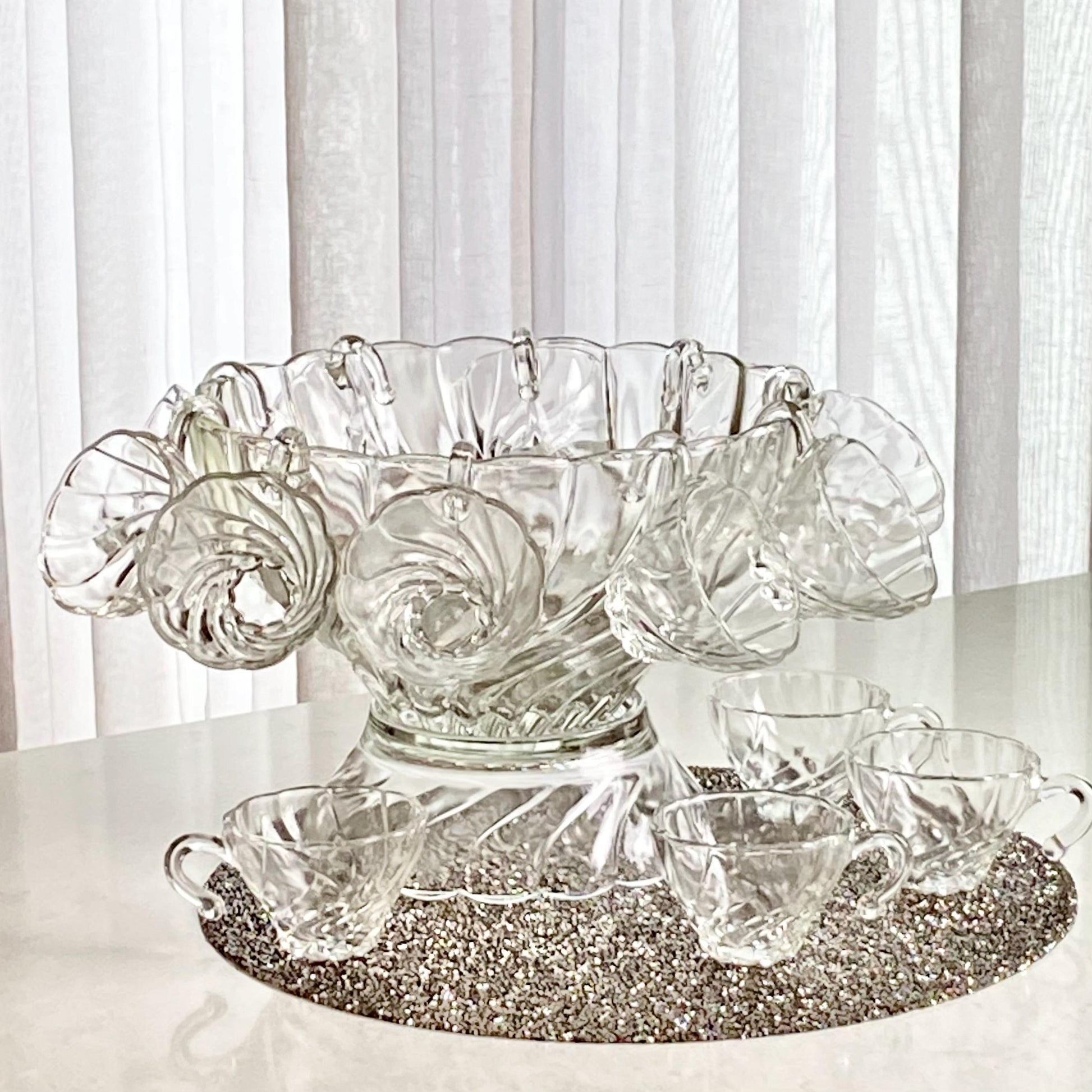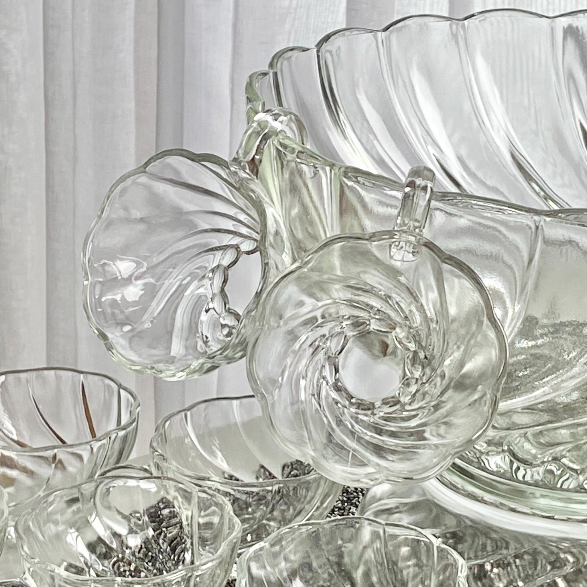Vintage Hazel Atlas Colonial Swirl Shell Punch Set Including the Bowl, Stand, and 14 Cups