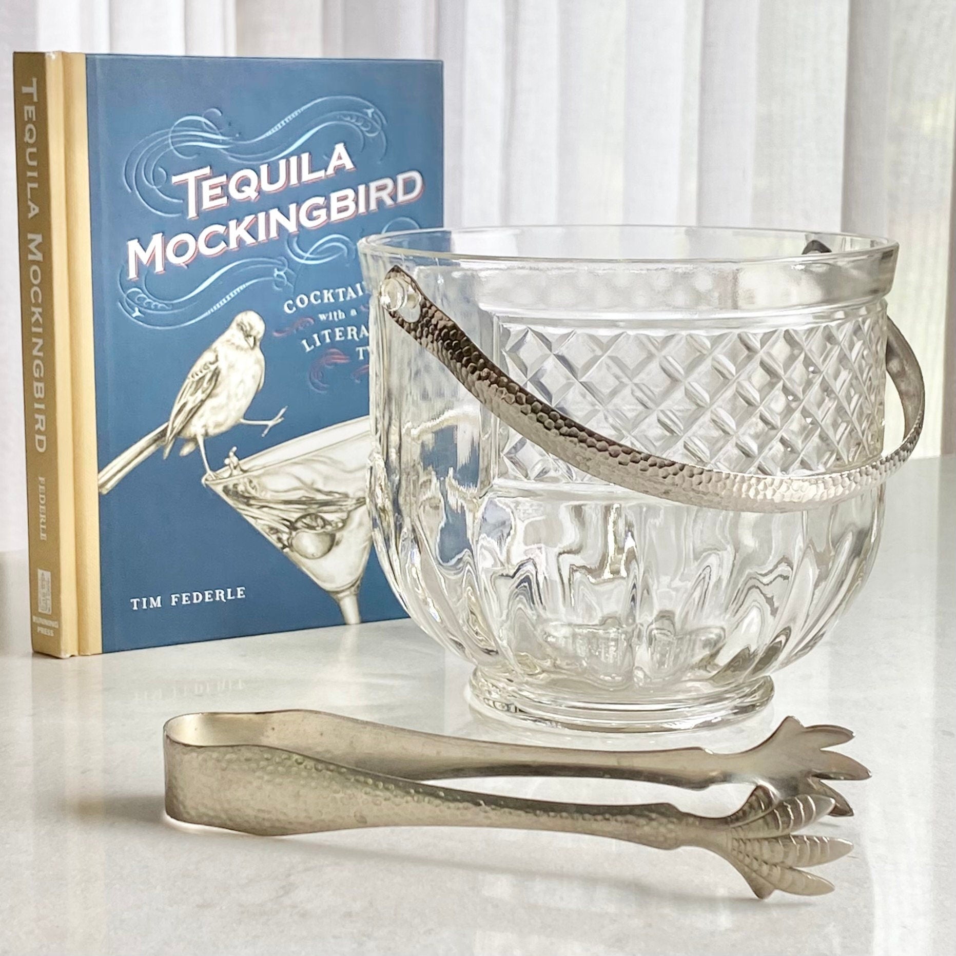 Lovely ice bucket with a hammered metal handle and matching tongs!