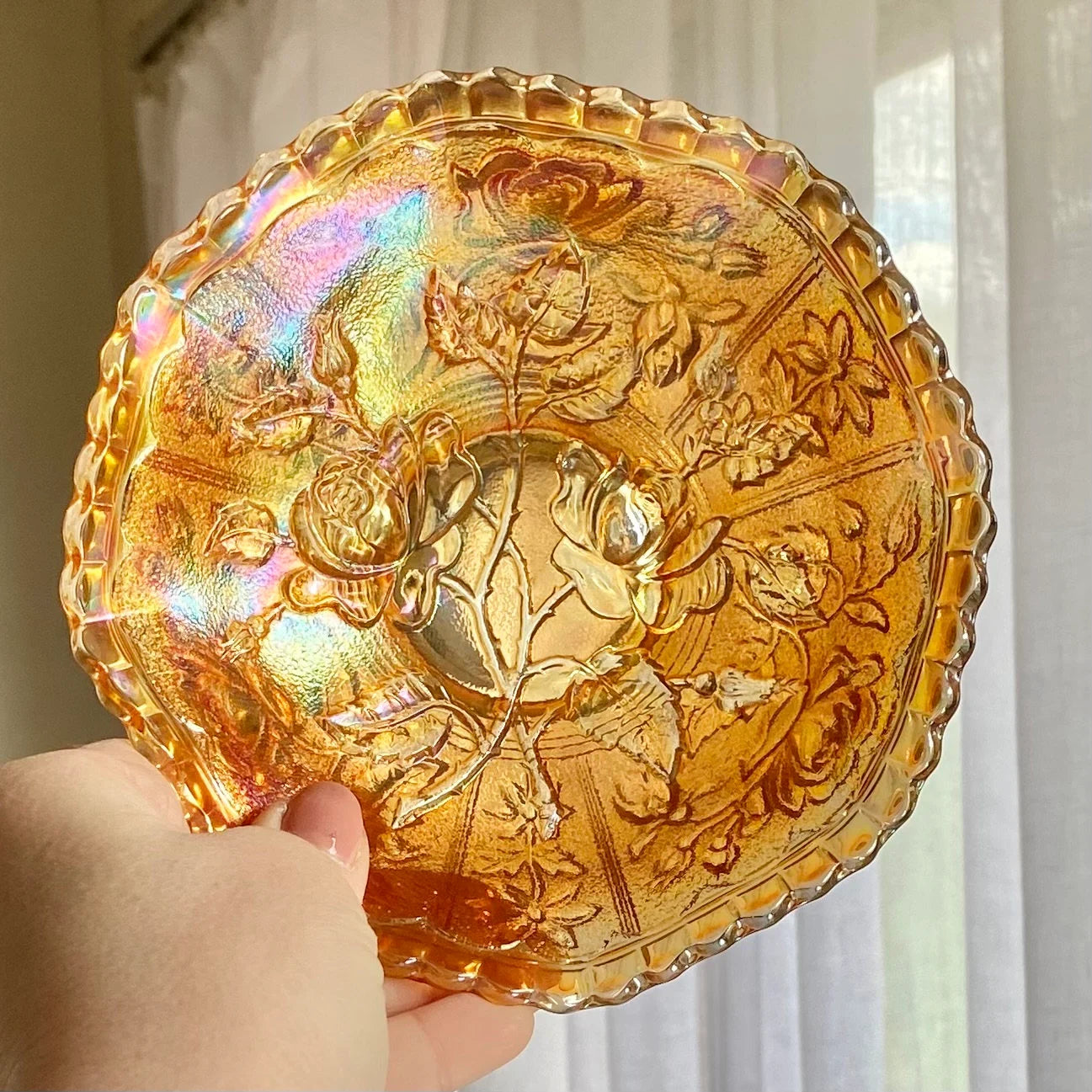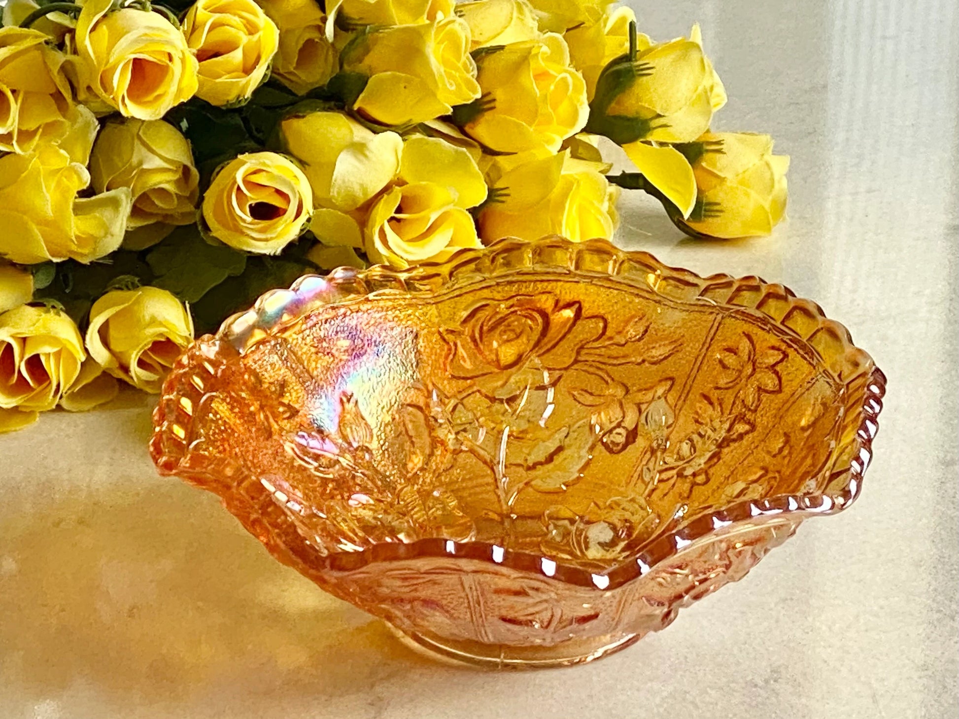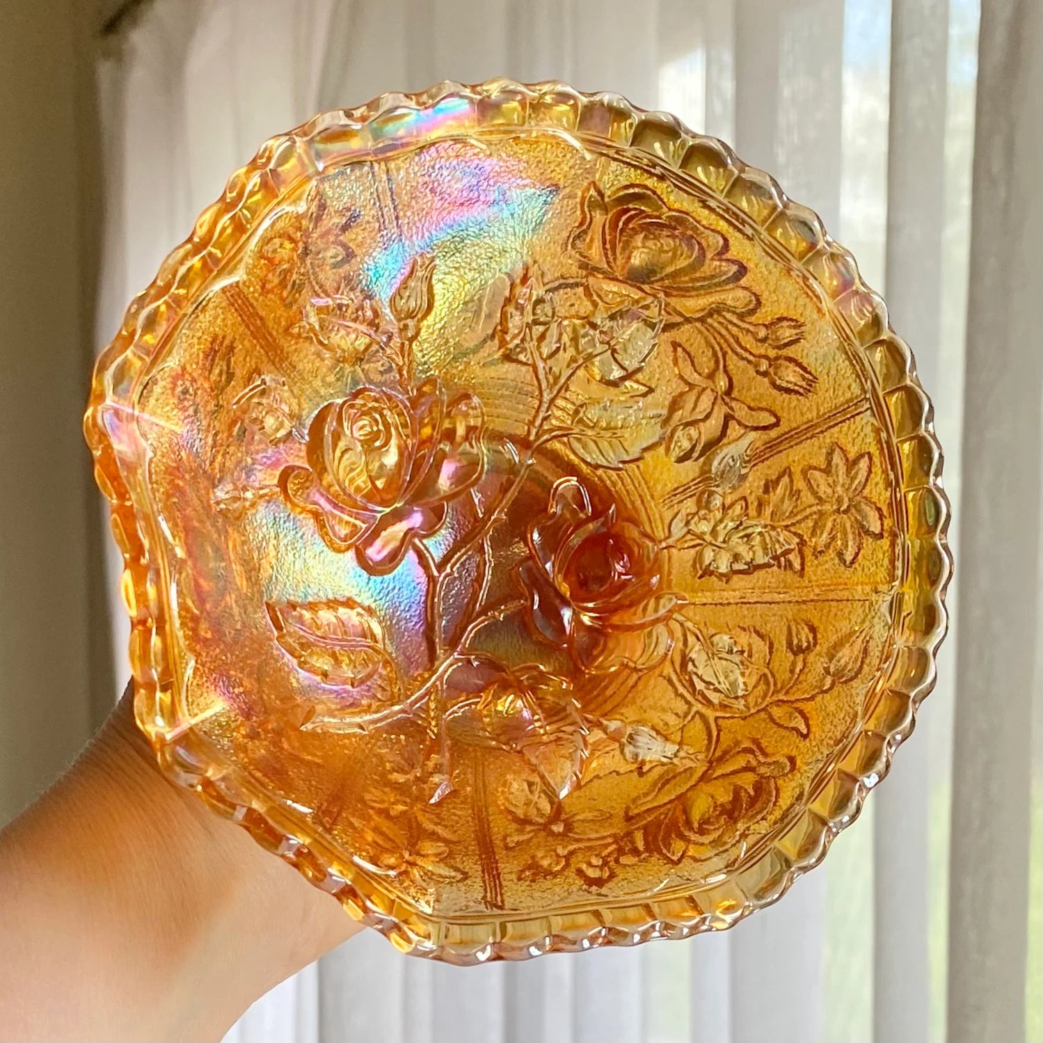 Beautiful iridescent carnival glass bowl featuring a lovely rose motif.