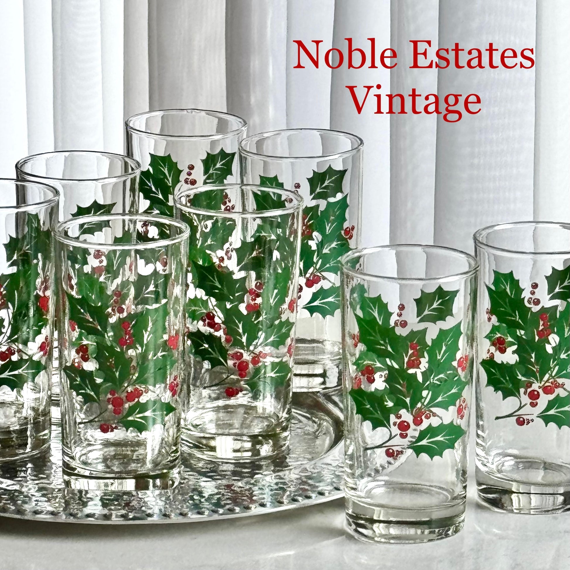 Set of 8 festive glasses. Approximately 5-1/2" tall and 2-3/4" across the rim with a capacity of about 12 ounces completely full. Excellent vintage condition, with slight variations among the glasses typical of these pieces. There is also a smaller version of these glasses available and listed separately. FREE SHIPPING in the continental U.S. included in the price. If you are outside of this area please contact me for options. Any props used are for photo purposes only and are not included with the items being sold.