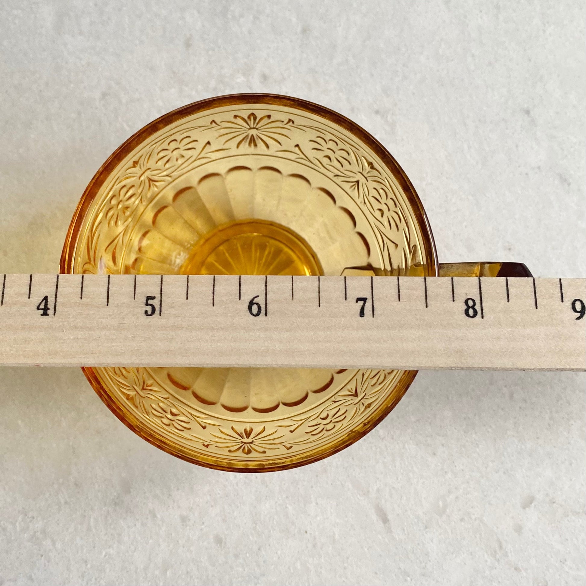 Saucers are approximately 6" across and cups have a capacity of about 7 ounces completely full. Please see the last photo for the rim of one cup.