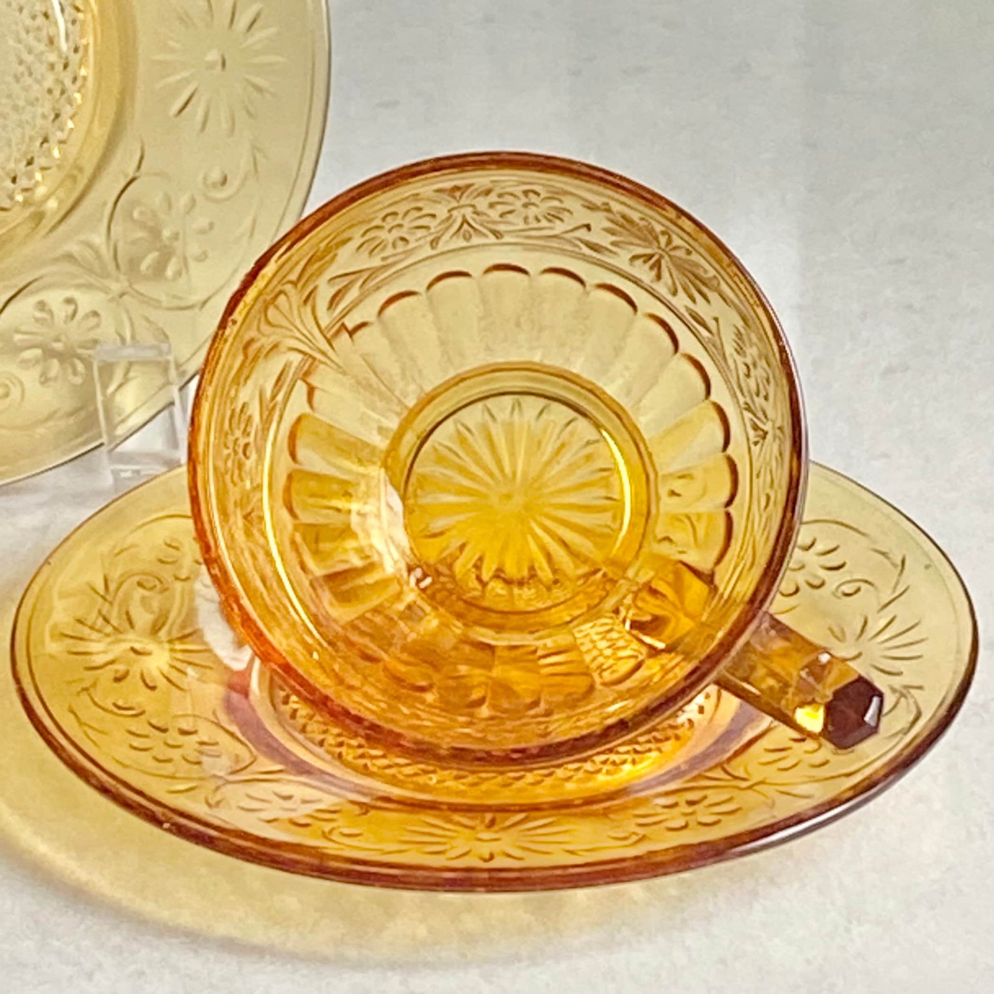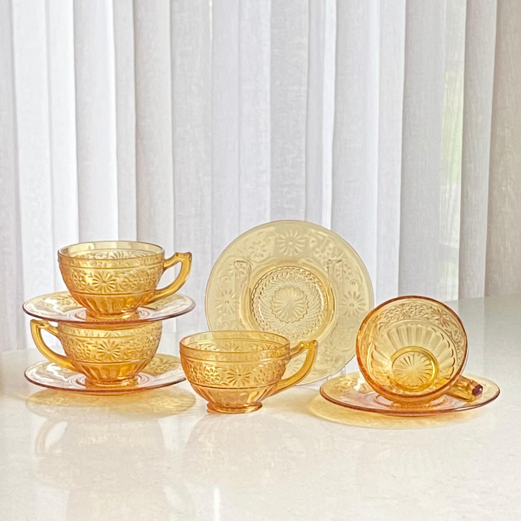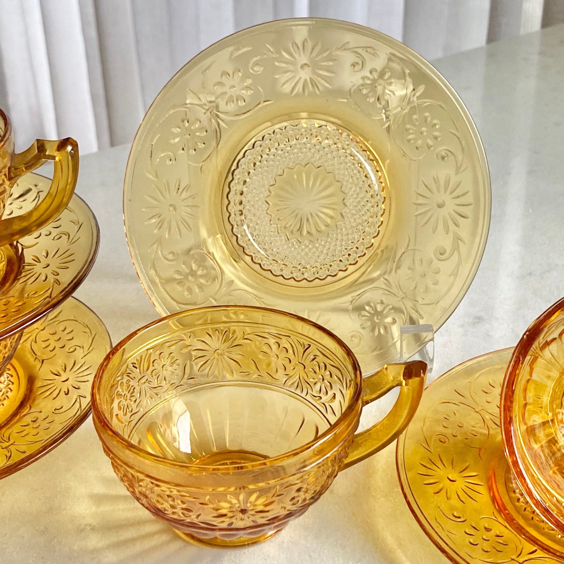 Vintage Indiana Glass Daisy Amber Cups and Saucers - 4 sets, 8 pieces total