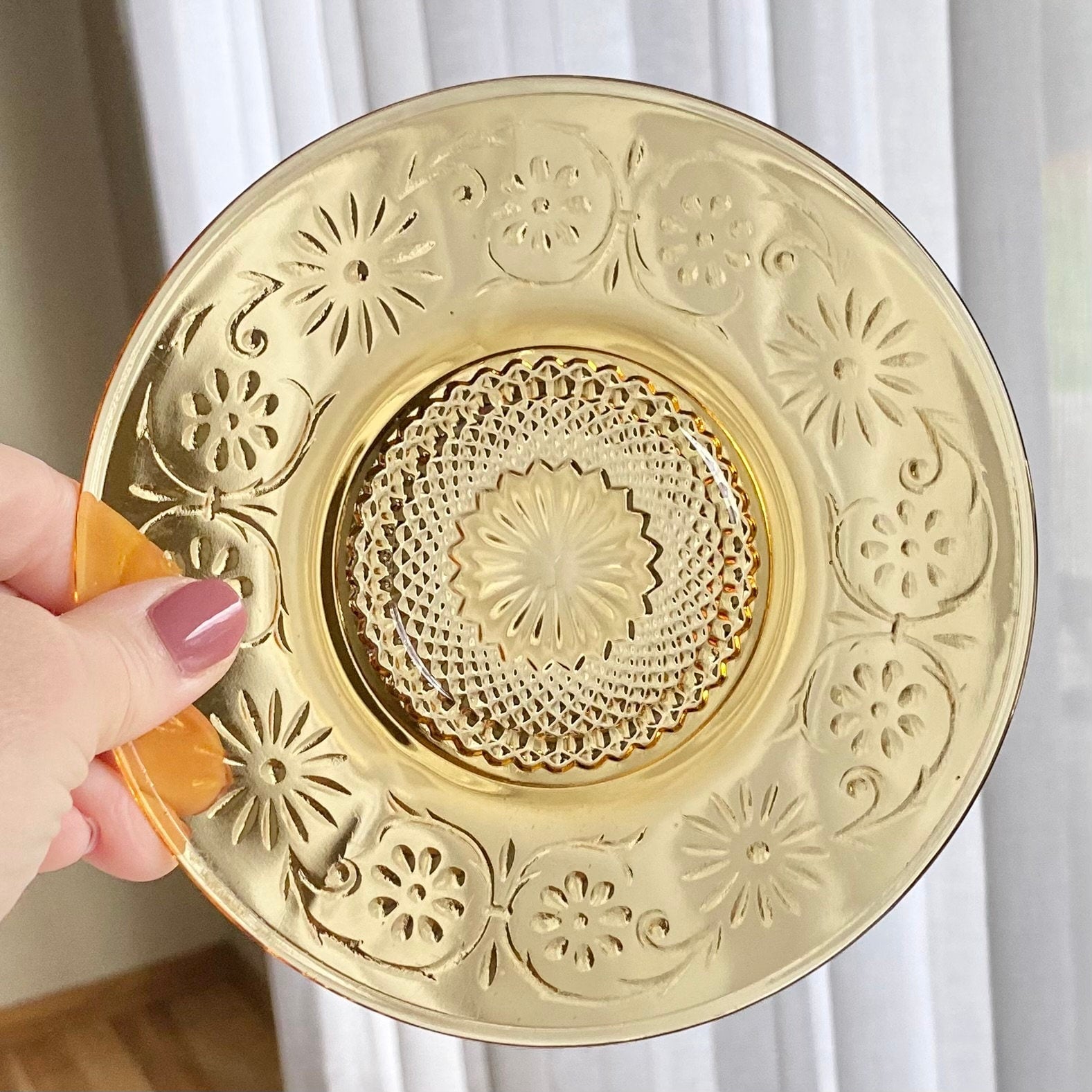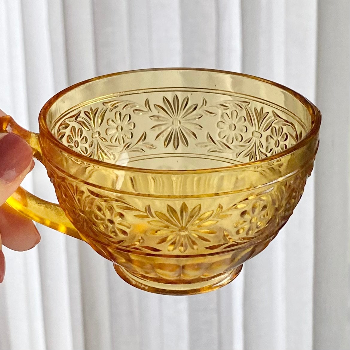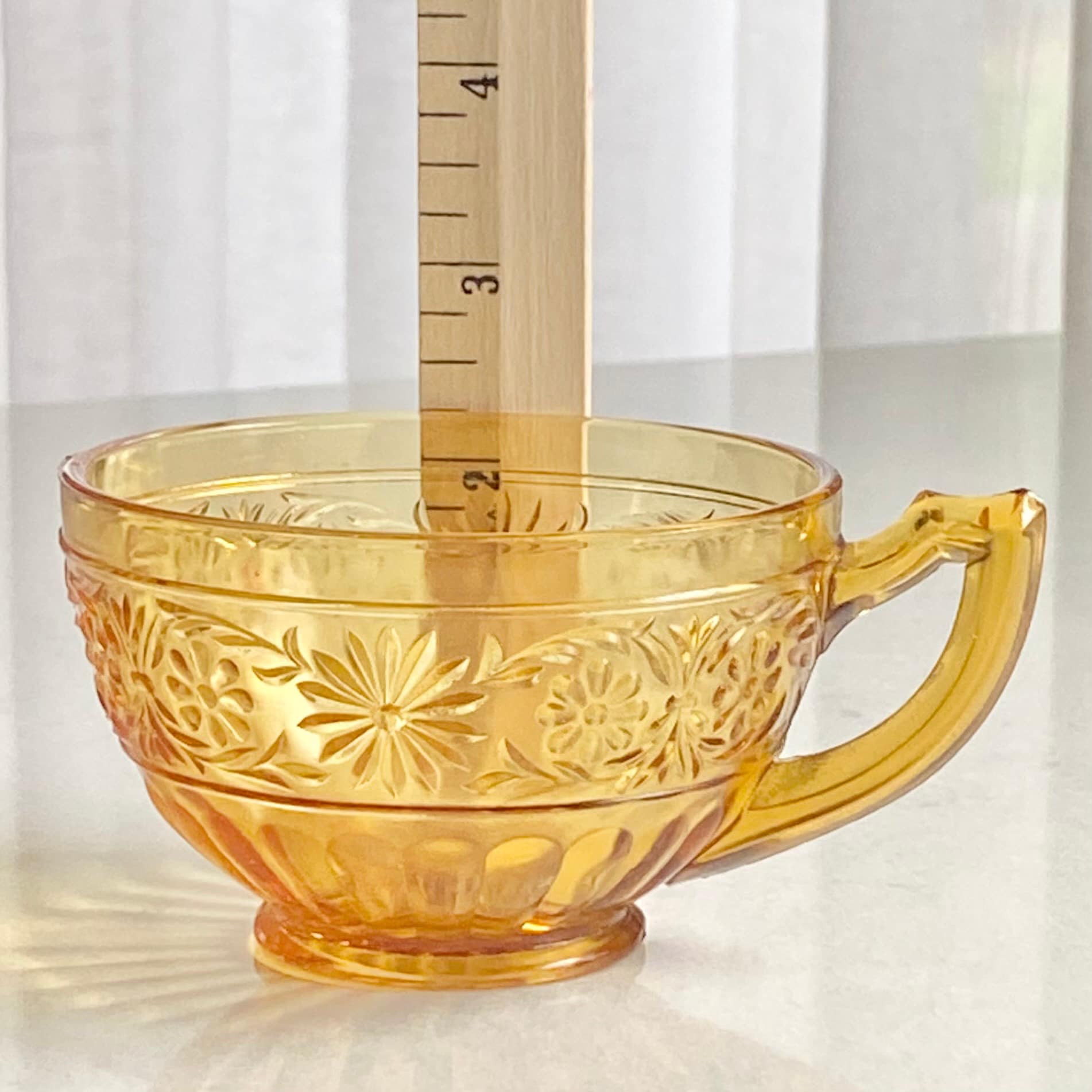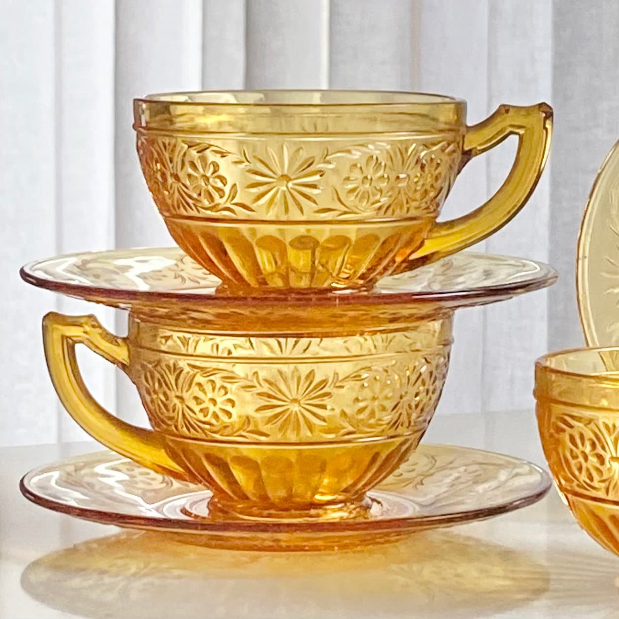 Vintage Indiana Glass Daisy Amber Cups and Saucers - 4 sets, 8 pieces total