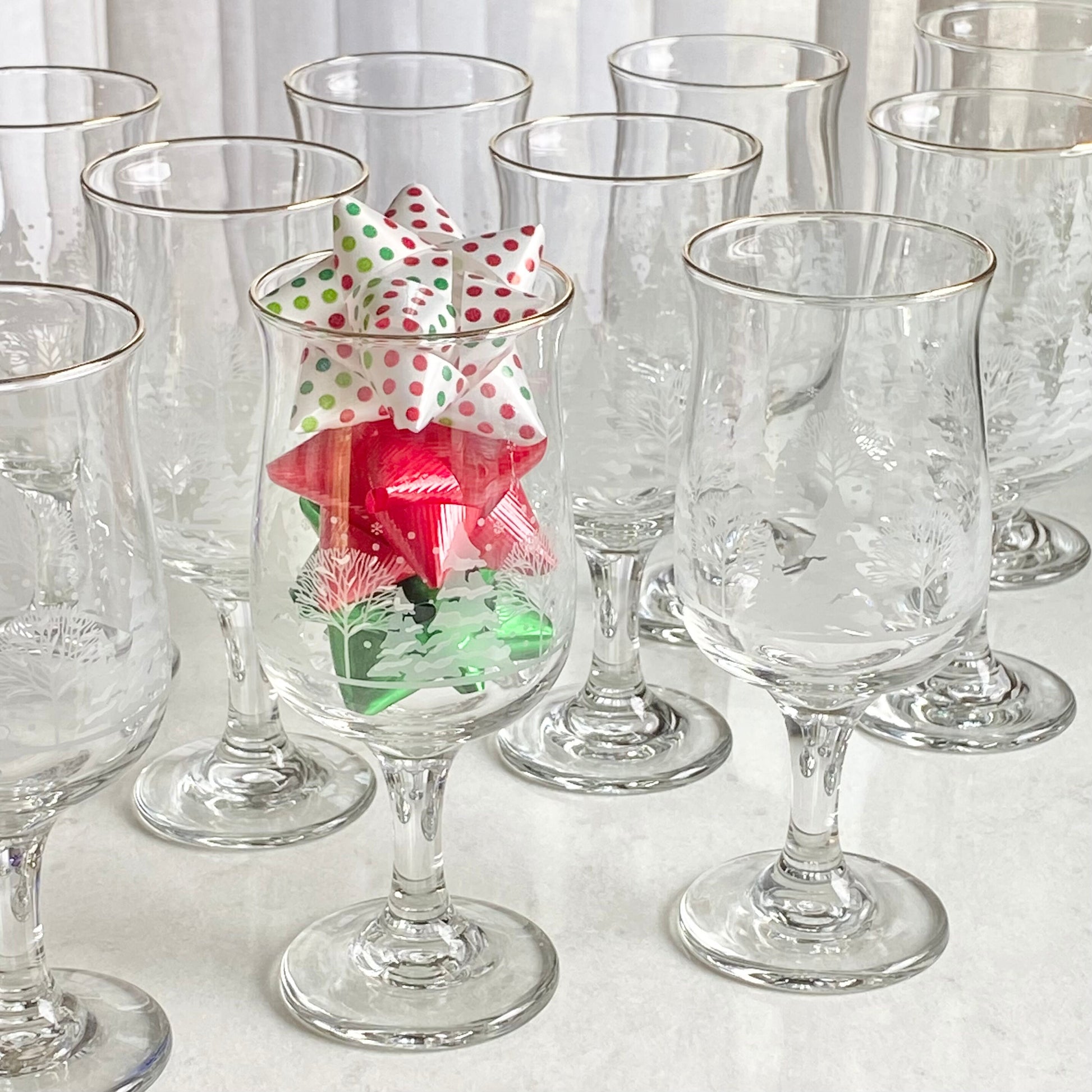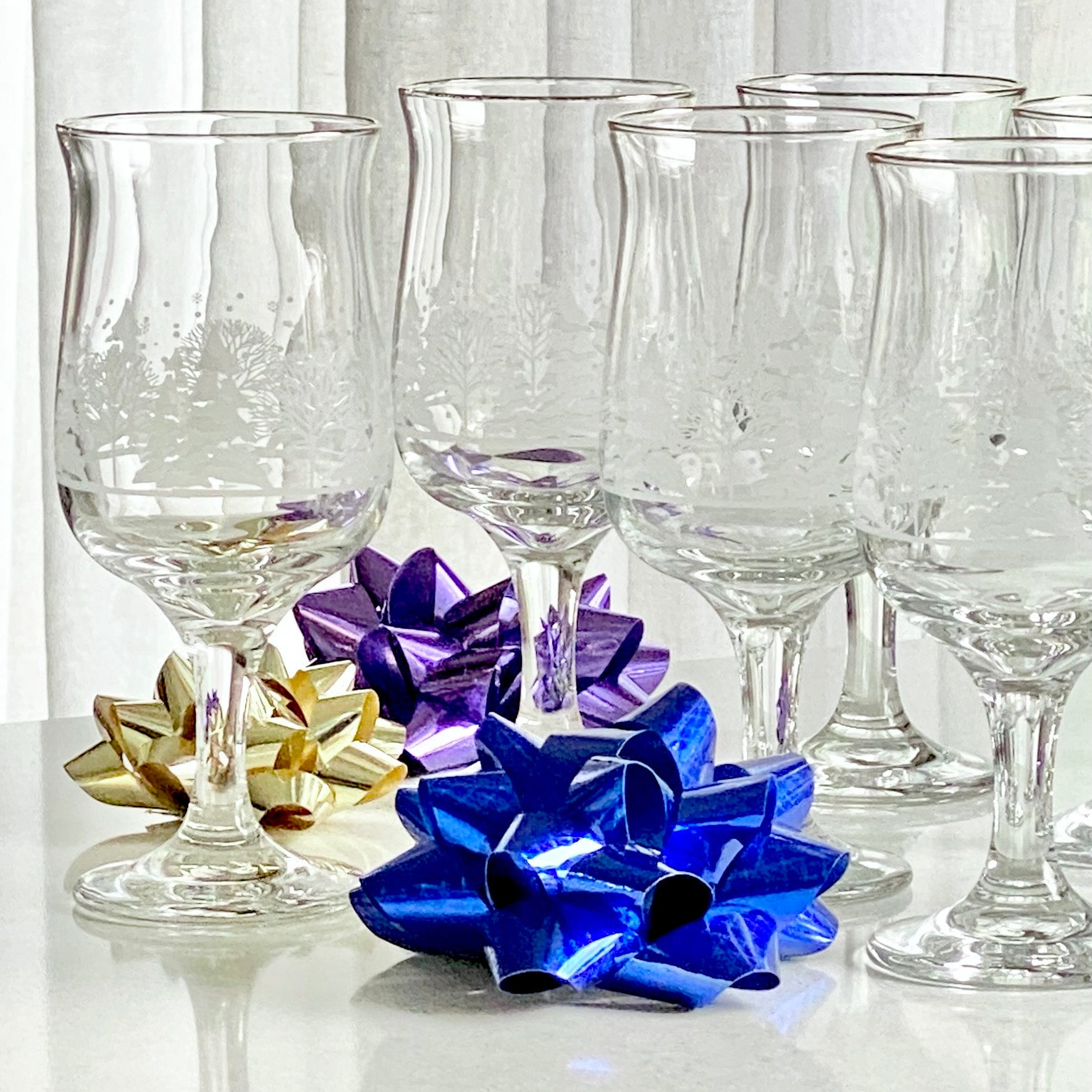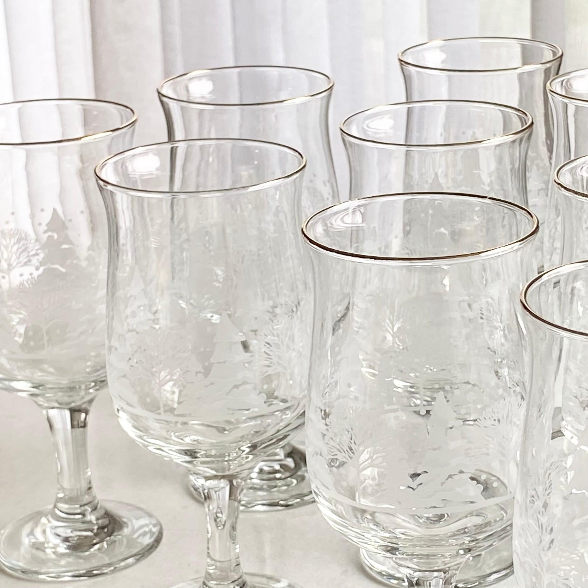Festive glasses with a festive snowy landscape and tree motif. There are 18 available. Using the menu you can choose a set of 8, a set of 10, or get all 18 at a discount. Approximately 7" tall and 2-3/4" across the rim with a capacity of about 12 ounces completely full. Excellent vintage condition. There are two other styles of these glasses available as shown in the last photo and listed separately. Free shipping in the continental U.S. included in the price. If you are outside of this area please contact me for options. Any props used or other items shown are for photo purposes only and are not included with the items being sold.