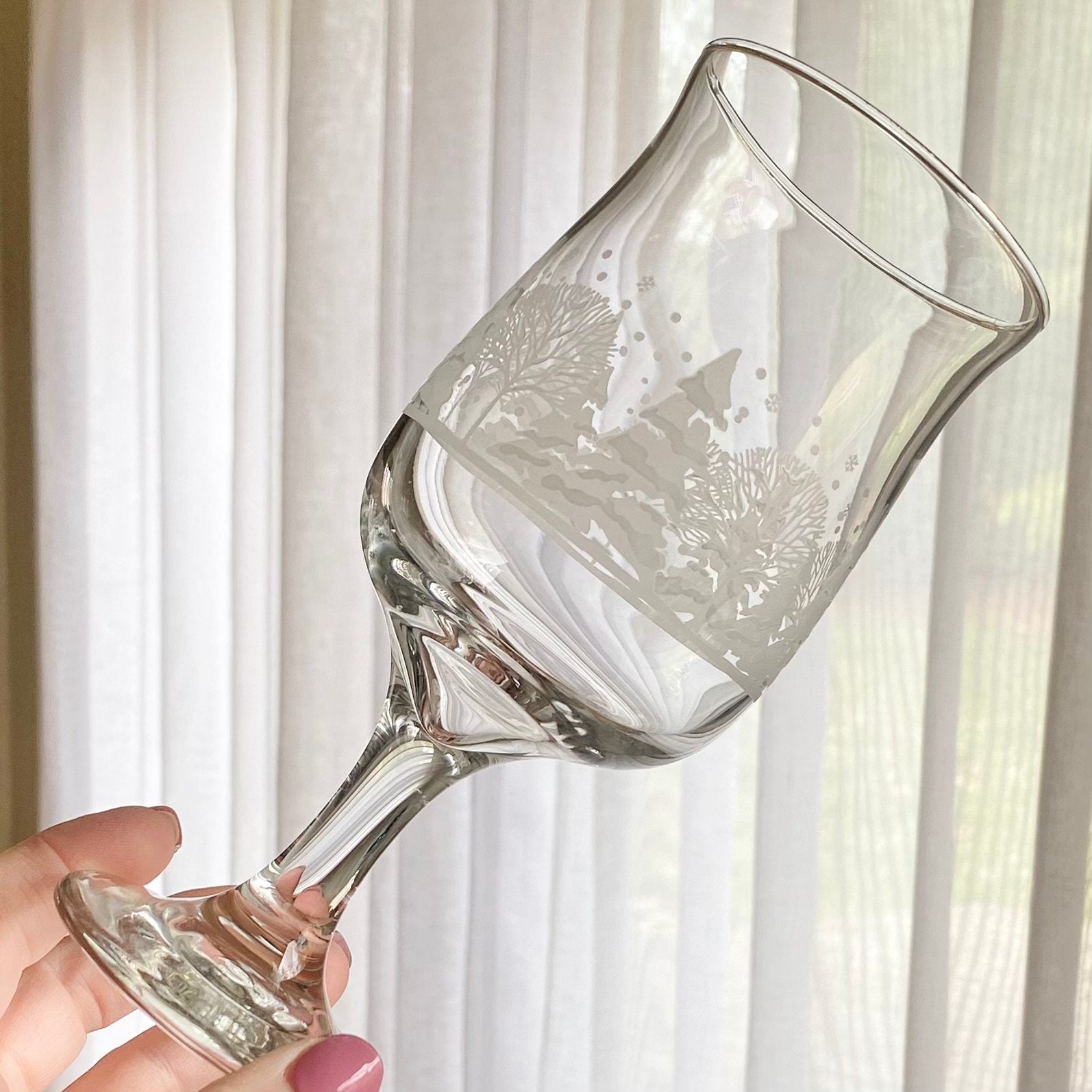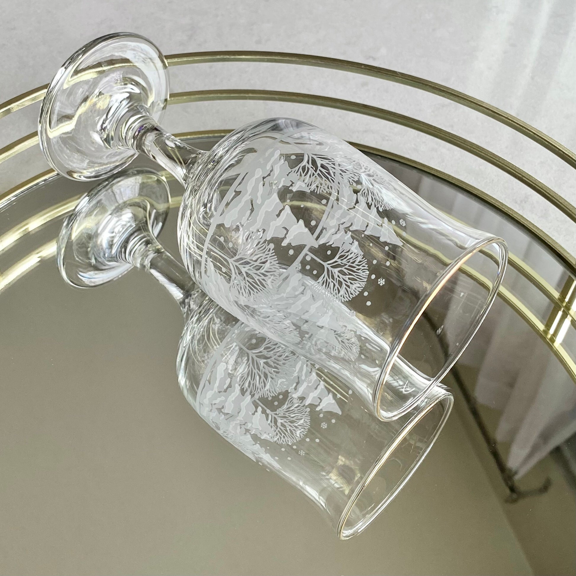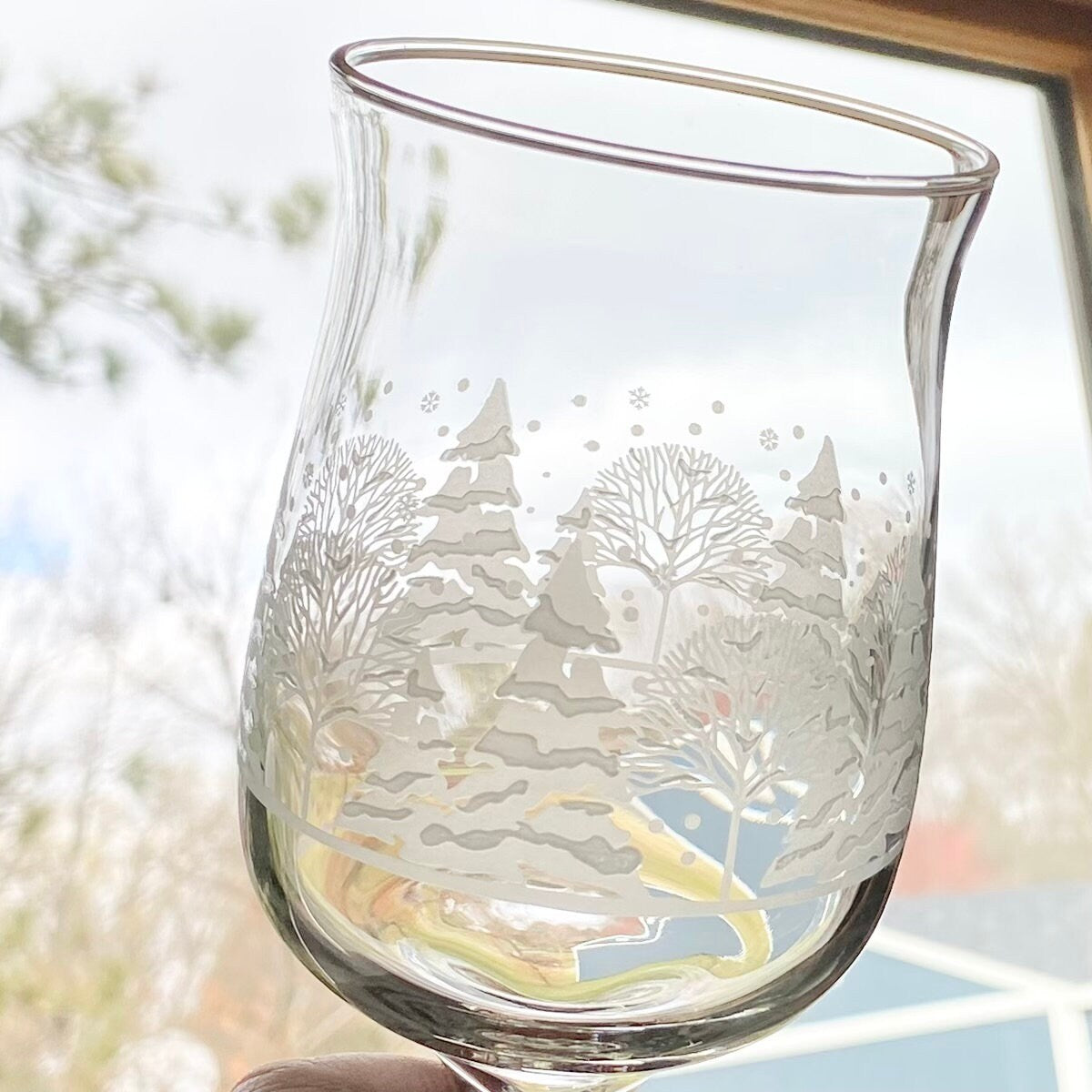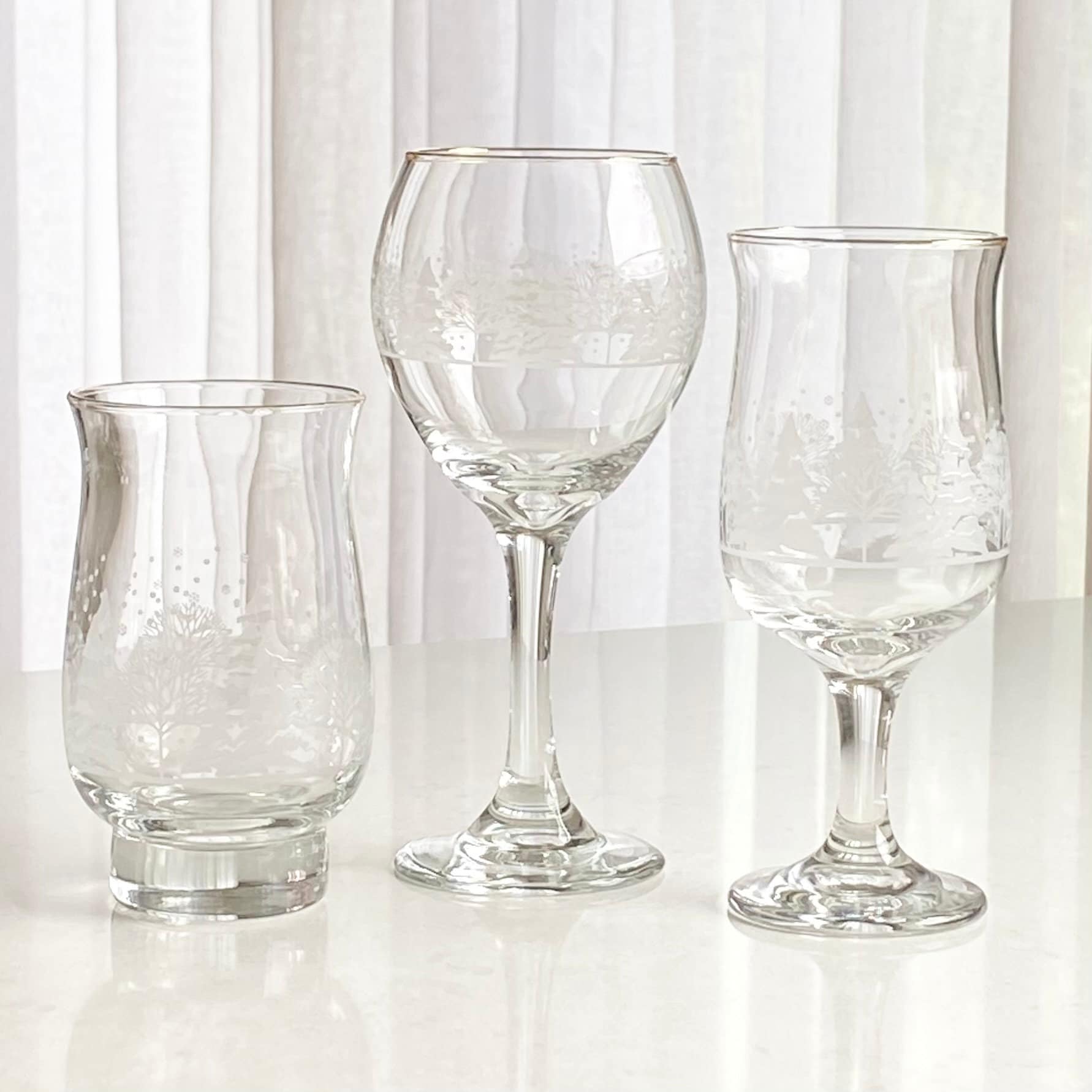 Festive glasses with a festive snowy landscape and tree motif. There are 18 available. Using the menu you can choose a set of 8, a set of 10, or get all 18 at a discount. Approximately 7" tall and 2-3/4" across the rim with a capacity of about 12 ounces completely full. Excellent vintage condition. There are two other styles of these glasses available as shown in the last photo and listed separately. Free shipping in the continental U.S. included in the price. If you are outside of this area please contact me for options. Any props used or other items shown are for photo purposes only and are not included with the items being sold.