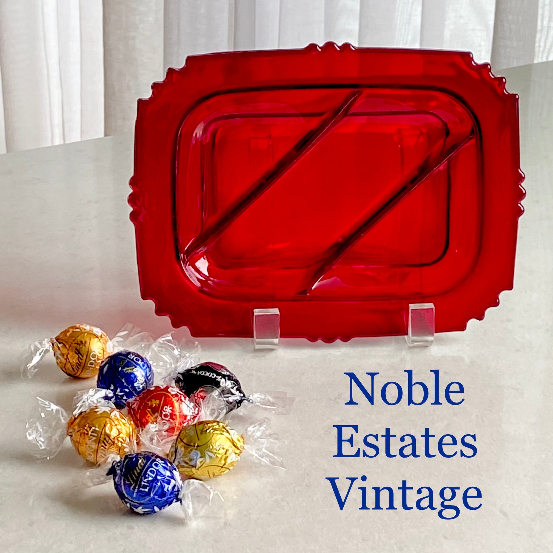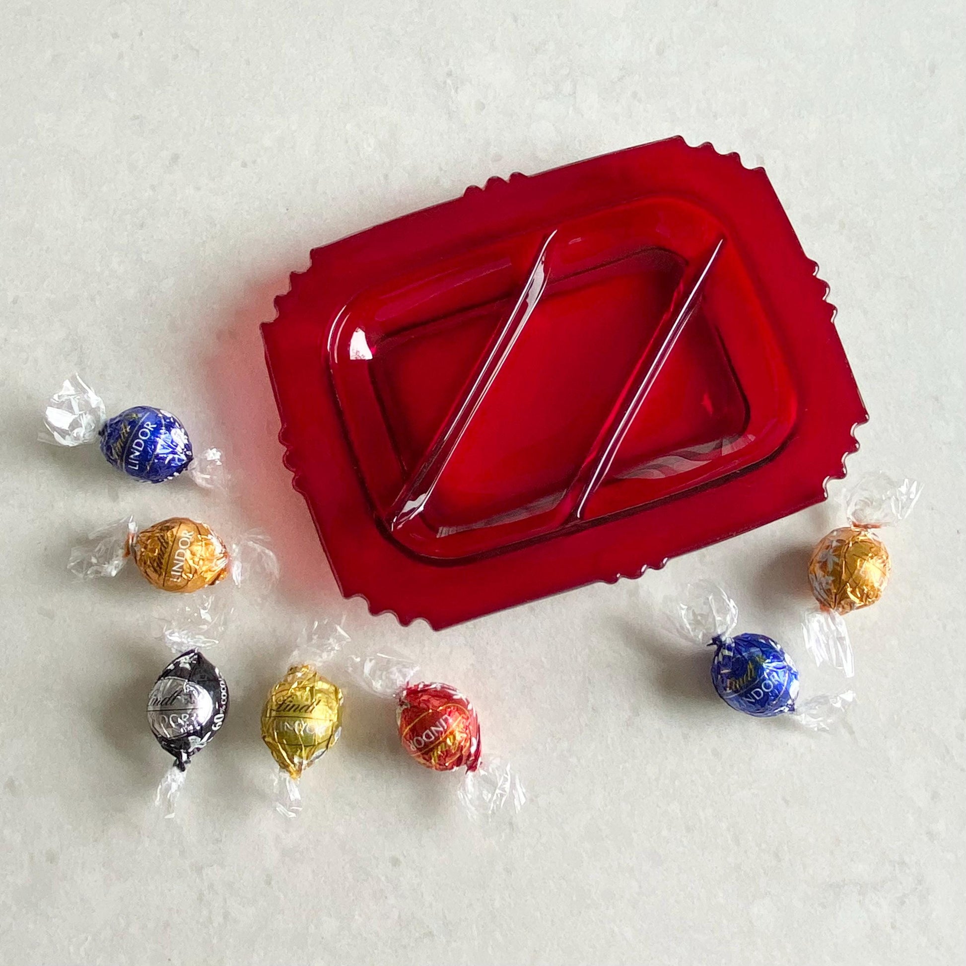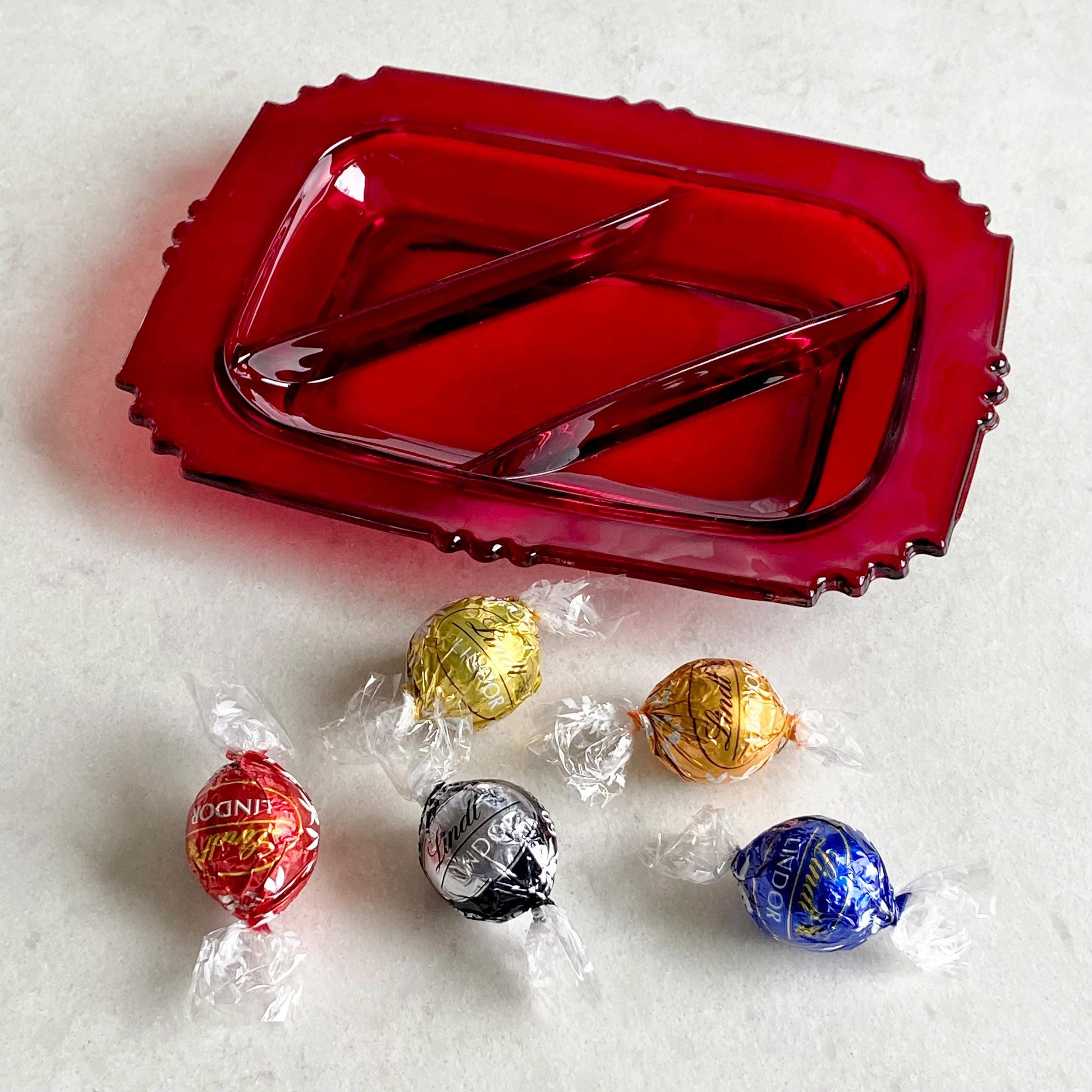 Beautiful three part serving dish in vibrant ruby red.
