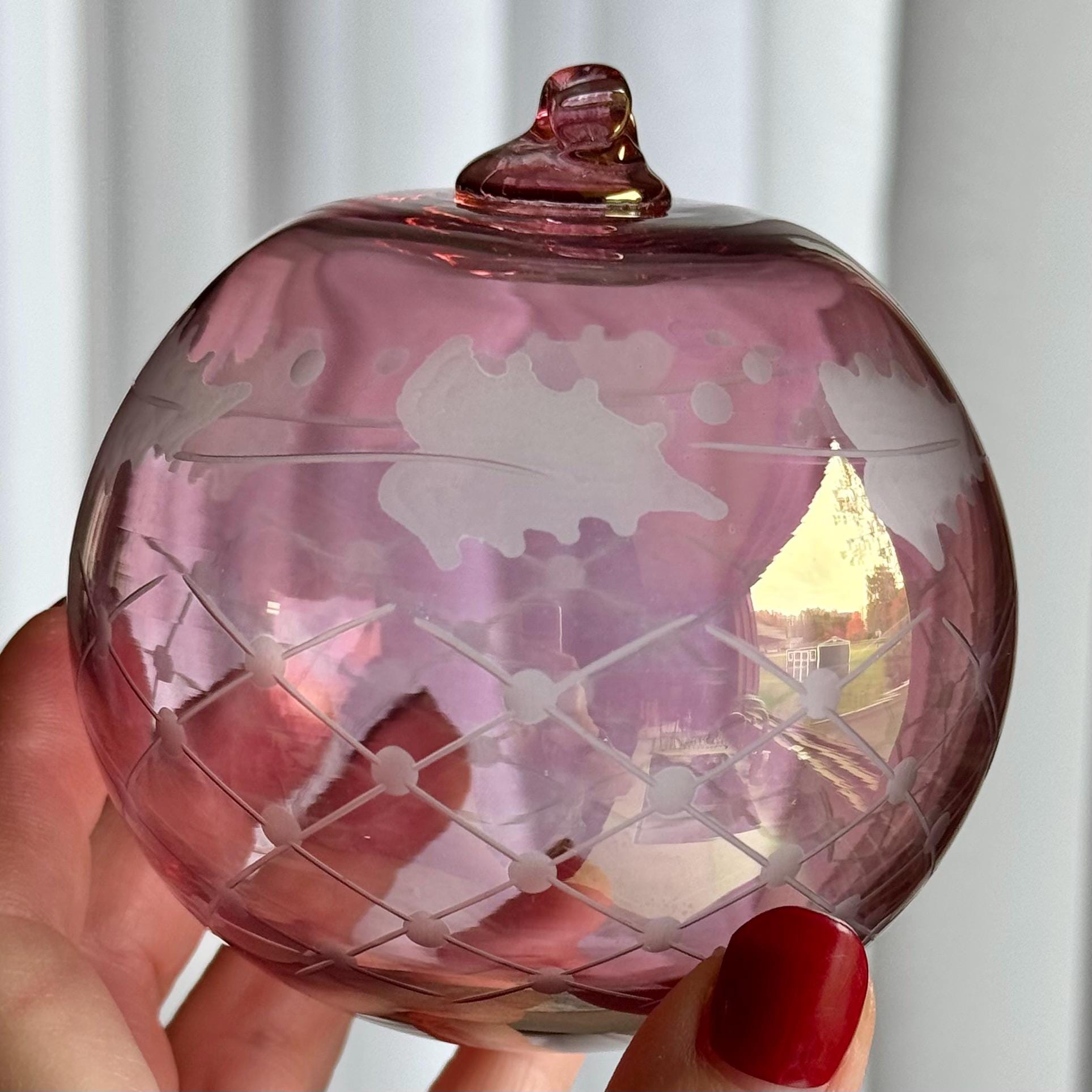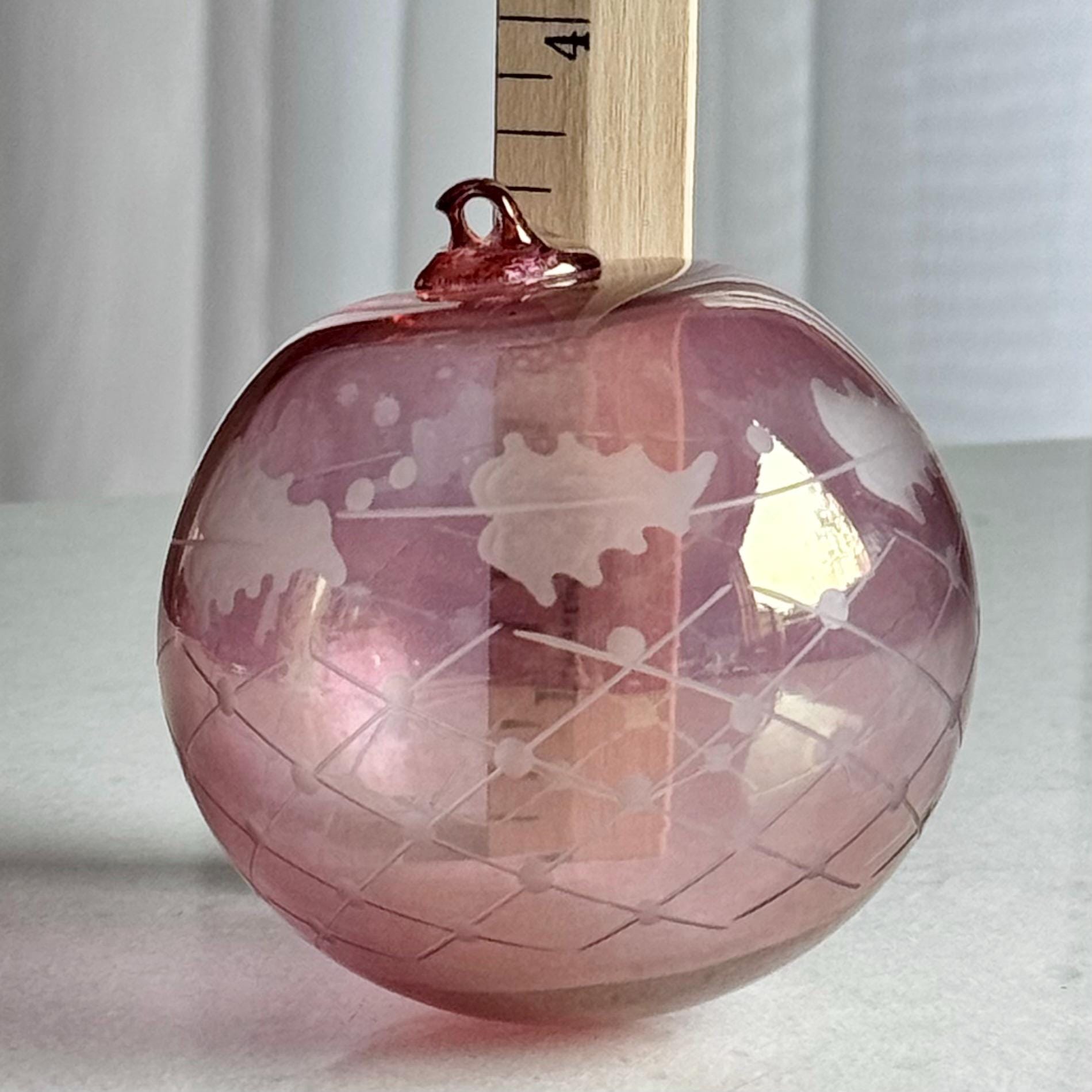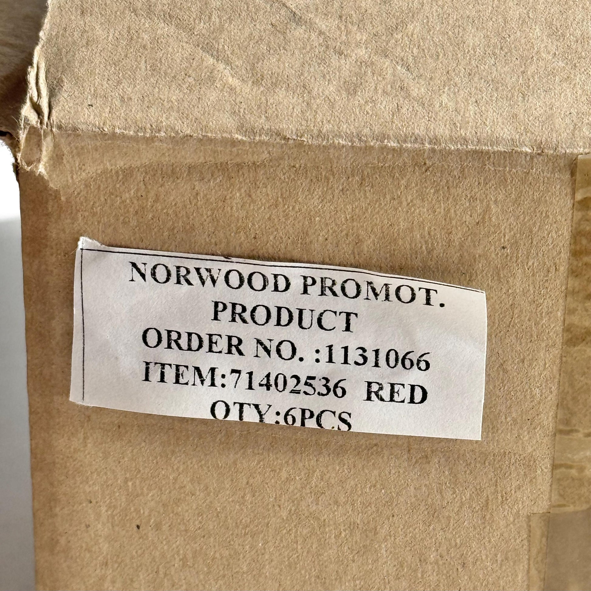 Set of six Norwood glass ornaments. The pieces have a lovely design and are cranberry in color, with variations among the pieces.