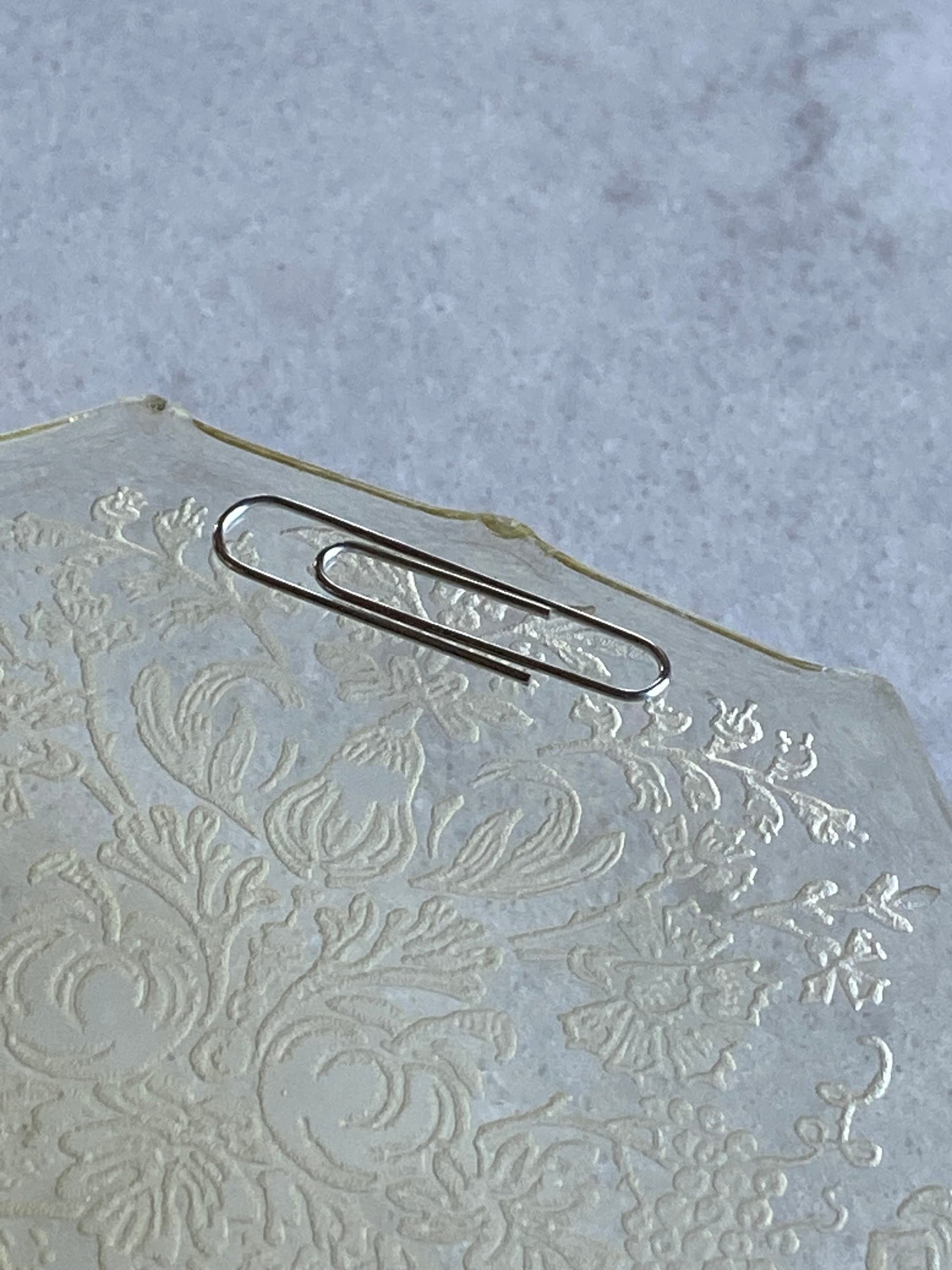 Approximately 9-3/4" across. Please see the last photo of the underneath of one corner. This piece has light vintage wear and I have tried to price it accordingly.
