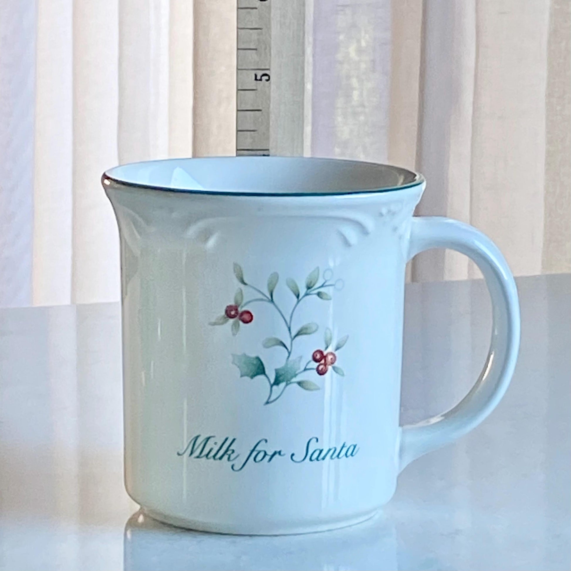 Milk for Santa Cup - approximately 3-7/8” tall and 3-5/8” across the rim with a capacity of about 13 ounces completely full