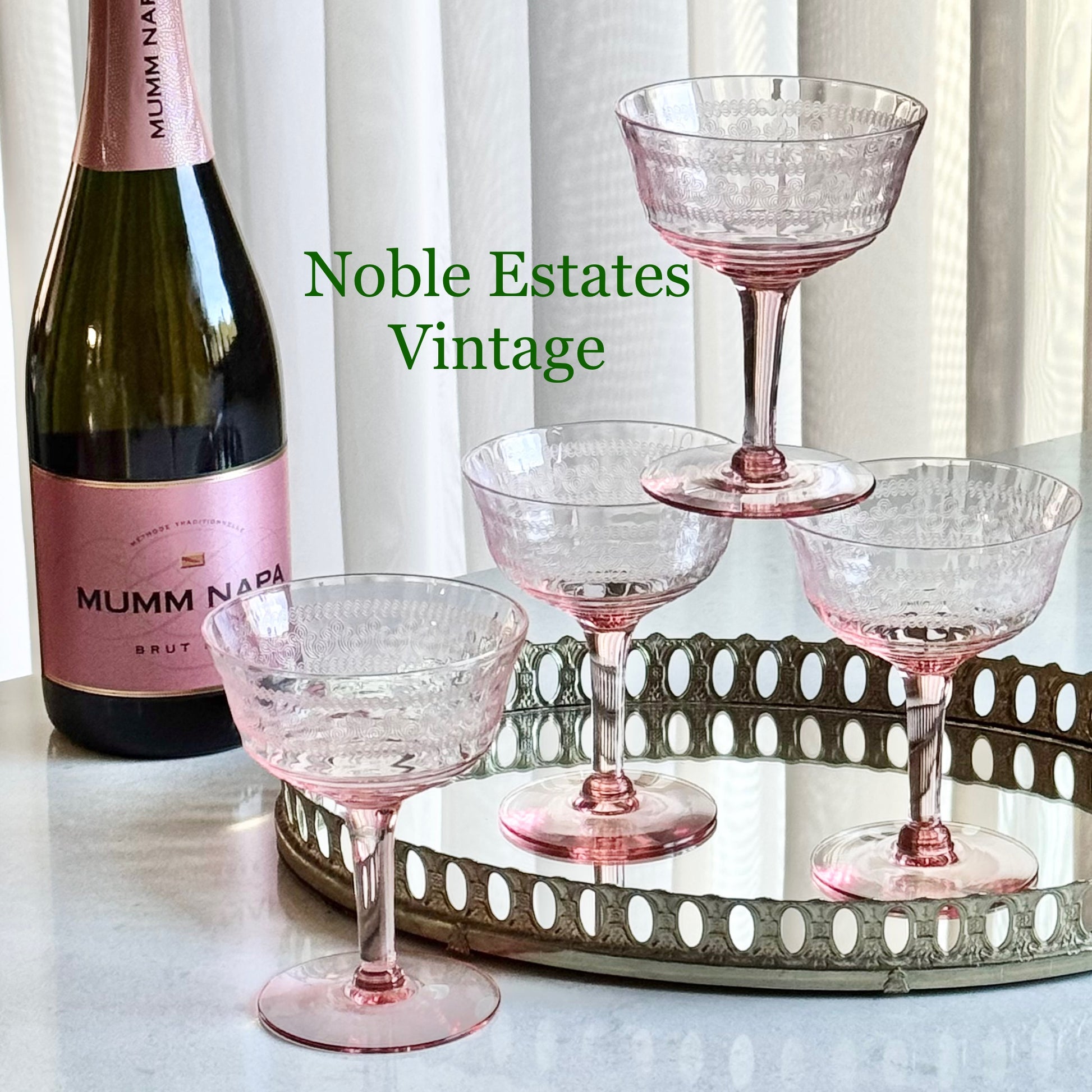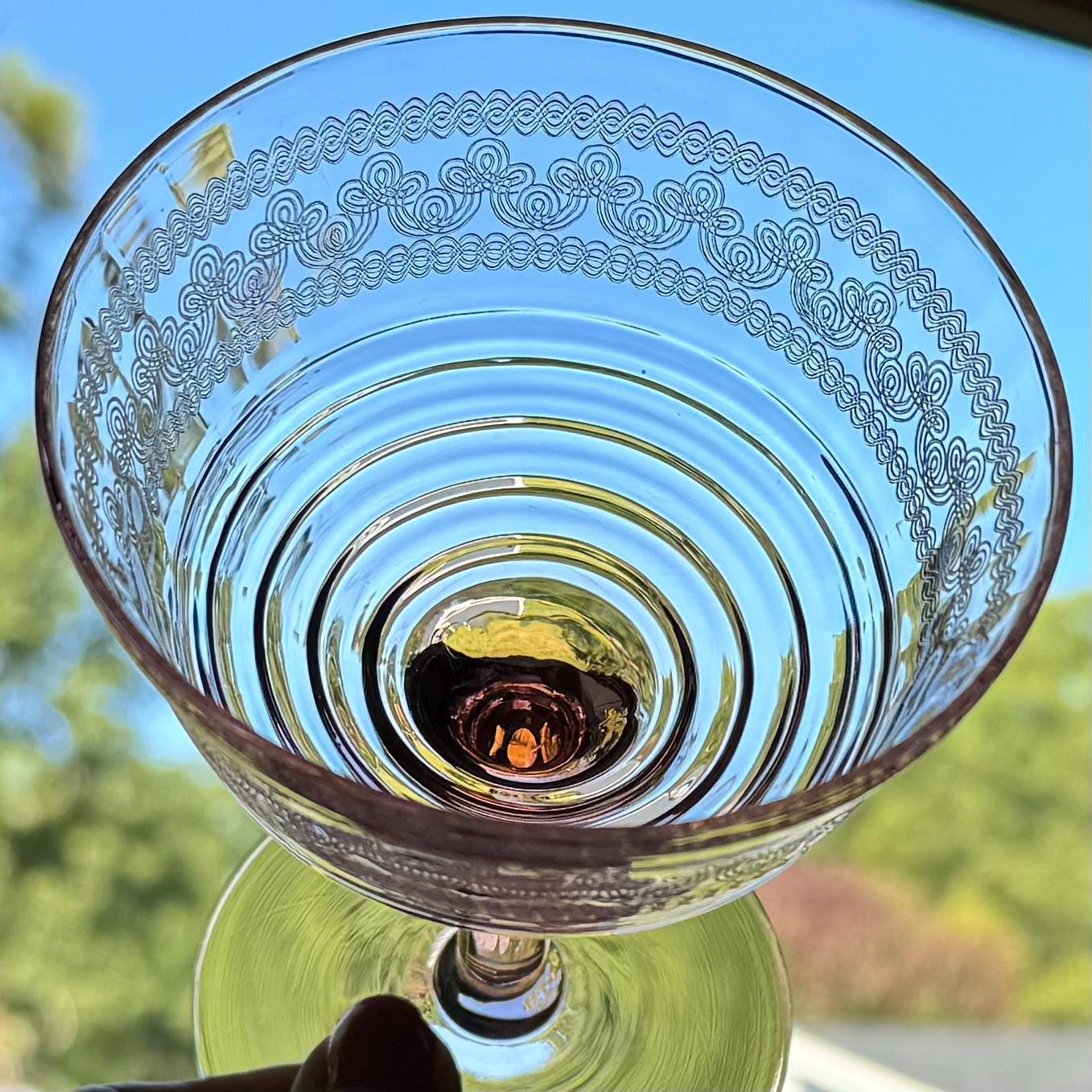 Set of set of four glasses with lovely etching and optic ribbed bowls. Approximately 4-5/8" tall and 3-5/8" across the rims with a capacity of about 6 ounces completely full. There are air bubbles, variations in the etching, and one glass has an imperfection in the rim that I believe is from the manufacturing process, as shown in the close up photo. There is a larger size of these glasses with this same etch pattern also available as shown in the last photo and listed separately. FREE SHIPPING in the continental U.S. included in the price. If you are outside of this area or have a specific shipping request please contact me for options. Any props used are for photo purposes only and are not included with the items being sold.