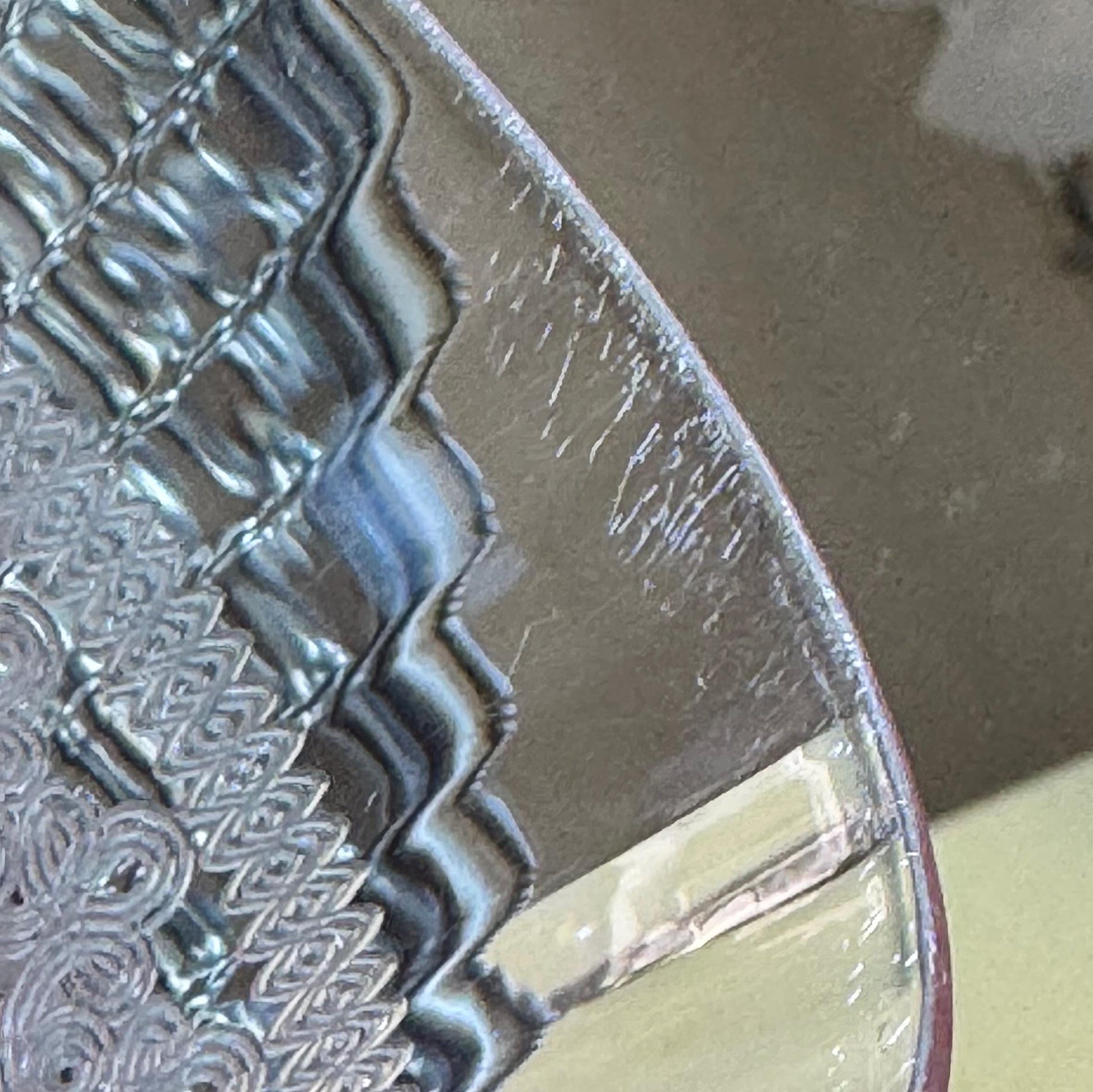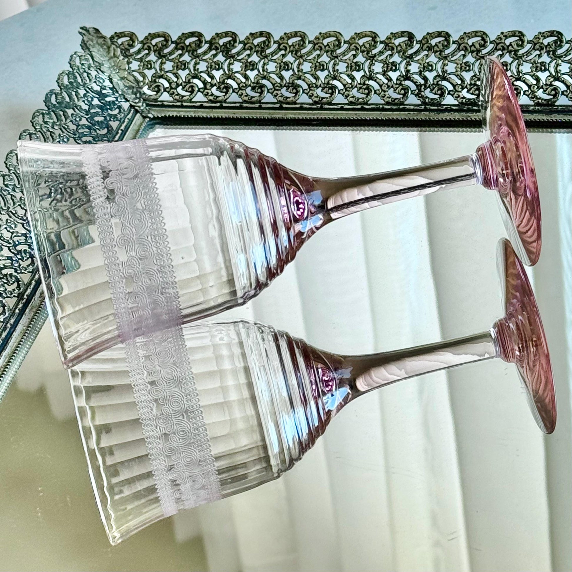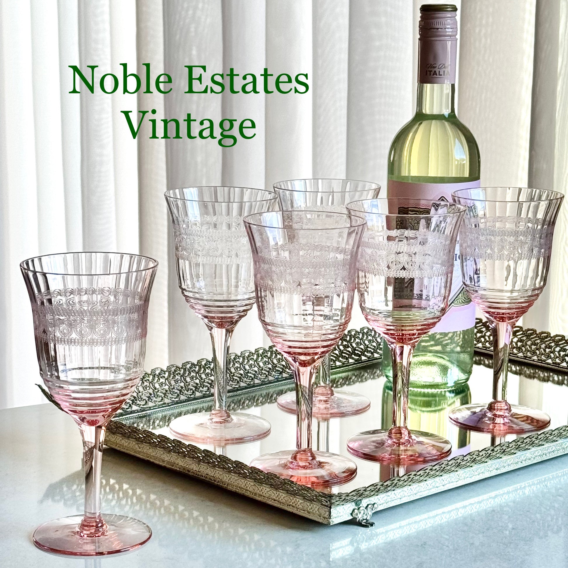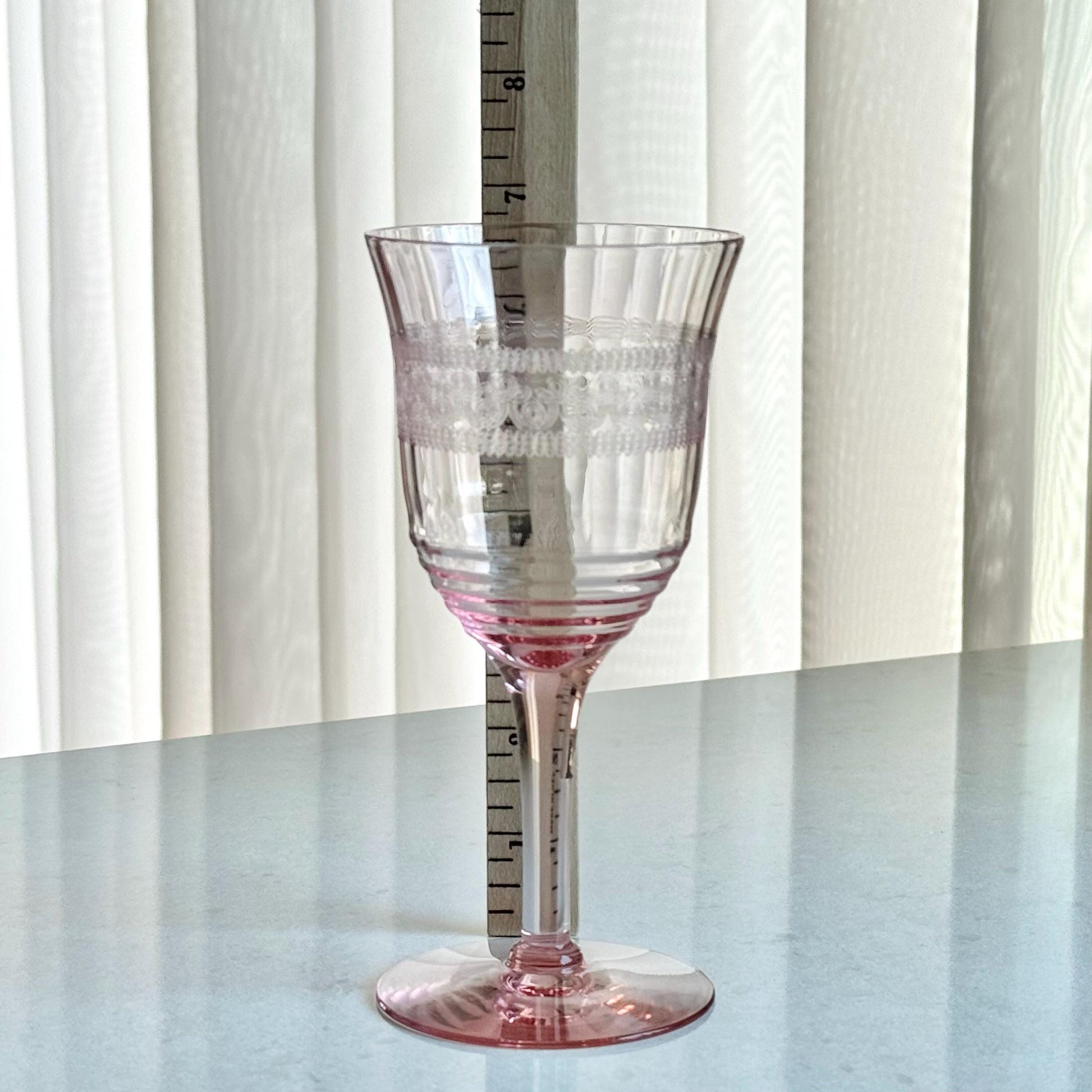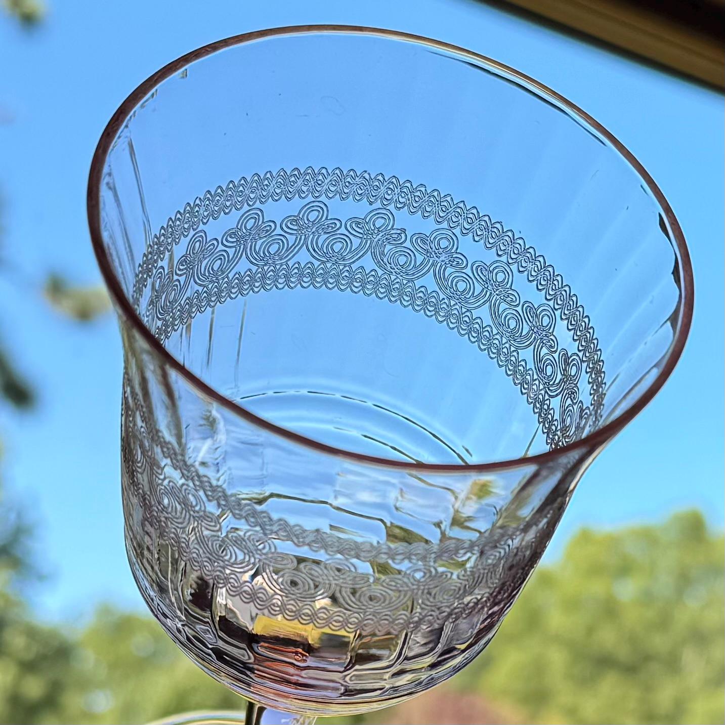 Set of set of six glasses with lovely etching and optic ribbed bowls. Approximately 6-5/8" tall and 3-1/8" across the rims with a capacity of about 8 ounces completely full. There are air bubbles, variations in the etching, and a few of the pieces have striation marks as shown in two of the close up photos, which you can if you hold them to the light or put the pieces over a darker surface. There is a smaller size of these glasses with this same etch pattern also available as shown in the last photo and listed separately. FREE SHIPPING in the continental U.S. included in the price. If you are outside of this area or have a specific shipping request please contact me for options. Any props used are for photo purposes only and are not included with the items being sold.