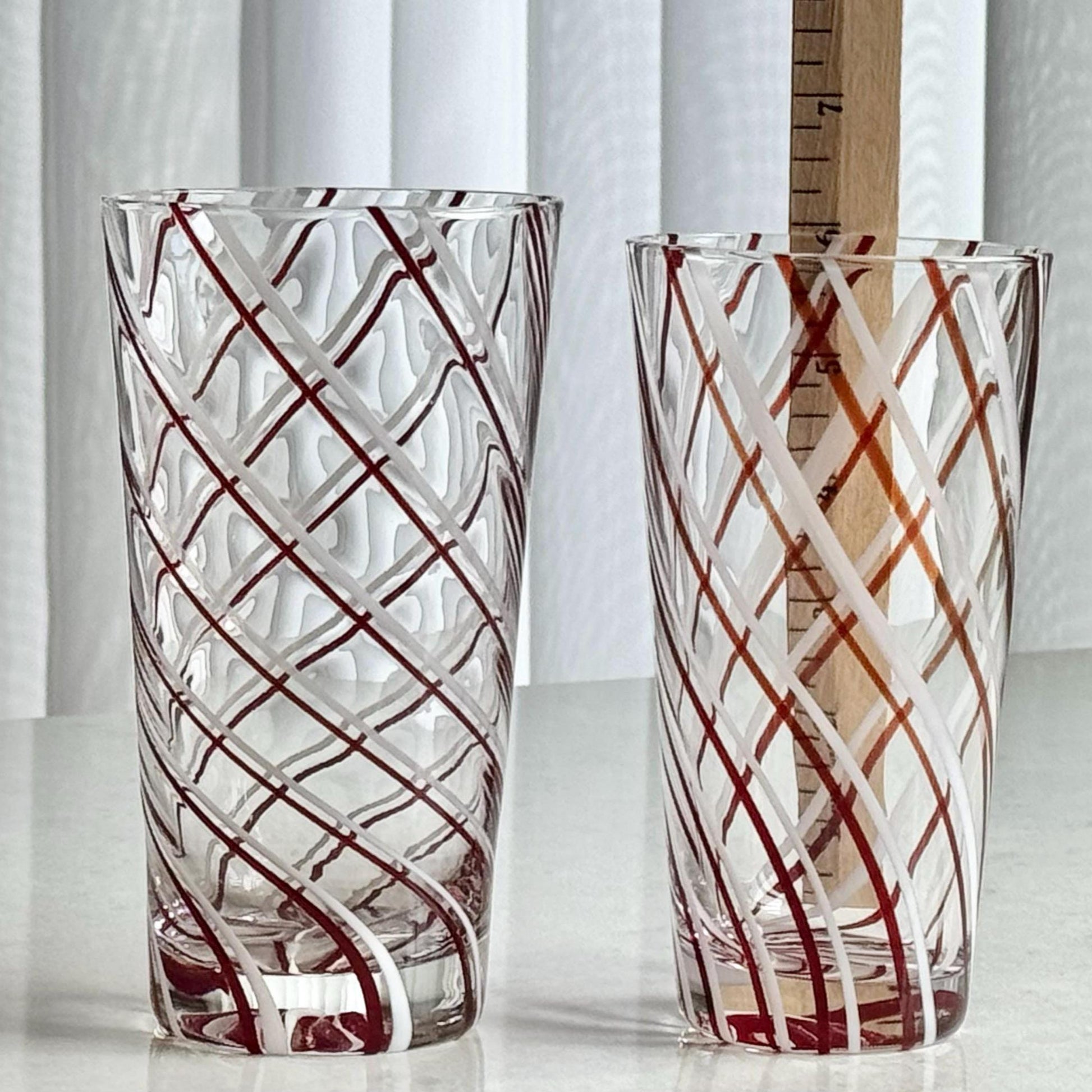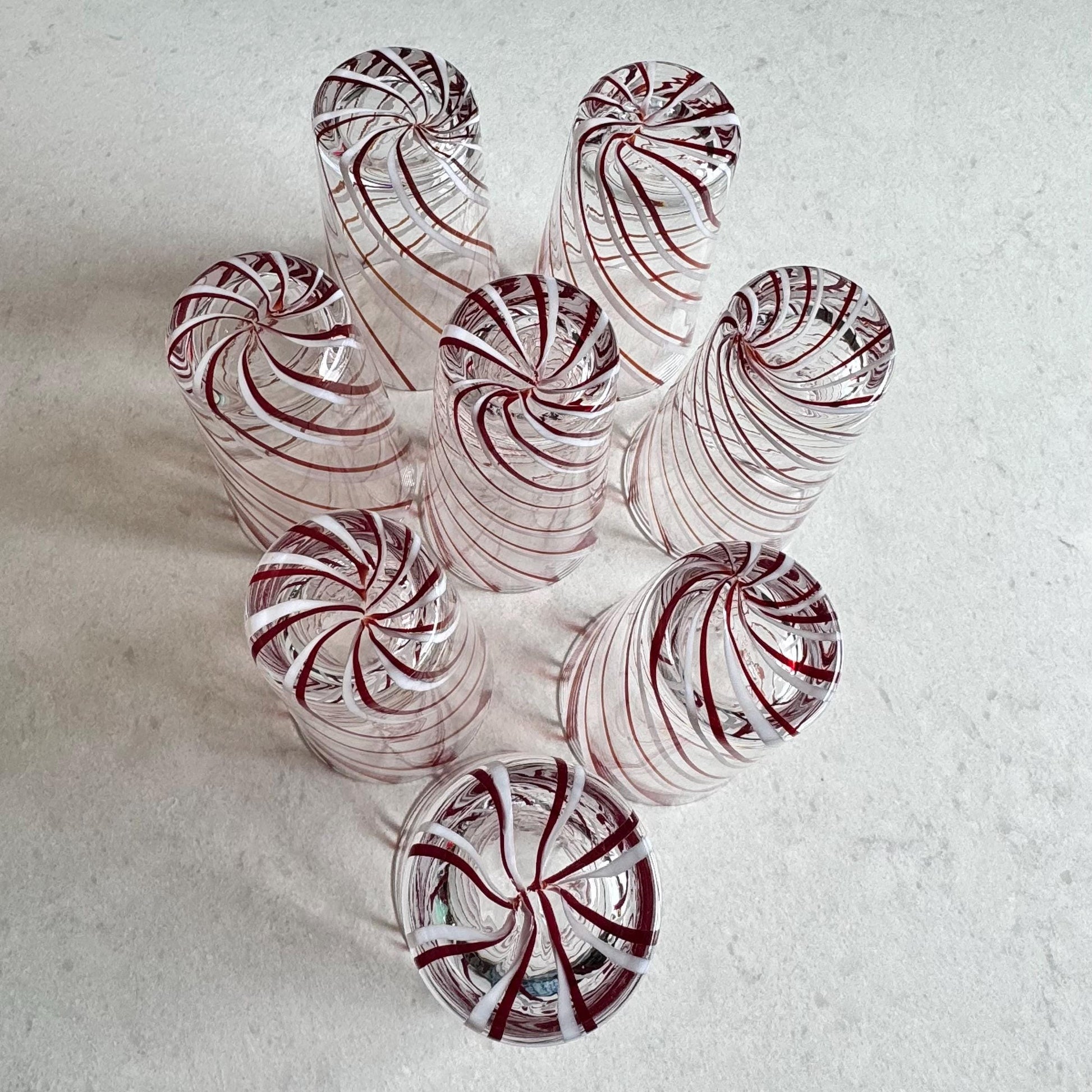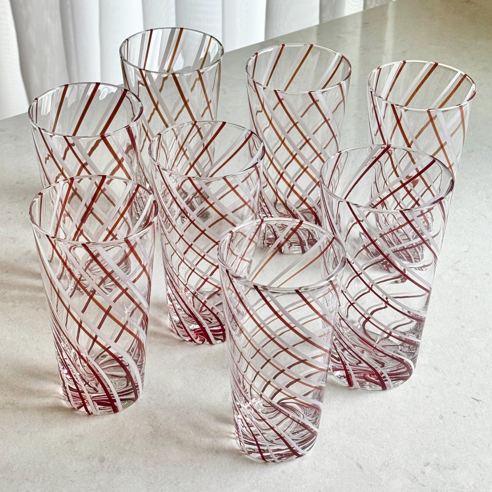 Set of eight fun glasses with a swirl! Approximately 6" tall and 3-1/8" across the rim with a capacity of about 14 ounces completely full. Note that one glass is a bit larger than the others, as shown in the photo with the ruler. Excellent vintage condition, with variations among the glasses typical of these pieces. There is another size of these glasses as shown in the last photo and listed separately. FREE SHIPPING in the continental U.S. included in the price. If you are outside of this area please contact me for options. Any props used or other items shown are for photo purposes only and are not included with the items being sold.