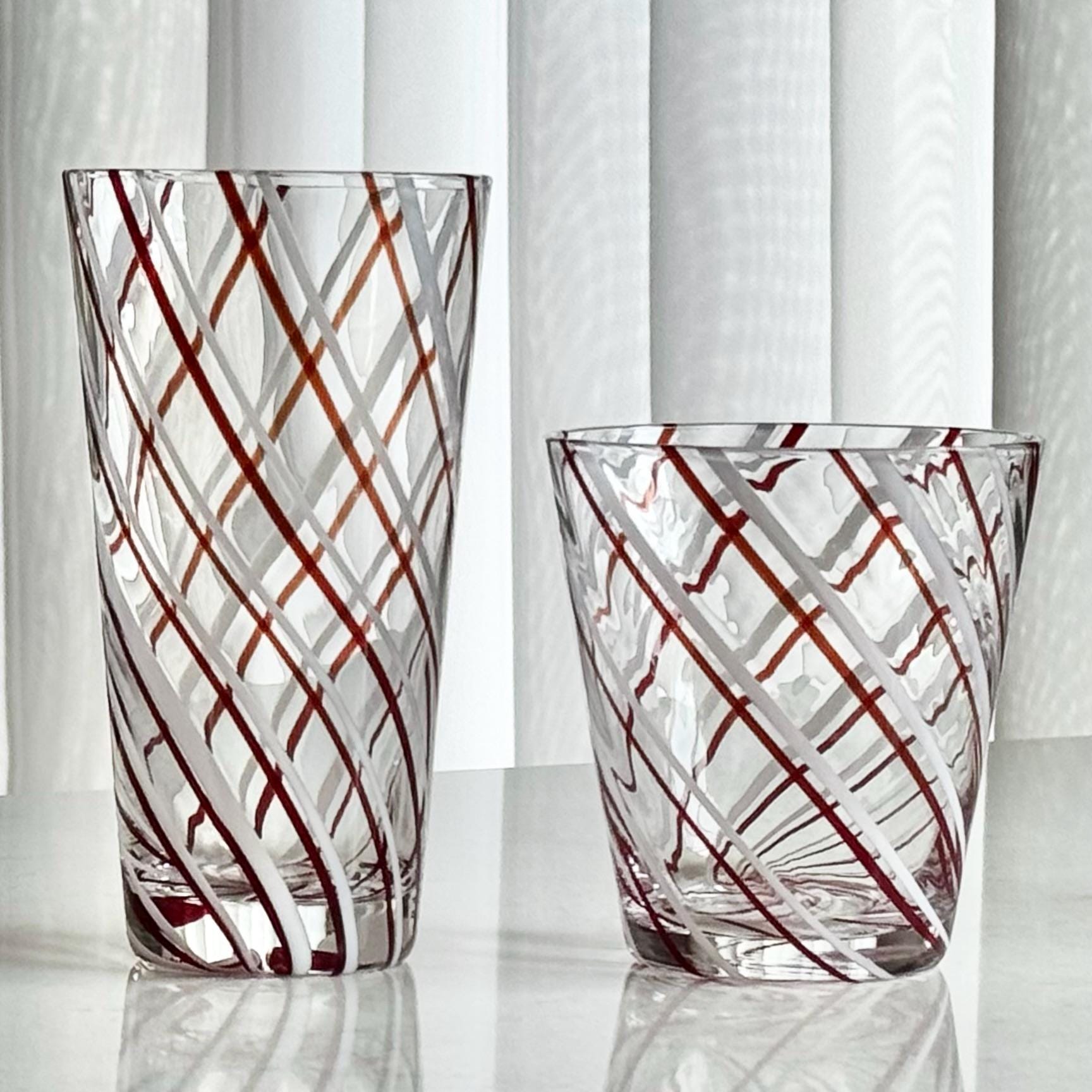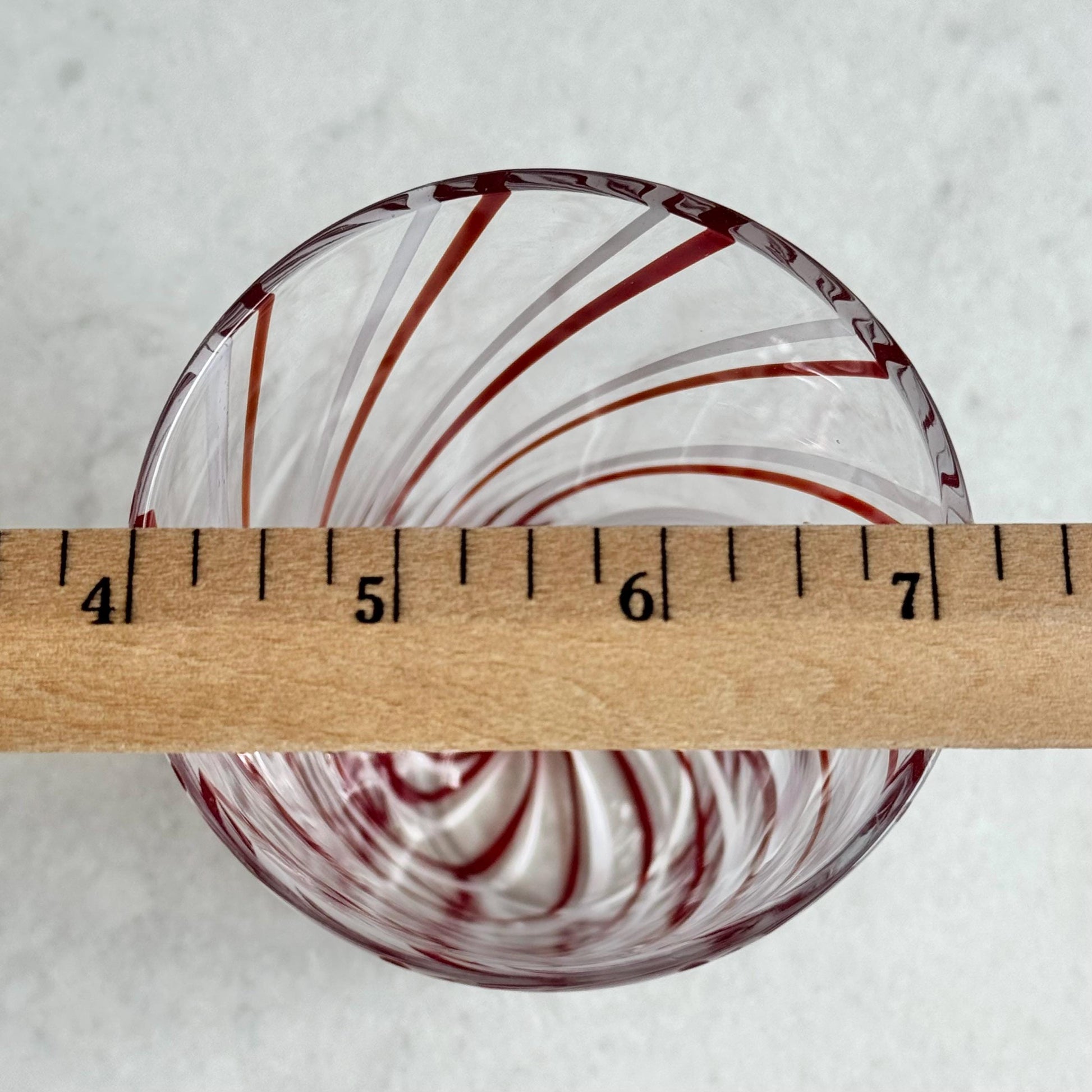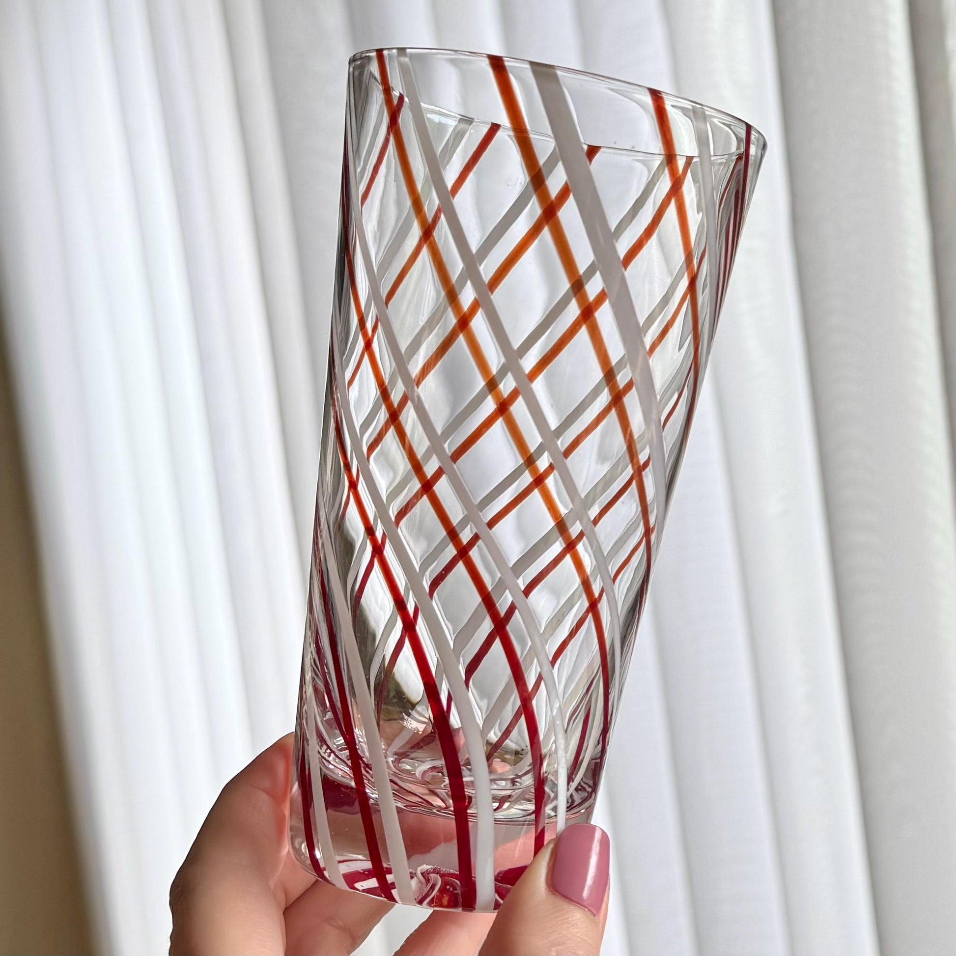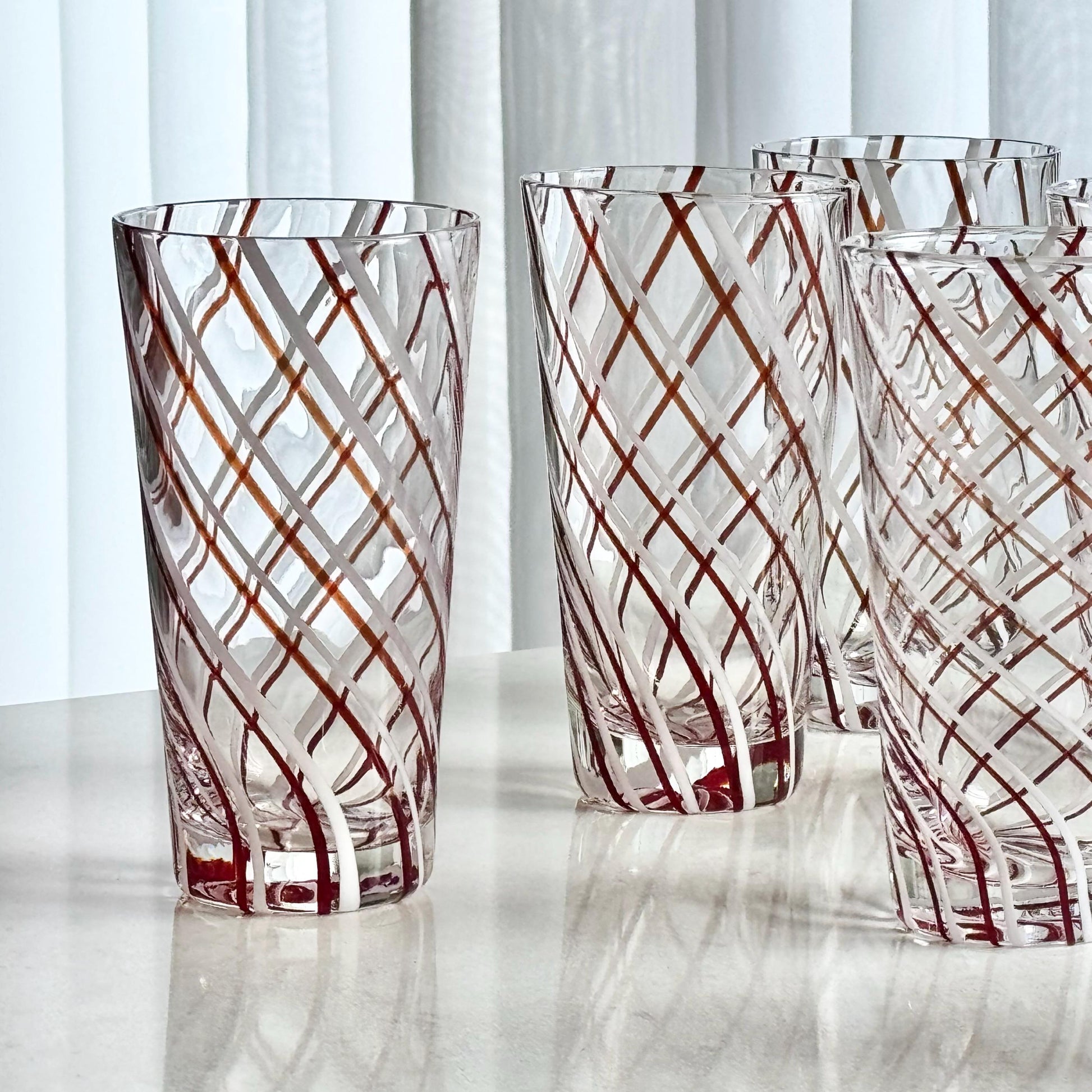 Set of eight fun glasses with a swirl! Approximately 6" tall and 3-1/8" across the rim with a capacity of about 14 ounces completely full. Note that one glass is a bit larger than the others, as shown in the photo with the ruler. Excellent vintage condition, with variations among the glasses typical of these pieces. There is another size of these glasses as shown in the last photo and listed separately. FREE SHIPPING in the continental U.S. included in the price. If you are outside of this area please contact me for options. Any props used or other items shown are for photo purposes only and are not included with the items being sold.