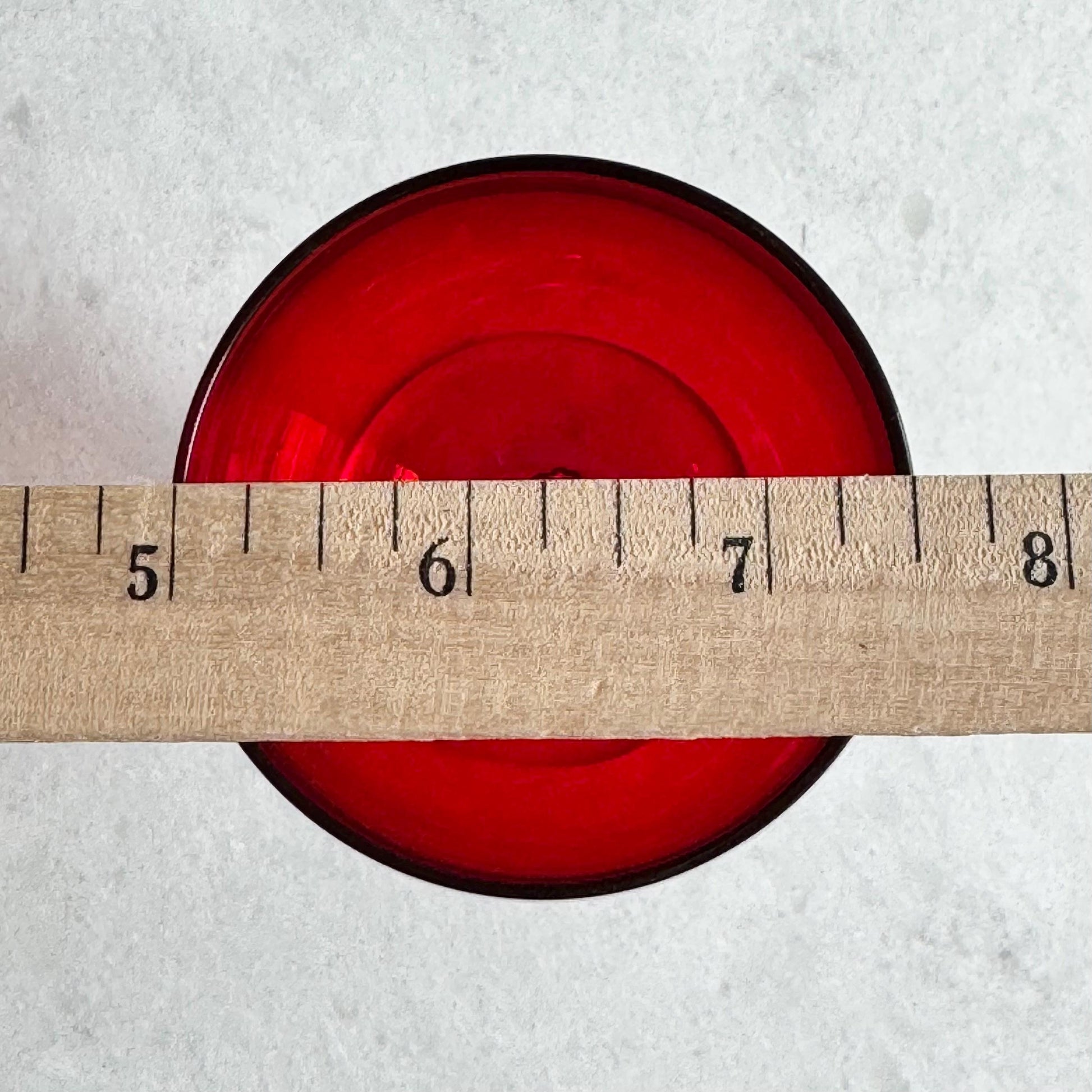 Set of six vibrant red glasses. Approximately 5-3/4" tall and 2-1/2" across the rim with a capacity of about 9 ounces completely full. Excellent vintage condition, with variations among the glasses as is typical with these pieces. There is another style of these glasses available as shown in the last photo. FREE SHIPPING in the continental U.S. included in the price. If you are outside of this area or have a specific shipping request please contact me for options. Any props used are for photo purposes only and are not included with the items being sold.
