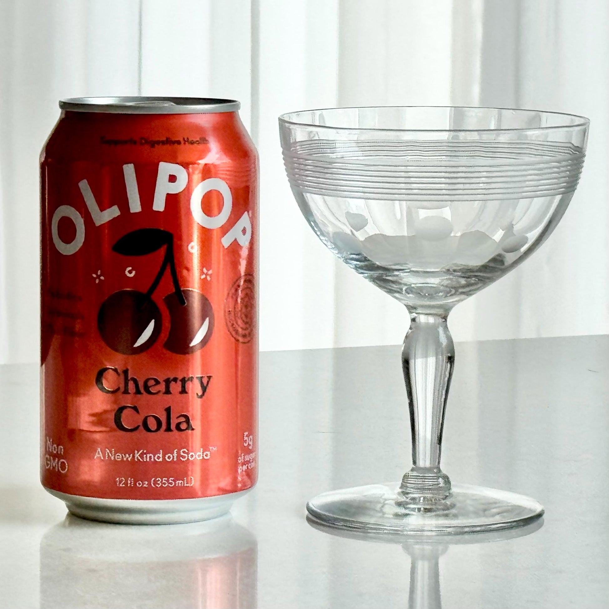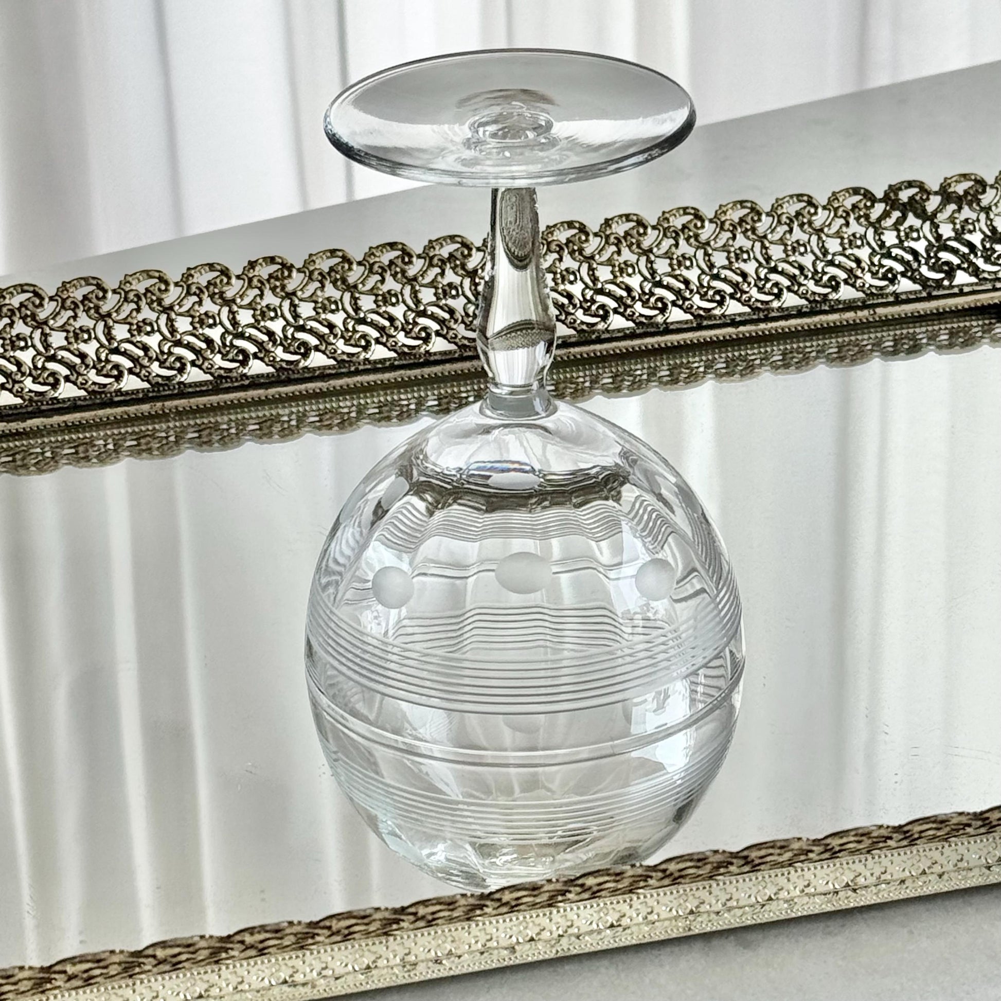 Set of seven glasses with a fun dot and band pattern on the optic ribbed bowl. Perfect for cocktails, champagne, or as sherbet cups.