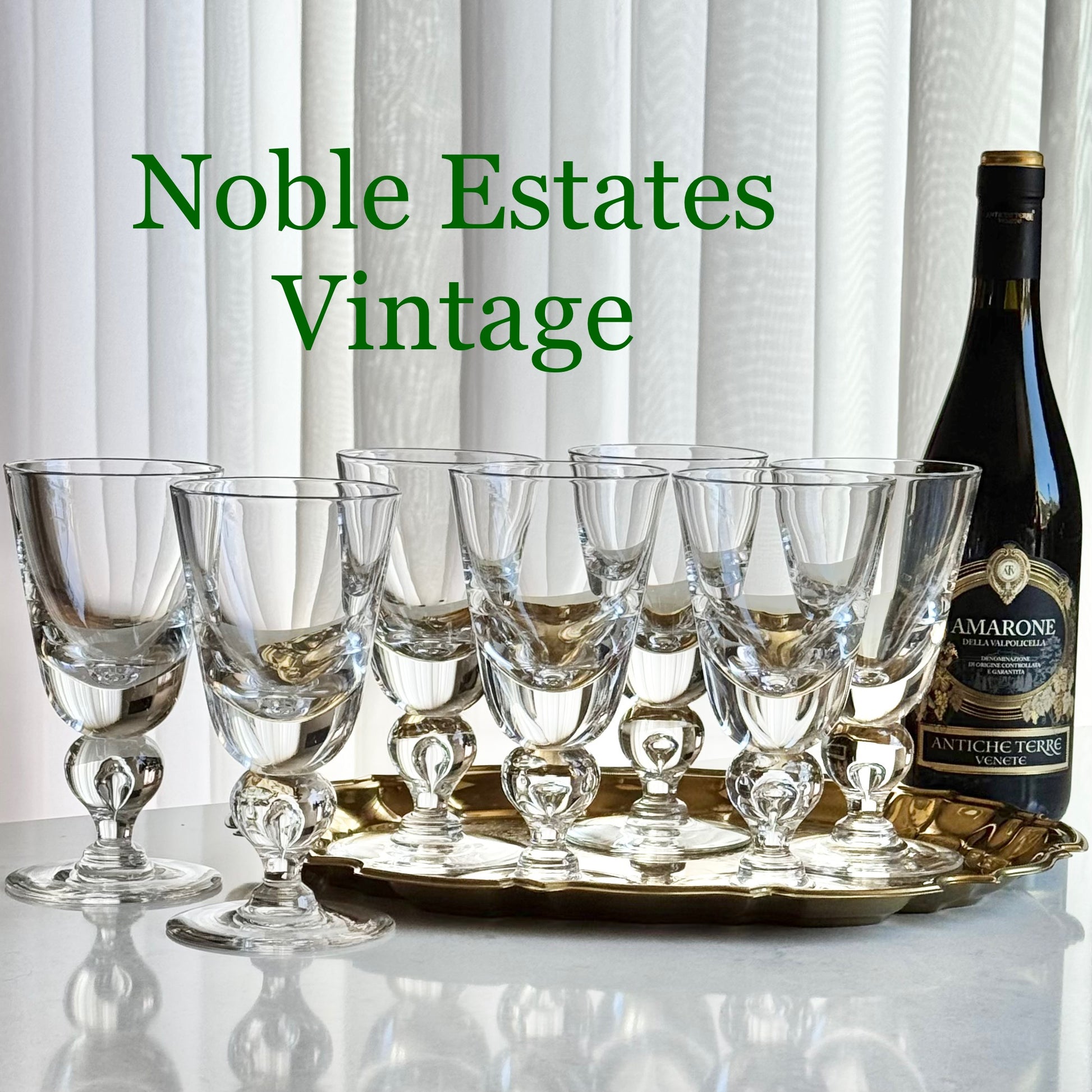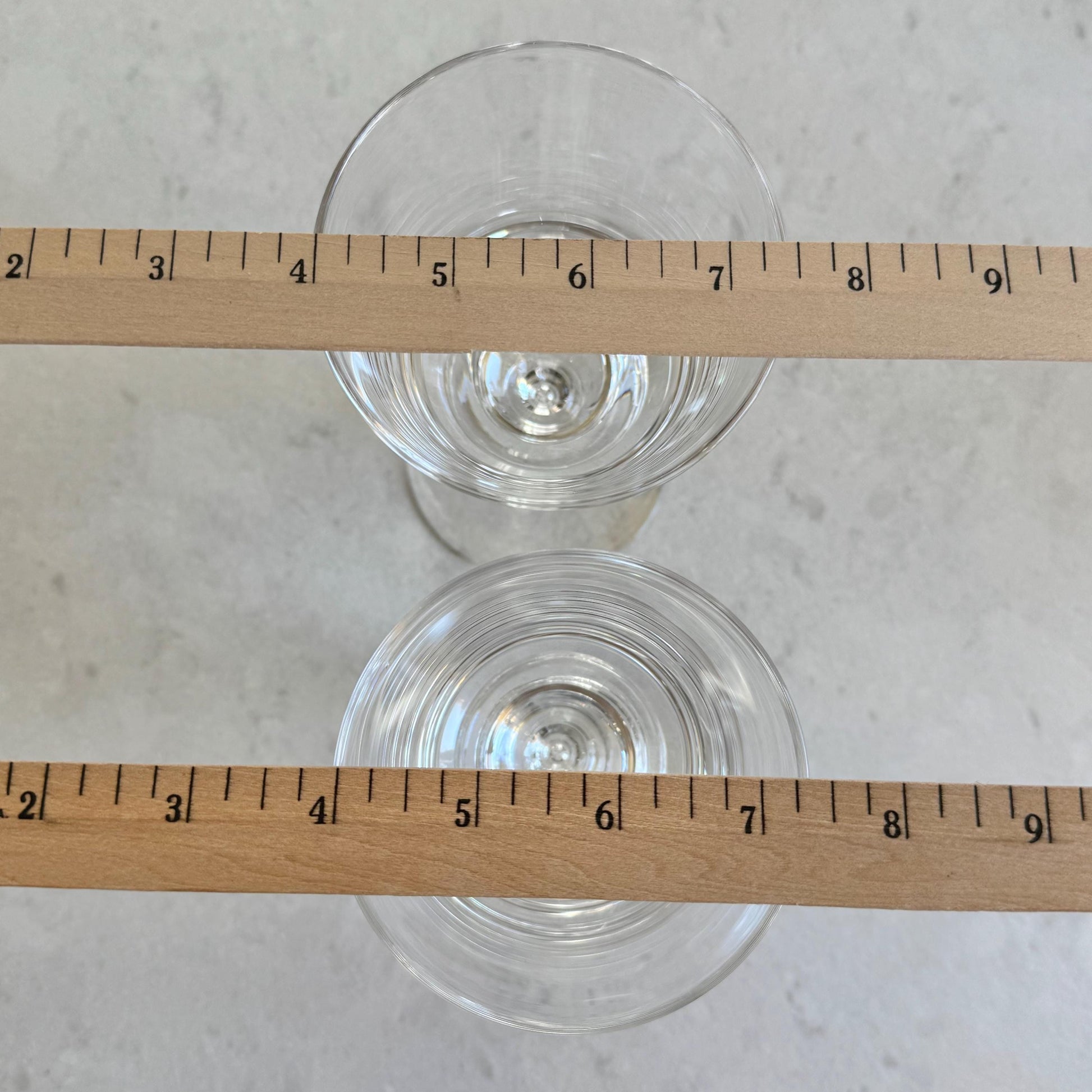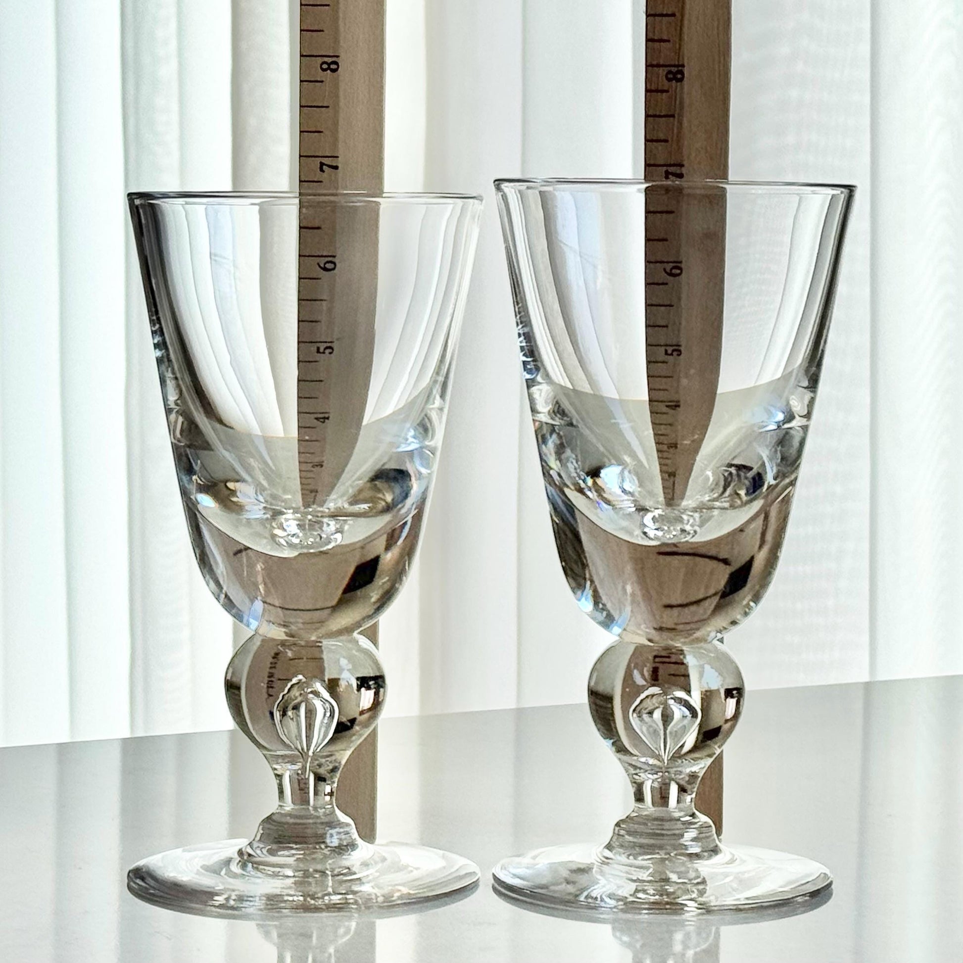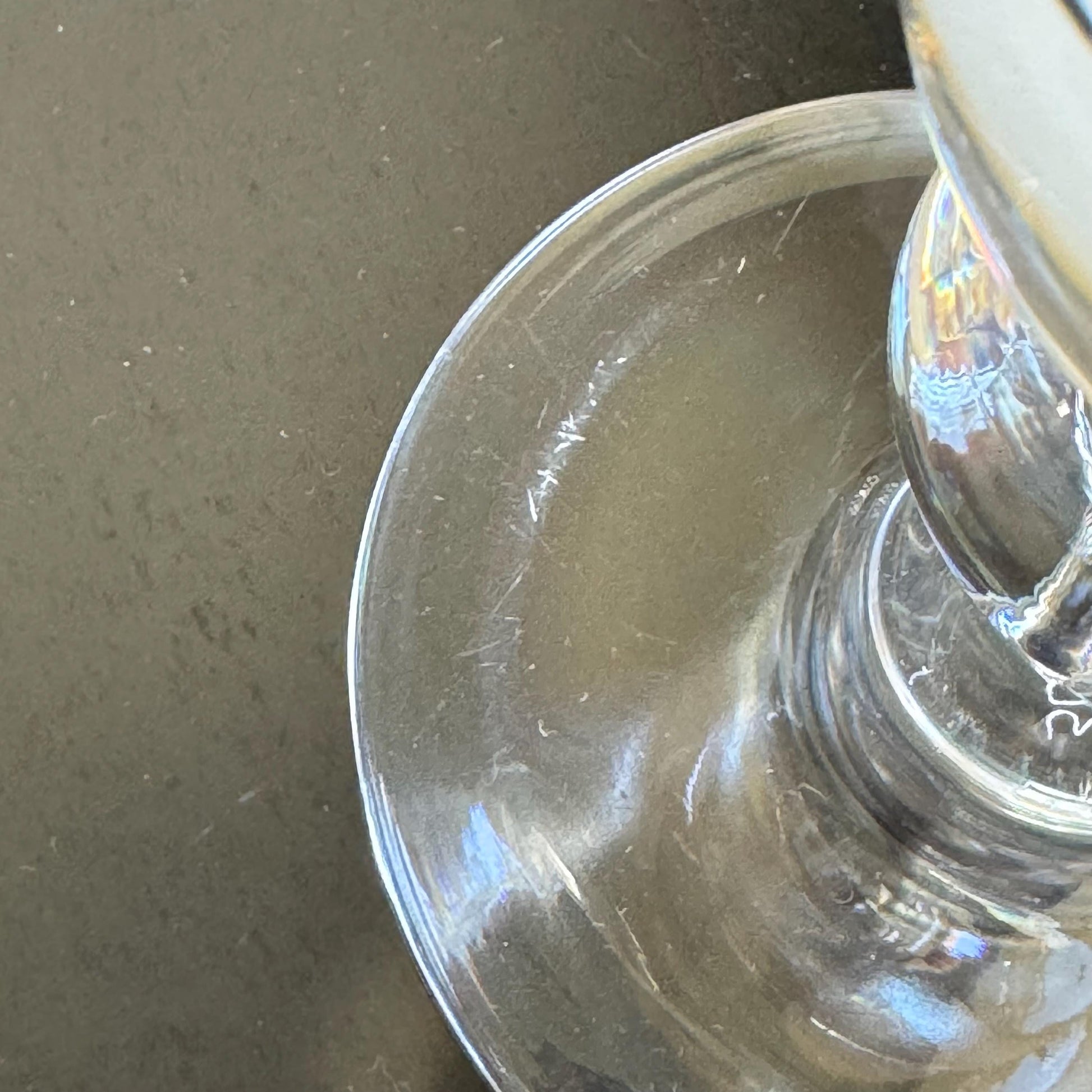 Set of seven gorgeous pieces, all signed. The pieces vary in size, approximately 6-5/8" to 6-7/8" tall and 3-3/8" across the rim, with a capacity of about 8 ounces completely full. I have shown the largest and smallest of the glasses side by side in some of the photos, and the others fall in between in height. One glass has a thinner weighed bowl where it meets the stem than the other six, as shown in the photos. Some of the glasses have a white ring on the underneath of the foot that you can see if you hold the glass over a dark surface, an example of which is shown in one of the photos. There is a tiny closed air bubble on the rim of one glass that you can feel with your fingernail; see the close up photo. There are also coupes available, as shown in the last photo and listed separately. FREE SHIPPING in the continental U.S. included in the price. If you are outside of this area or have a specific shipping request please contact me for options. Any props used or other items shown are for photo purposes only and are not included with the items being sold in this listing. Pattern 7877.