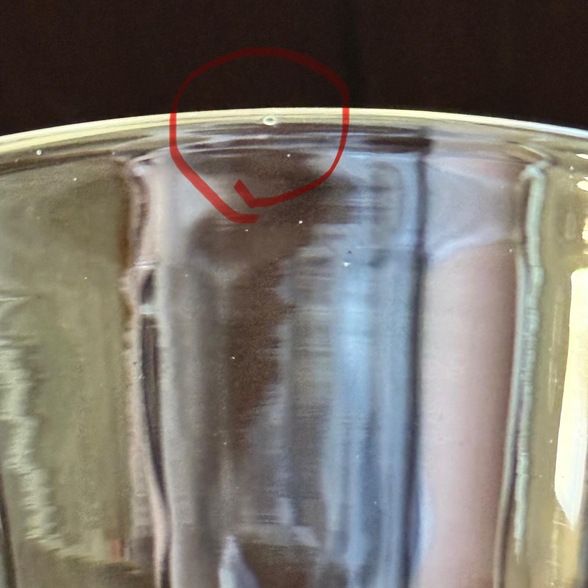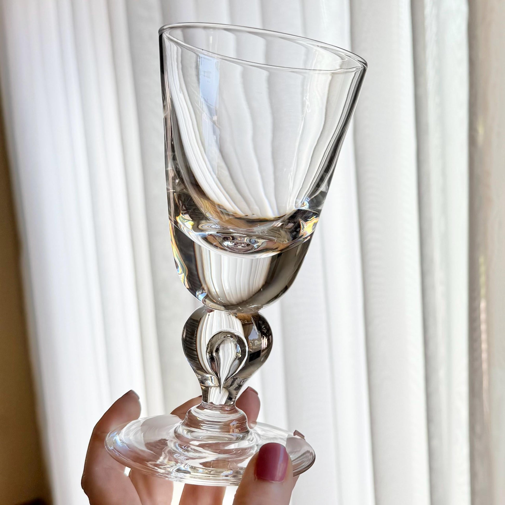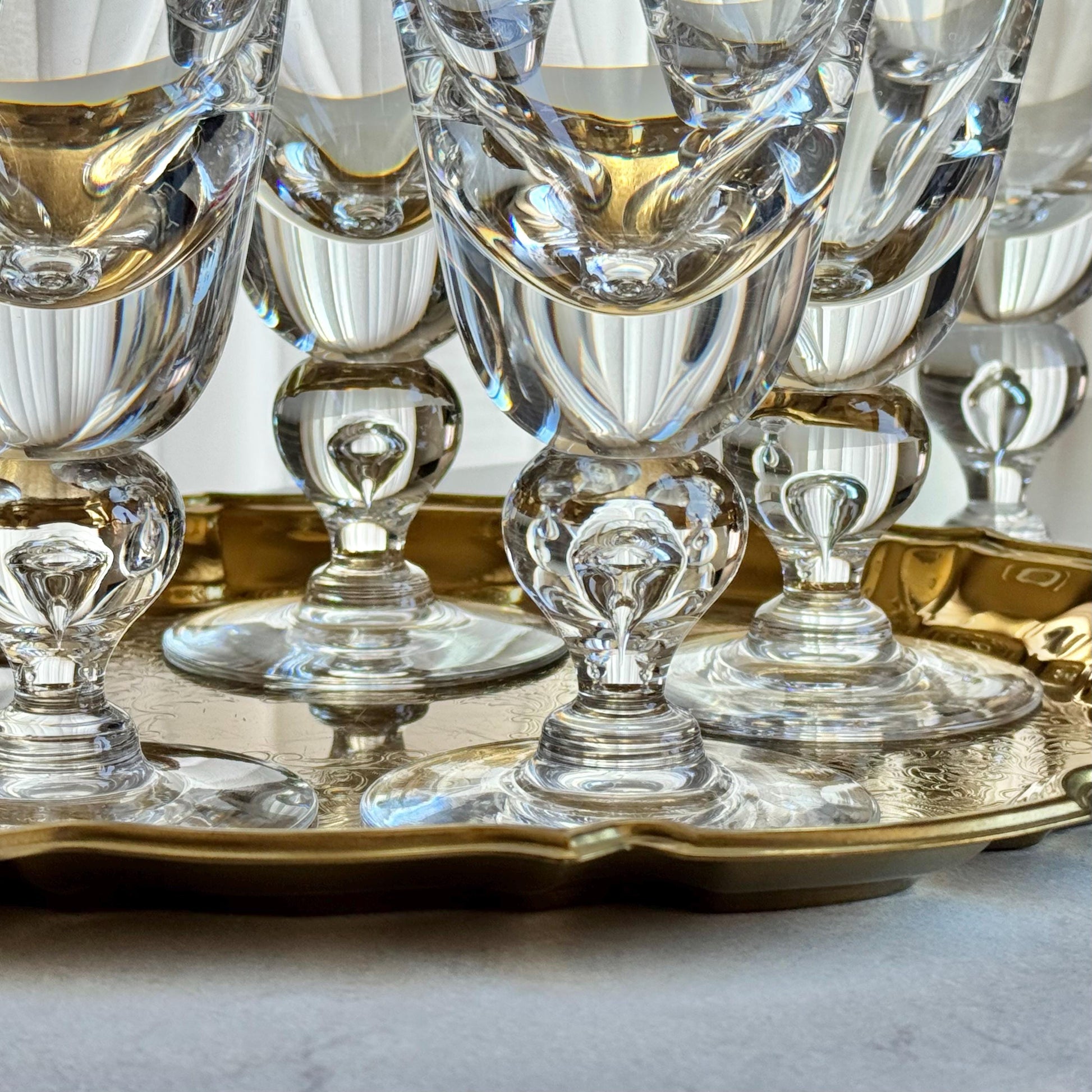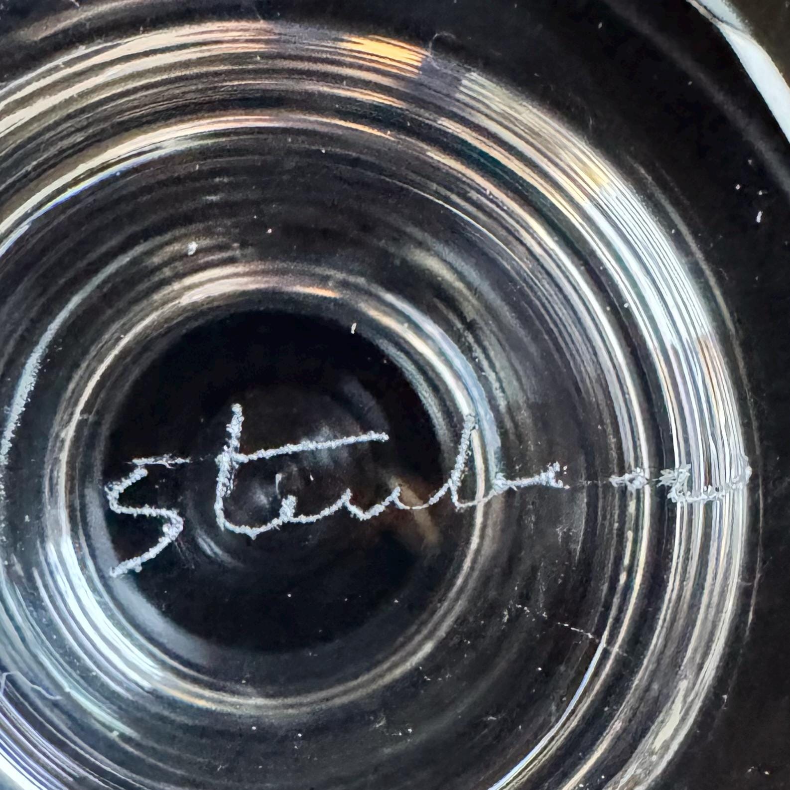 Set of seven gorgeous pieces, all signed. The pieces vary in size, approximately 6-5/8" to 6-7/8" tall and 3-3/8" across the rim, with a capacity of about 8 ounces completely full. I have shown the largest and smallest of the glasses side by side in some of the photos, and the others fall in between in height. One glass has a thinner weighed bowl where it meets the stem than the other six, as shown in the photos. Some of the glasses have a white ring on the underneath of the foot that you can see if you hold the glass over a dark surface, an example of which is shown in one of the photos. There is a tiny closed air bubble on the rim of one glass that you can feel with your fingernail; see the close up photo. There are also coupes available, as shown in the last photo and listed separately. FREE SHIPPING in the continental U.S. included in the price. If you are outside of this area or have a specific shipping request please contact me for options. Any props used or other items shown are for photo purposes only and are not included with the items being sold in this listing. Pattern 7877.